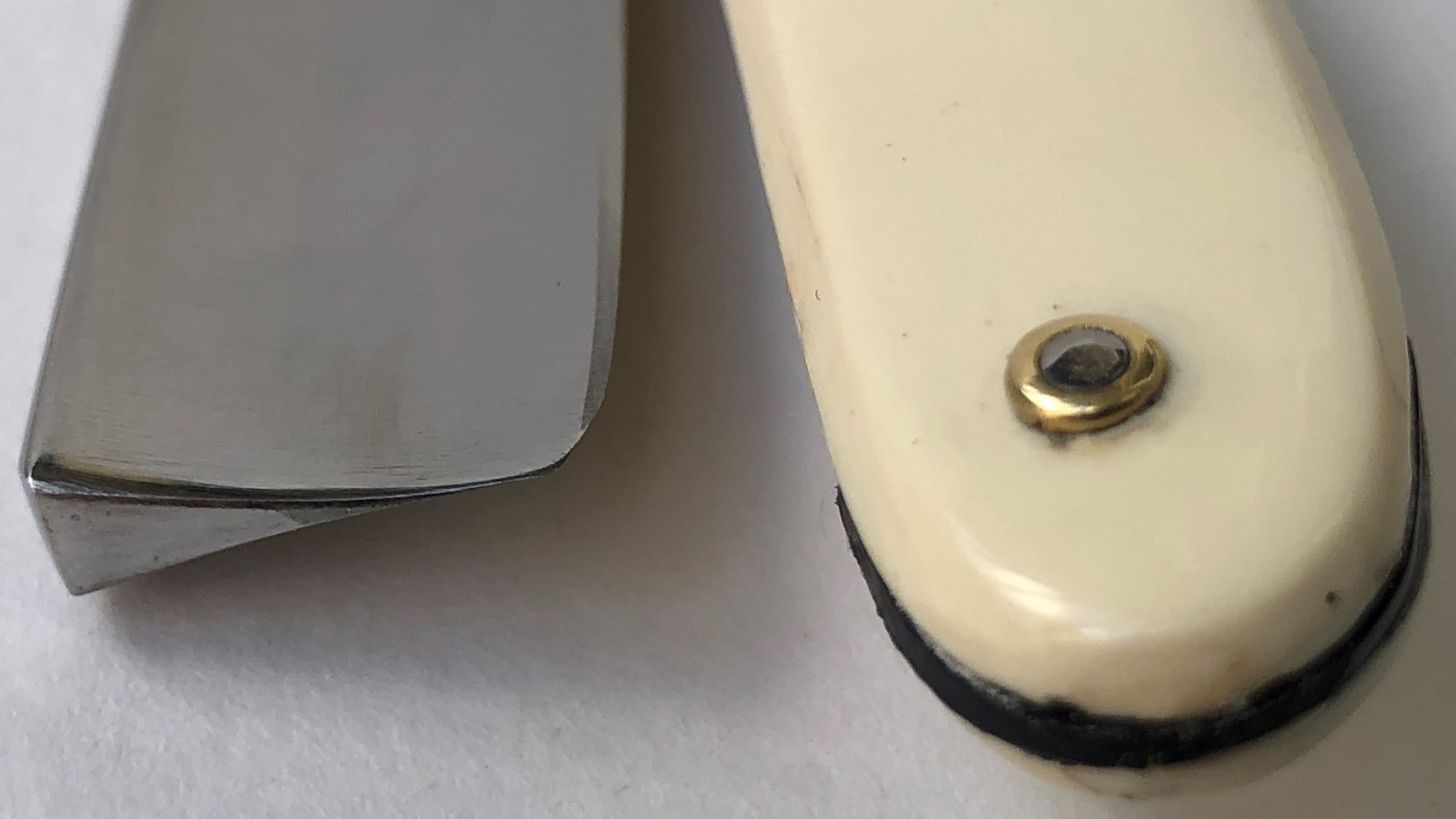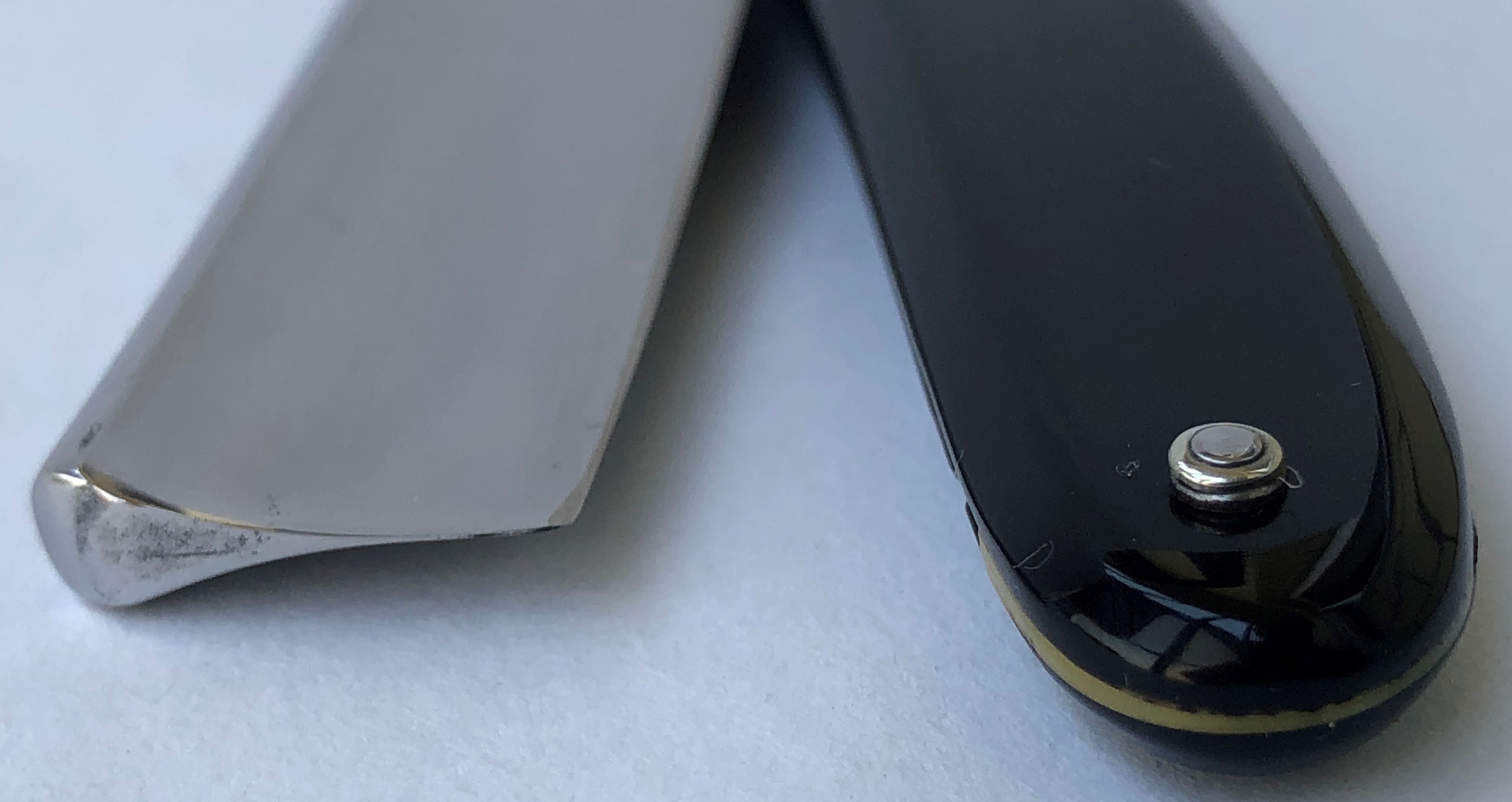 Клинок в прекрасном и малопользованном состоянии для своих лет. Бритва была разобрана, для приведения в порядок и снова собрана, с заменой пинов на двух-цветные пины, а также с добавлением внутренних шайб.