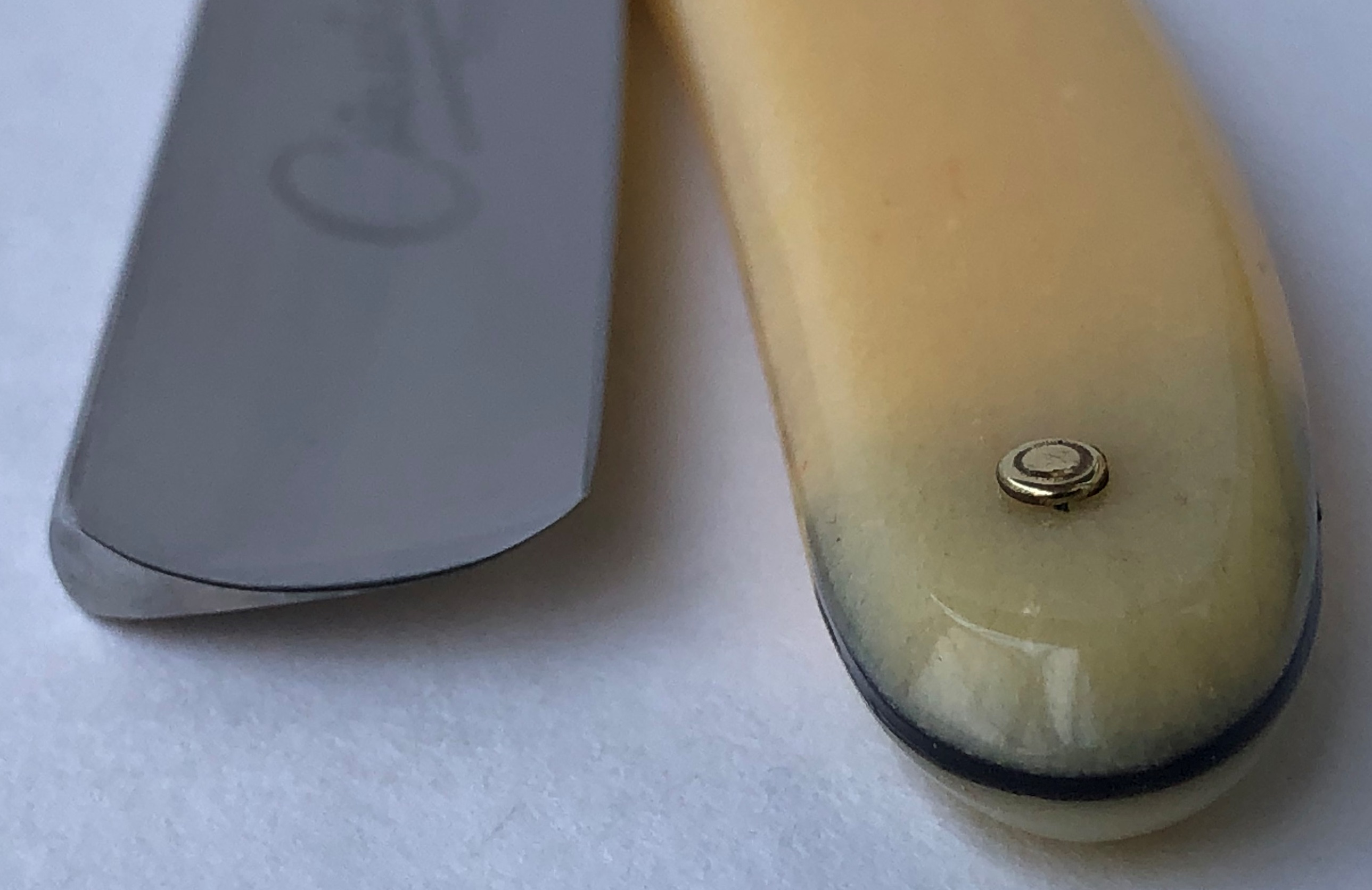 Ширина полотна-18.0 мм. Толщина обушка-5.0 мм. Полная вогнутость. Углеродистая сталь. Первая половина прошлого века. Привел в порядок старушку. Еще послужит долго.Перешлифовал и переполировал клинок. Замена пинов и внутренних шайб.Очень хорошее , рабочее состояние.Кромочка равномерна по всей длине. Красивая пластиковая ручка,"под черепаху".Удобная форма лезвия для новичка прежде всего, а также пойдет любому пользователю. Заточена и готова к бритью. Цена-9500 р с доставкой.ПРОДАН Spoiler Show