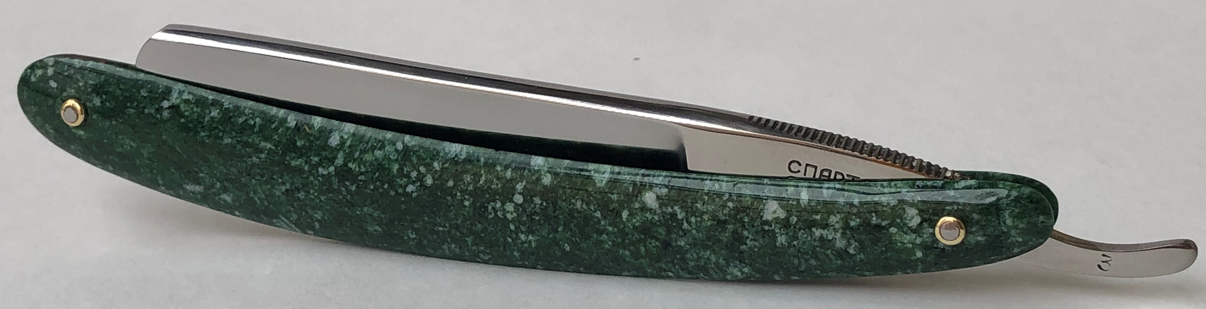 Ширина полотна-19.0 мм. Толщина обушка-5.0 мм. Полная вогнутость. Углеродистая сталь. Самая мощная и крупная "горбатая"модель,из всей линейки стизовских бритв. Бритва в пользовании не была. Разобрал для удаления радиальных царапин, в районе осевого пина, а также остатков патины.Поменял пины на двух-цветные втулки, с добавлением внутренних шайб. Заодно немного освежил клинок на самых тонких абразивах.Идеальная геометрия полотна:кромочка равномерна по всей длине и еле заметна. Шикарная "малахитовая" оправа.Бритва в идеальном состоянии. Сейчас довольно редко встречаются в непользованном виде. Заточена и готова к бритью. Не пропустите редкую. вещь в свою коллекцию. Цена-10500 р с доставкой.ПРОДАН Spoiler Show