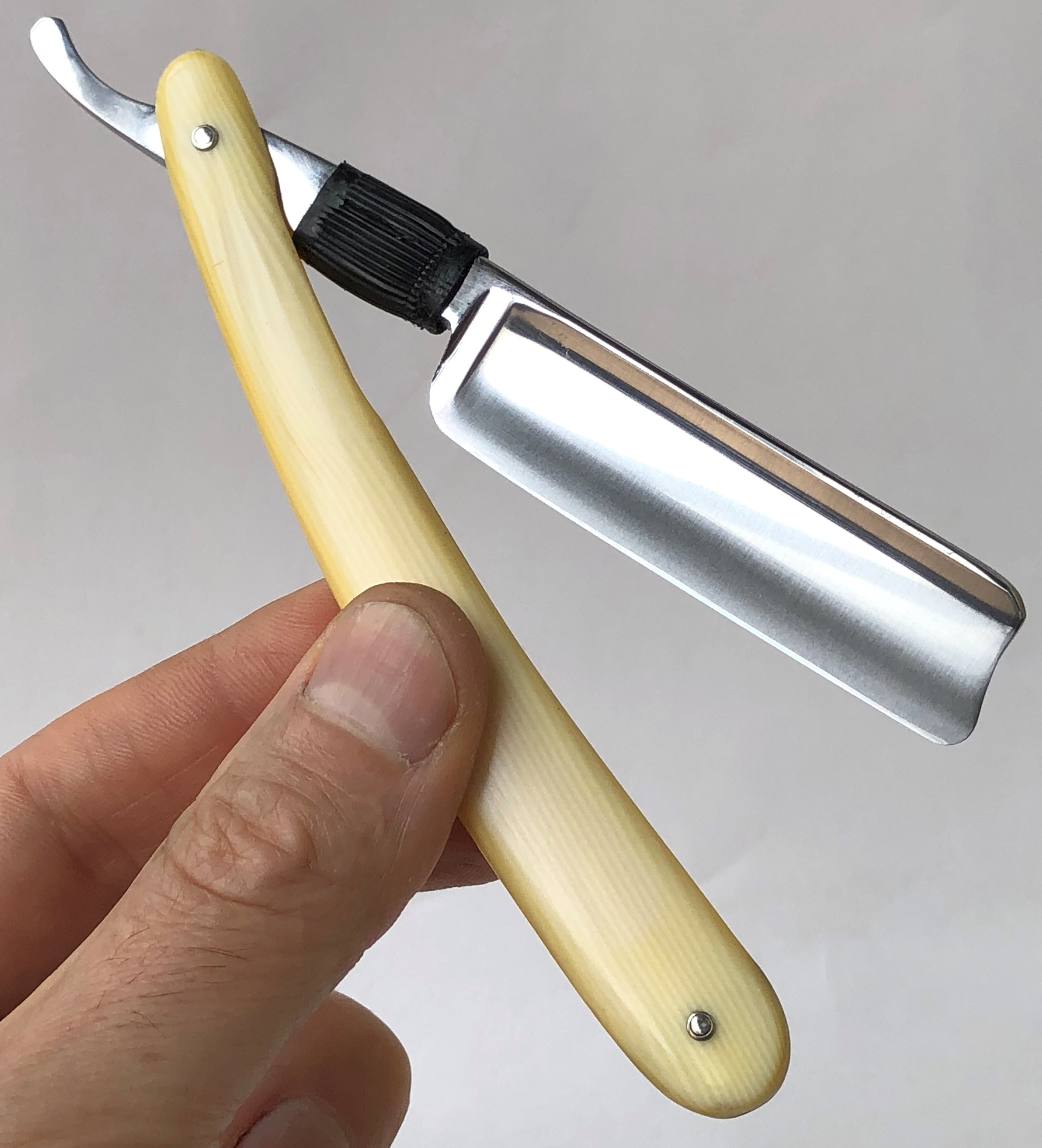 Ширина полотна-20.0 мм. Толщина обушка=5.8 мм. Полная вогнутость. Углеродистая сталь. Судя по всему это начало прошлого века. Клинок имел остатки старой сломанной оправы, с надписью "solingen".Сам клинок находится в очень приличном и аккуратно пользованном состоянии.Полотно было почищено(без регринда) и умеренно отполировано. Идеальная геометрия:кромочка равномерна по всей длине.Не долго думая,раскопал старую ,мощную немецкую ручку "под черепаху", от Бисмарка.Немного неестественно смотрится толстенный эрль относительно плашек ручки, но в общем и целом бритва получилась неплохой, особенно с клинком из высококачественной стали.Бритва достаточно крупная , с удобным хватом.Заточена и готова к бритью. Цена-10500 р с доставкой.ПРОДАН Spoiler Show