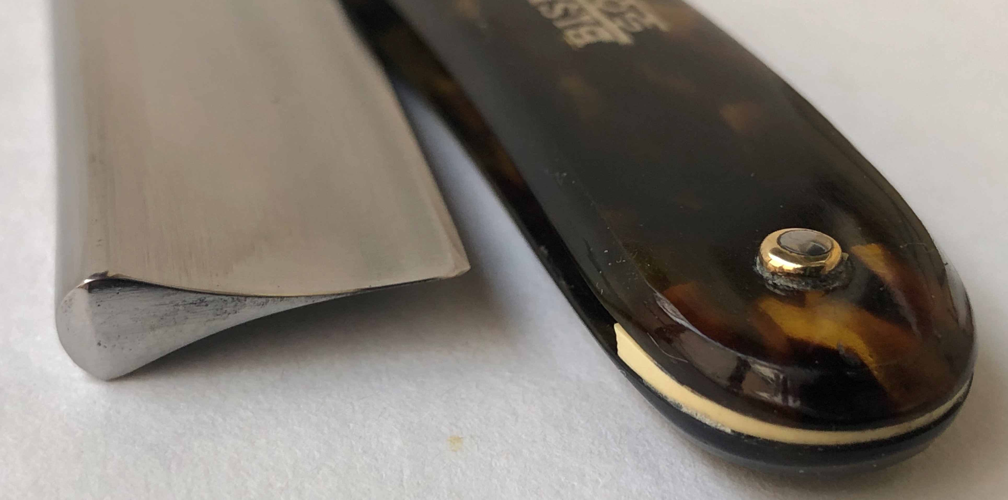 Ширина полотна-20.0 мм. Толщина обушка=5.8 мм. Полная вогнутость. Углеродистая сталь. Судя по всему это начало прошлого века. Клинок имел остатки старой сломанной оправы, с надписью "solingen".Сам клинок находится в очень приличном и аккуратно пользованном состоянии.Полотно было почищено(без регринда) и умеренно отполировано. Идеальная геометрия:кромочка равномерна по всей длине.Не долго думая,раскопал старую ,мощную немецкую ручку "под черепаху", от Бисмарка.Немного неестественно смотрится толстенный эрль относительно плашек ручки, но в общем и целом бритва получилась неплохой, особенно с клинком из высококачественной стали.Бритва достаточно крупная , с удобным хватом.Заточена и готова к бритью. Цена-10500 р с доставкой.ПРОДАН Spoiler Show
