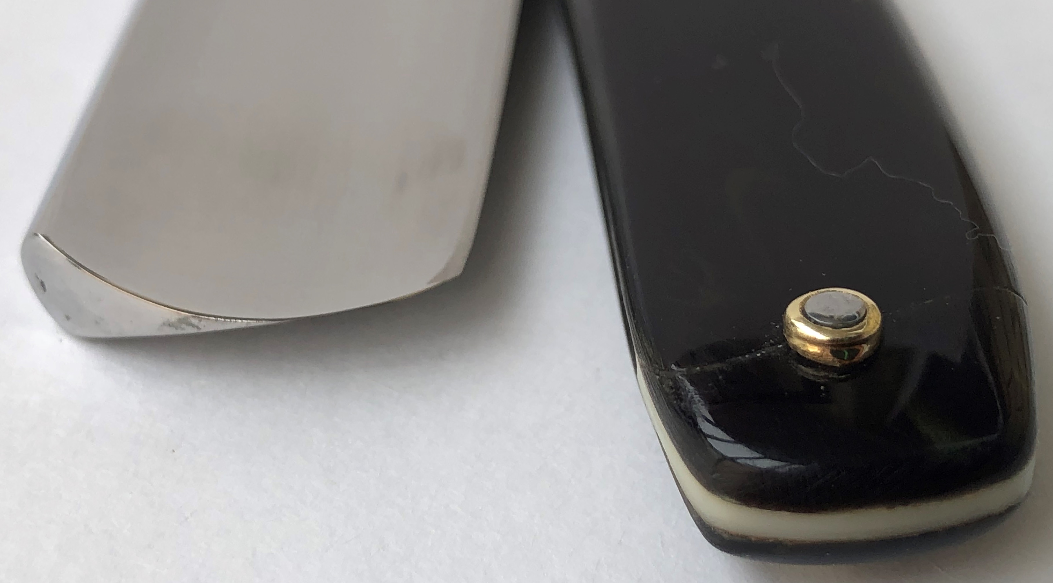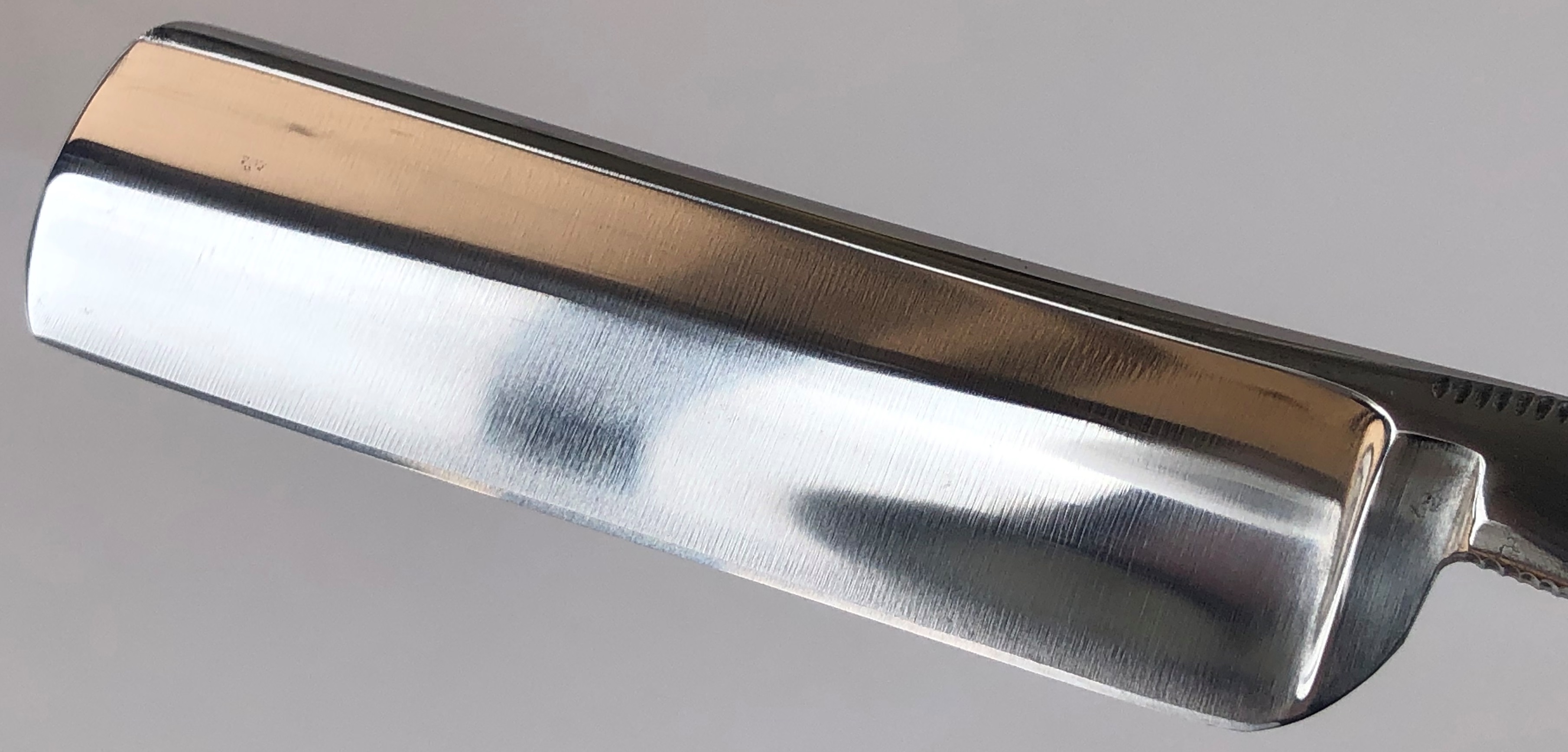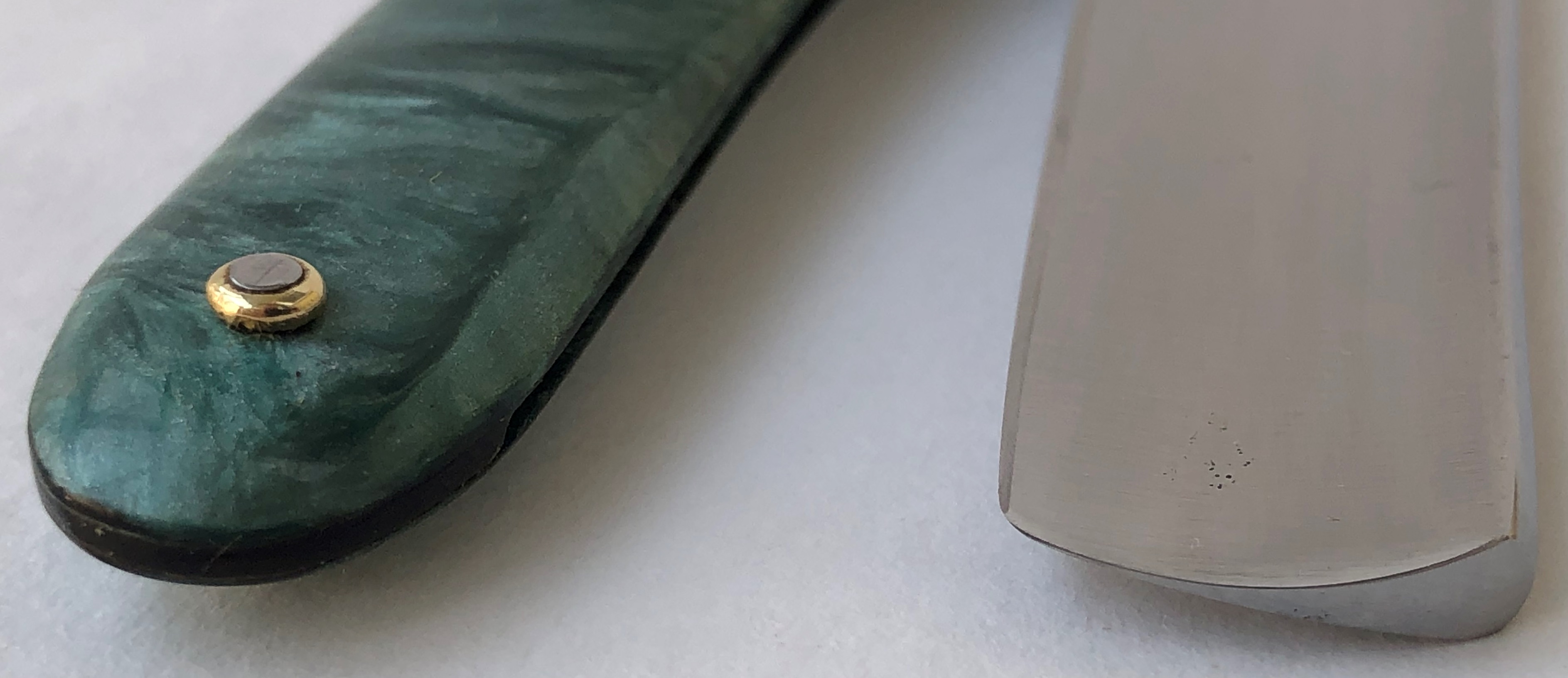 Бритва в прекрасном состоянии, с минимальными следами пользования.Была разобрана для добавления внутренних шайб, с сохранением родного осевого пина.Оригинальная шлифовка и полировка клинка.Идеальная геометрия полотна:кромочка равномерна по всей длине.