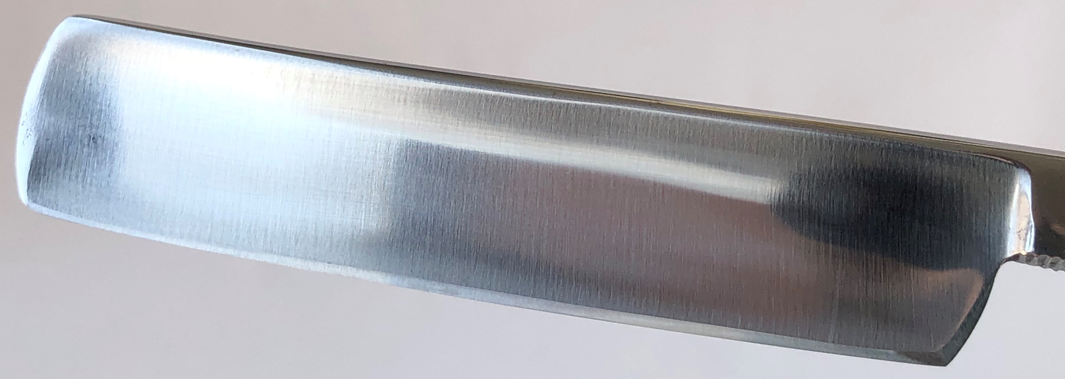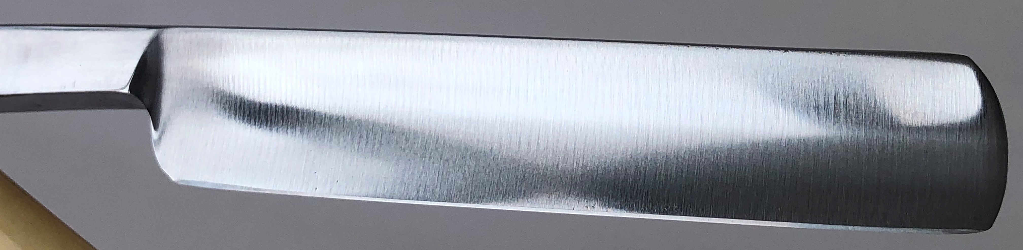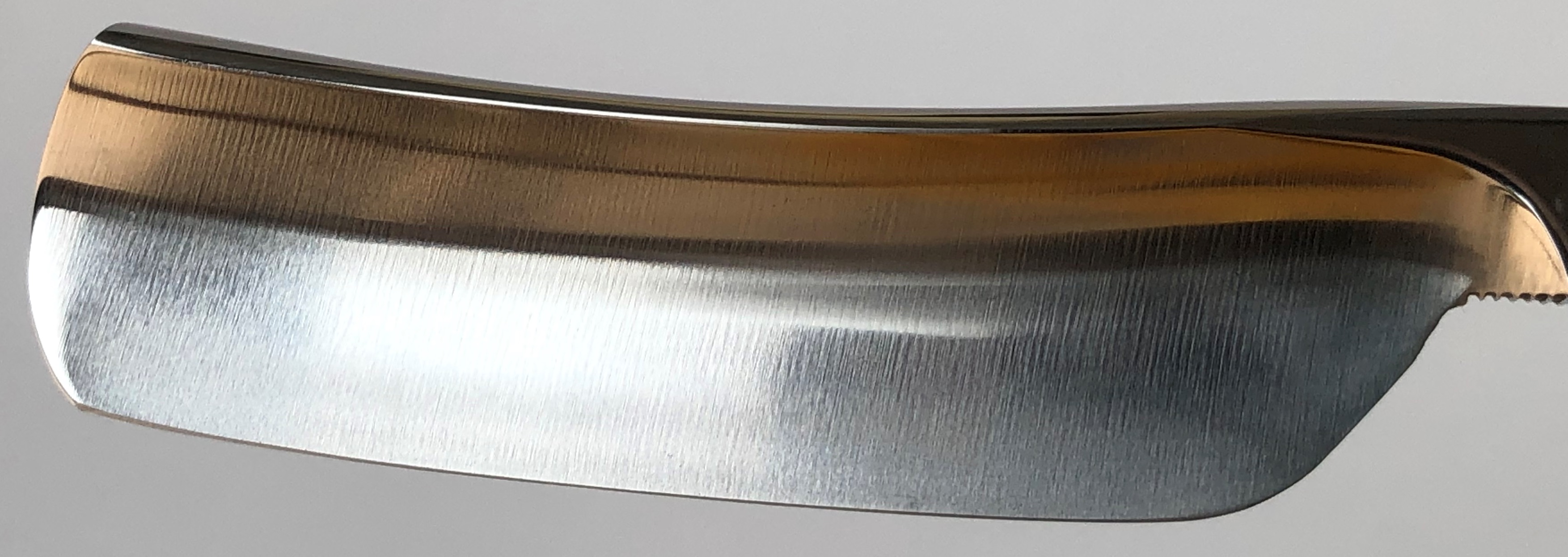Бритва в пользовании не была, но необходимо было произвести минимальные, косметические работы.Идеальная геометрия полотна:кромочка равномерна по всей длине и еле заметна. (Трещина оправы в районе нижнего пина была намертво и надежно проклеена. Отшлифована и отполирована.Практически незаметно). Неестественная для традиционных японских евро бритв форма лезвия.Скорее похода на англичанку начала 20-го века. Что характерно, сталь (как мне показалось) несколько мягче, чем на обычных японцах. В связи с этим бритье очень напомнило именно бритье старинными английскими бритвами:приятный "шелест" сбриваемой щетины.Мягкое и комфортное бритье. Отличный вариант для новичка. Не пропустите!