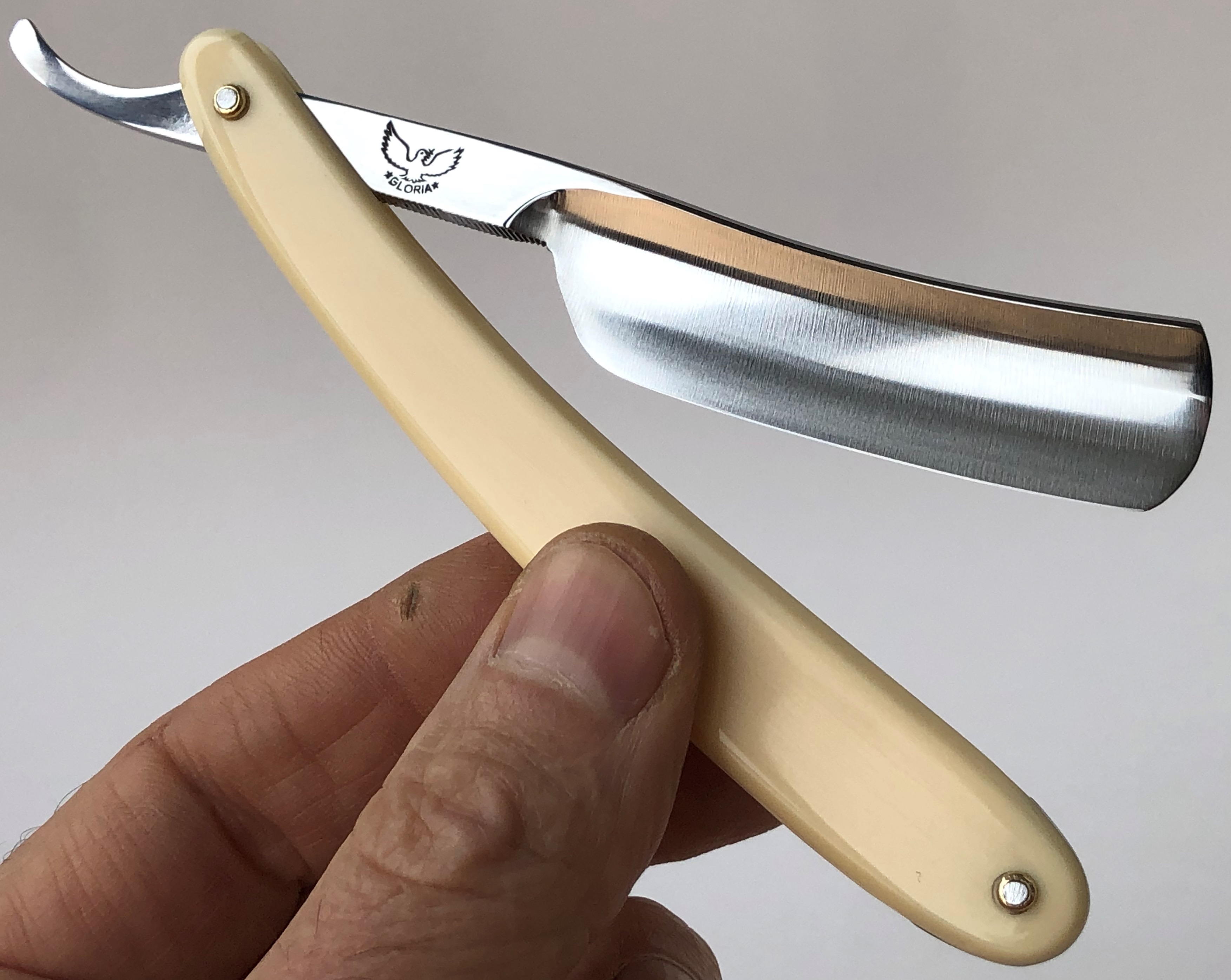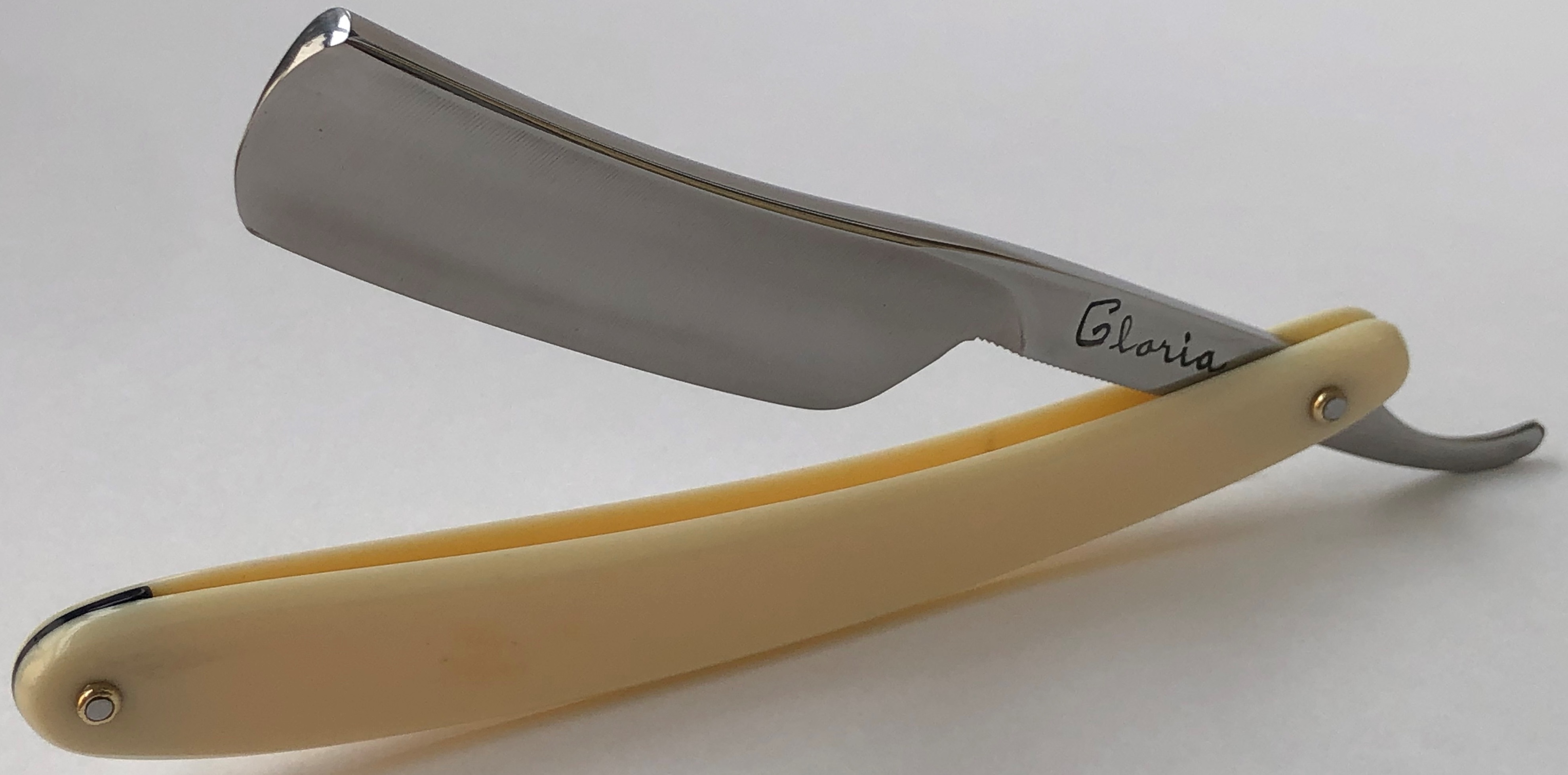 Японская укороченная ,"улыбчатая" бритва GLORIA.,Судя по информации Фикиры с его сайта,бренд ГЛОРИЯ принадлежал легендарной фирме RIBBON,производившей профессиональный инструмент для парикмахеров.