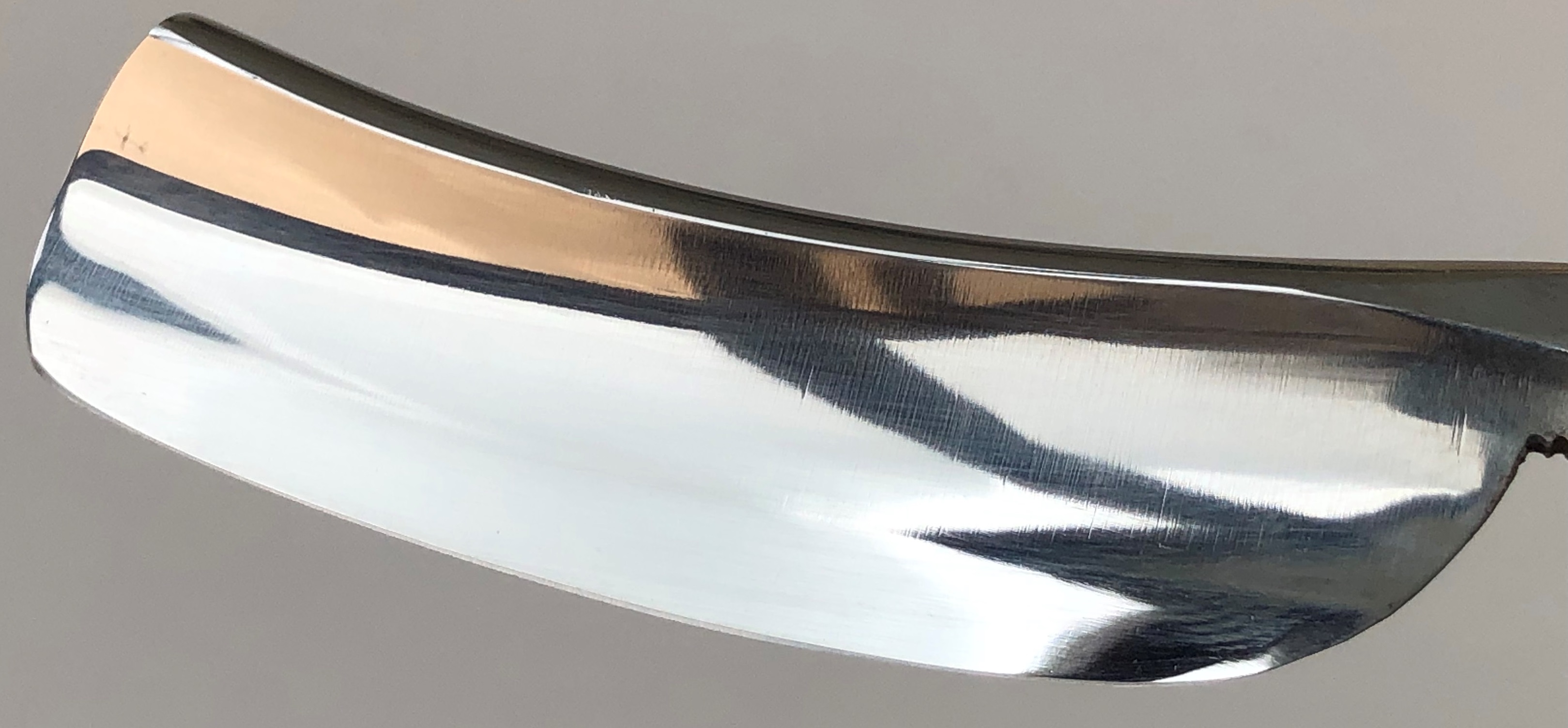 Кромочка идеально ровная по всей длине и почти незаметная.Тяжёлая,красивая бритва,которую просто не хочется выпускать из рук.Состояние бритвы, как вчера с завода.Бритва заточена и лично протестирована. Сталь умеренно твердая, что придает небольшую агрессию при бритье, что вполне характерно именно бритвам с подобными сталями.Но бритье чистое, приятное и без раздражения.Бритва получилась очень острой, со своим характером и ошибок не прощает.