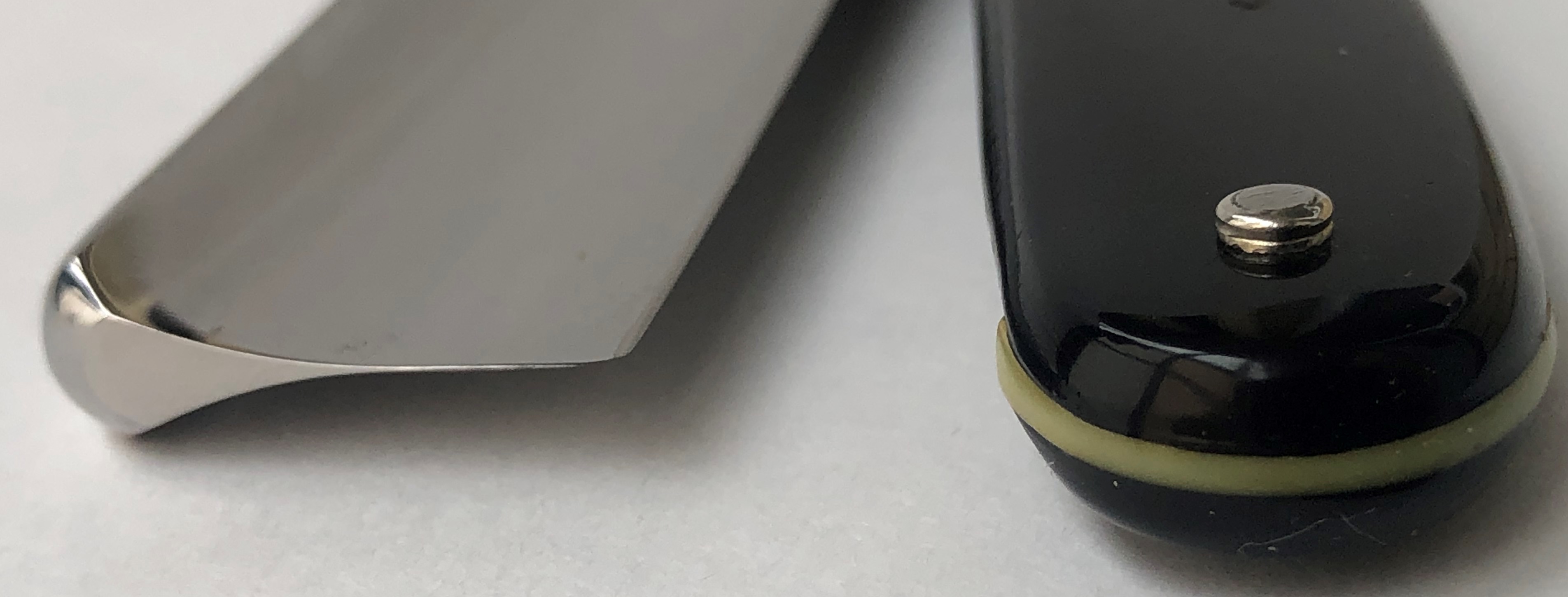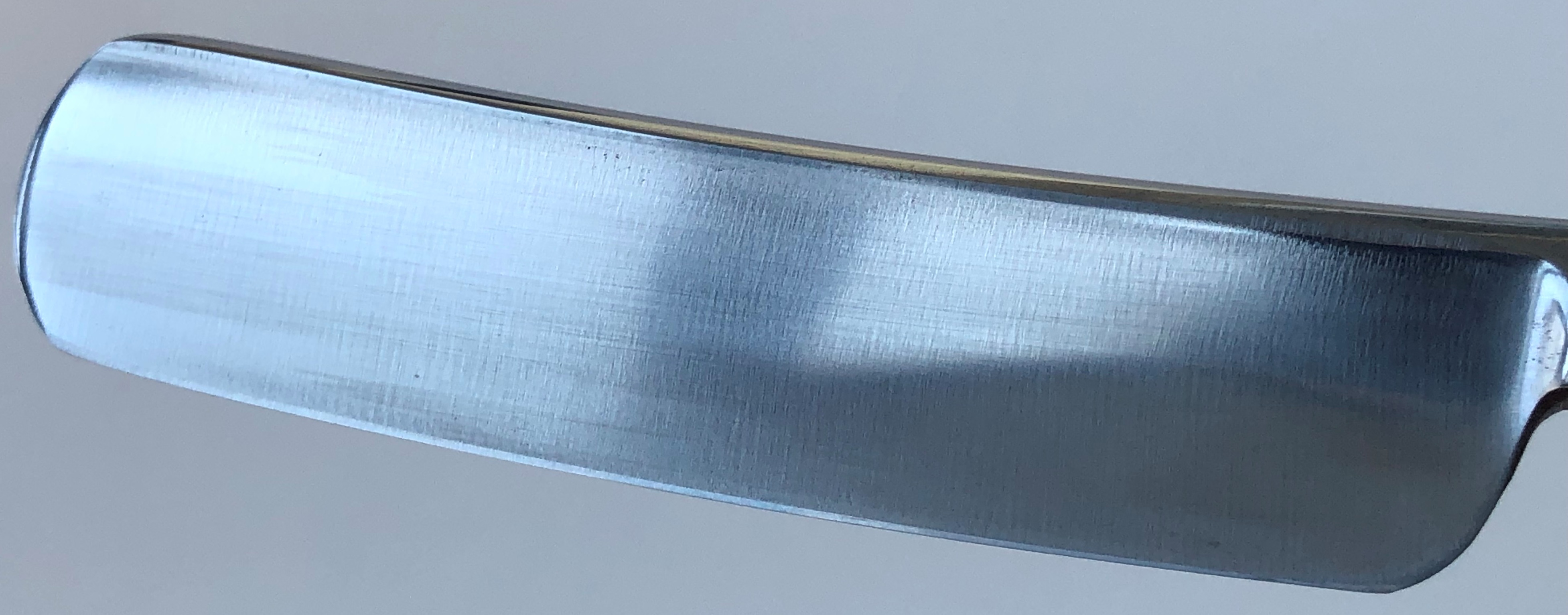 Бритва в идеальном состоянии.Только отчистил от остатков масла с консервации. Ничего не разбиралось и не реставрировалось. Оригинальная шлифовка и полировка.Кромочка равномерна по всей длине и еле заметна.Сталь чистая, без видимых дефектов. (Не считая практически незаметных пятнашек у носика, от взаимодействия металла и платика оправы).Я не помню, чтобы мне попадалась SK-3 и шириной полотна в 22 мм. Крупная и тяжёлая. На некоторых 3-ках я не наблюдал фирменной "ступеньки" на полотне, как на бритвах 1-й и 2-ой модели.Тут эффектный "переход жесткости" имеется, так что все в норме.