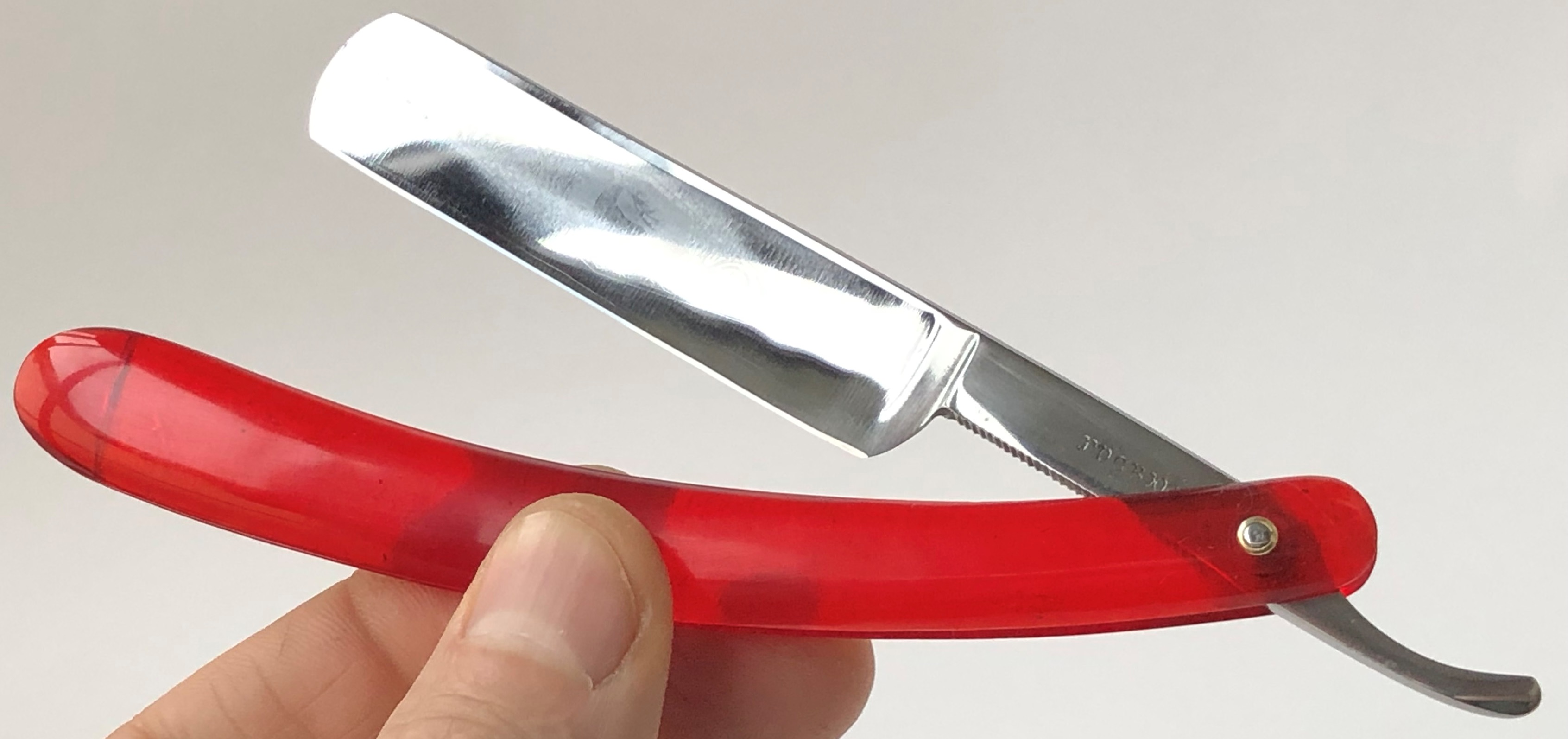 Бритва по своей форме клинка и размерам наиболее подходящая для новичка. Крупная и достаточно тяжёлая.Заточена и готова к бритью.