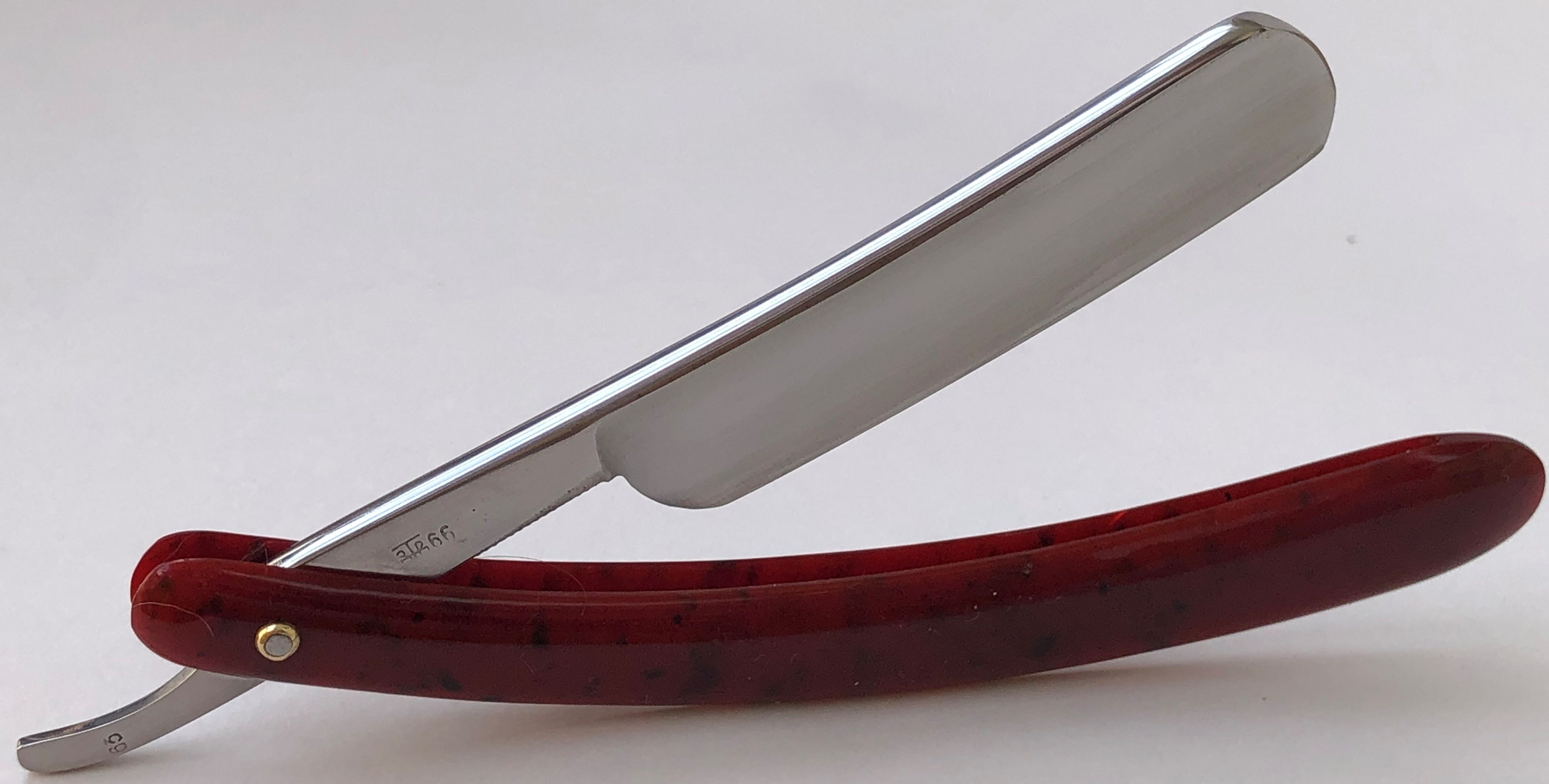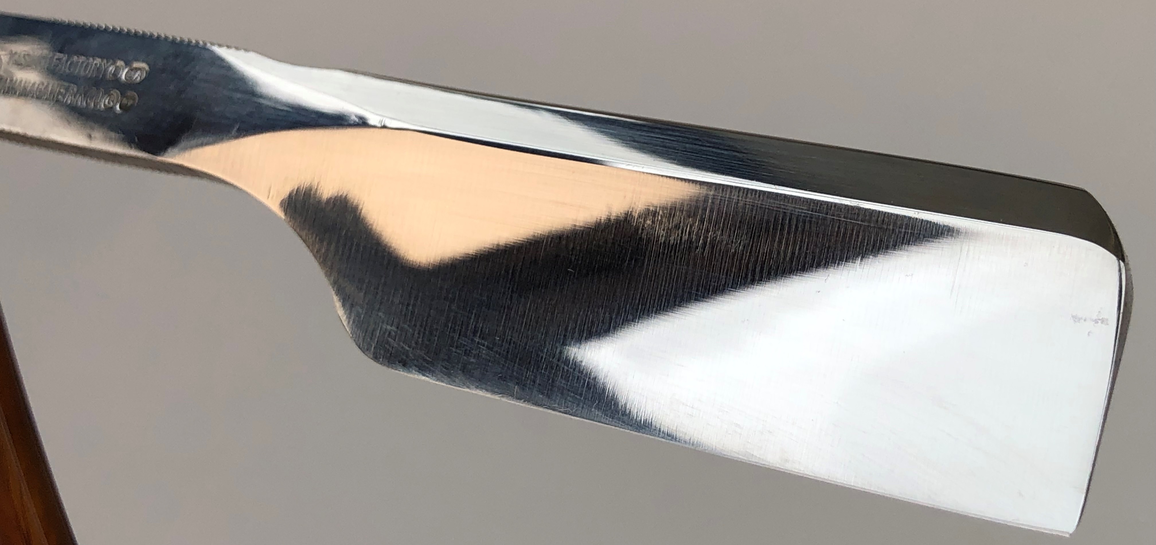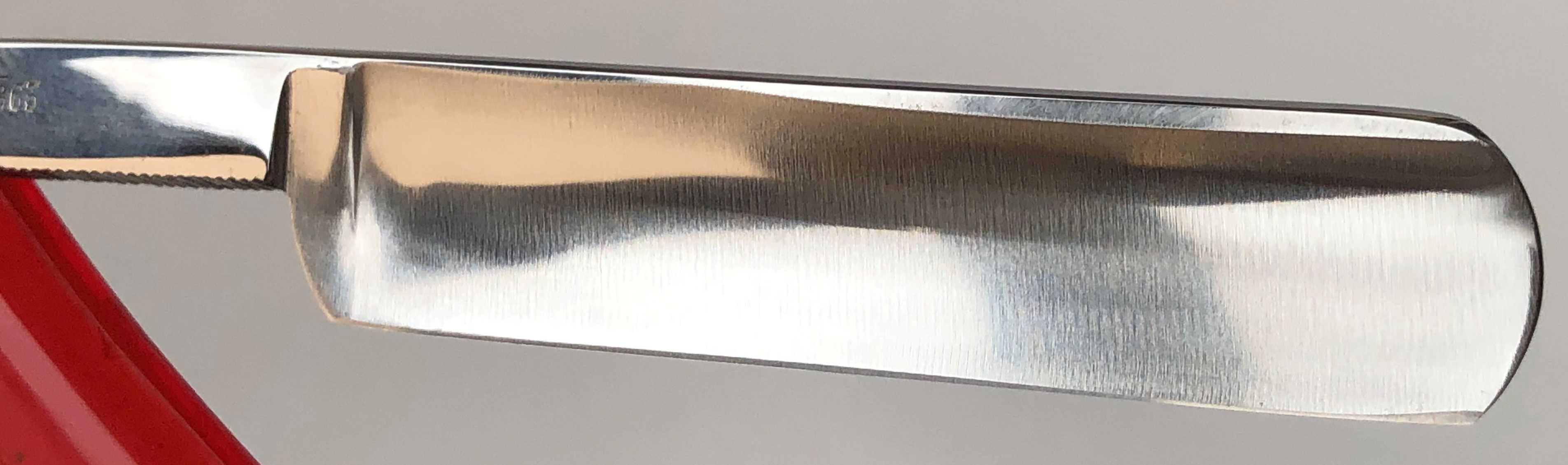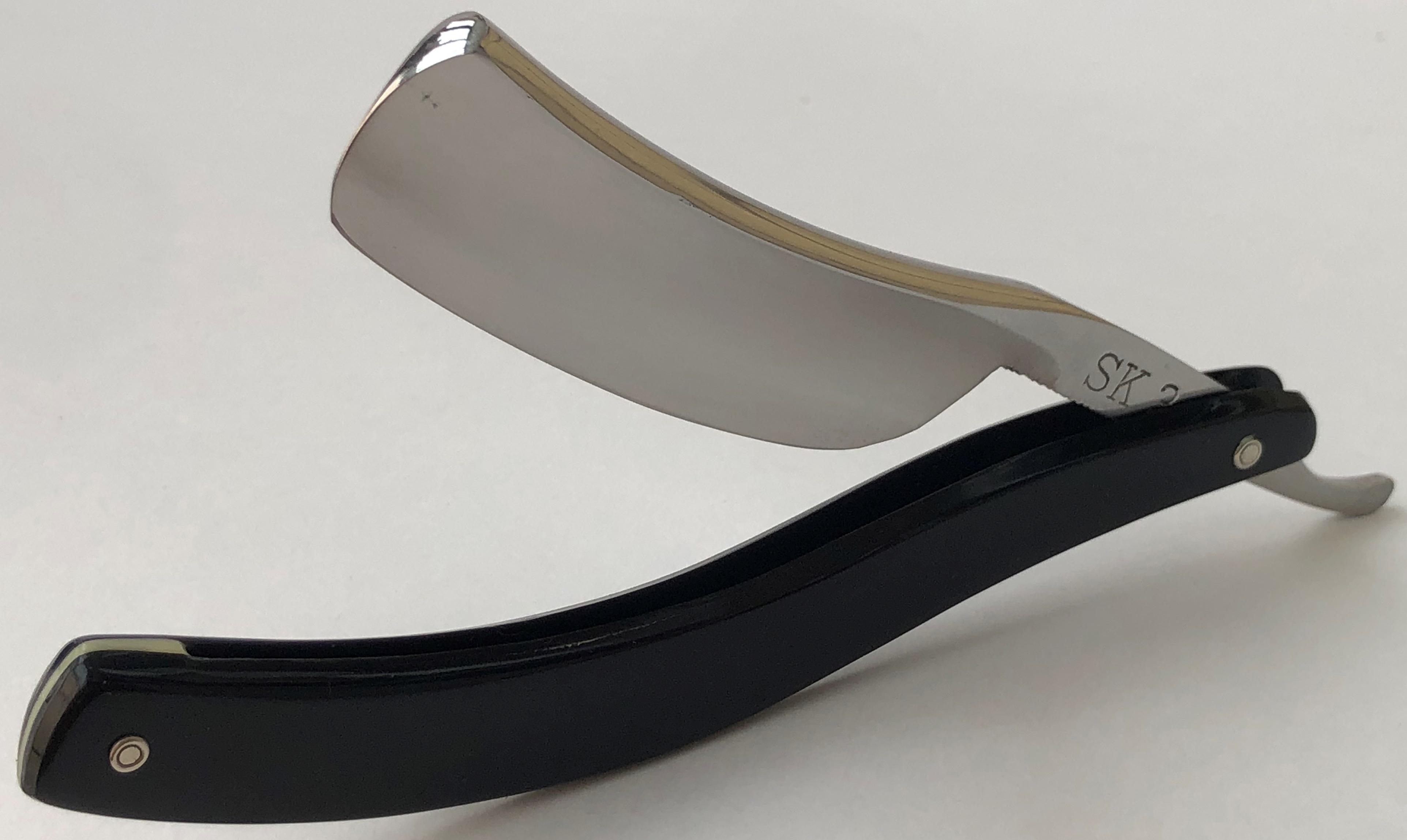 Бритва в идеальном состоянии.Только отчистил от остатков масла с консервации. Ничего не разбиралось и не реставрировалось. Оригинальная шлифовка и полировка.Кромочка равномерна по всей длине и еле заметна.Сталь чистая, без видимых дефектов. (Не считая практически незаметных пятнашек у носика, от взаимодействия металла и платика оправы).Я не помню, чтобы мне попадалась SK-3 и шириной полотна в 22 мм. Крупная и тяжёлая. На некоторых 3-ках я не наблюдал фирменной "ступеньки" на полотне, как на бритвах 1-й и 2-ой модели.Тут эффектный "переход жесткости" имеется, так что все в норме.
