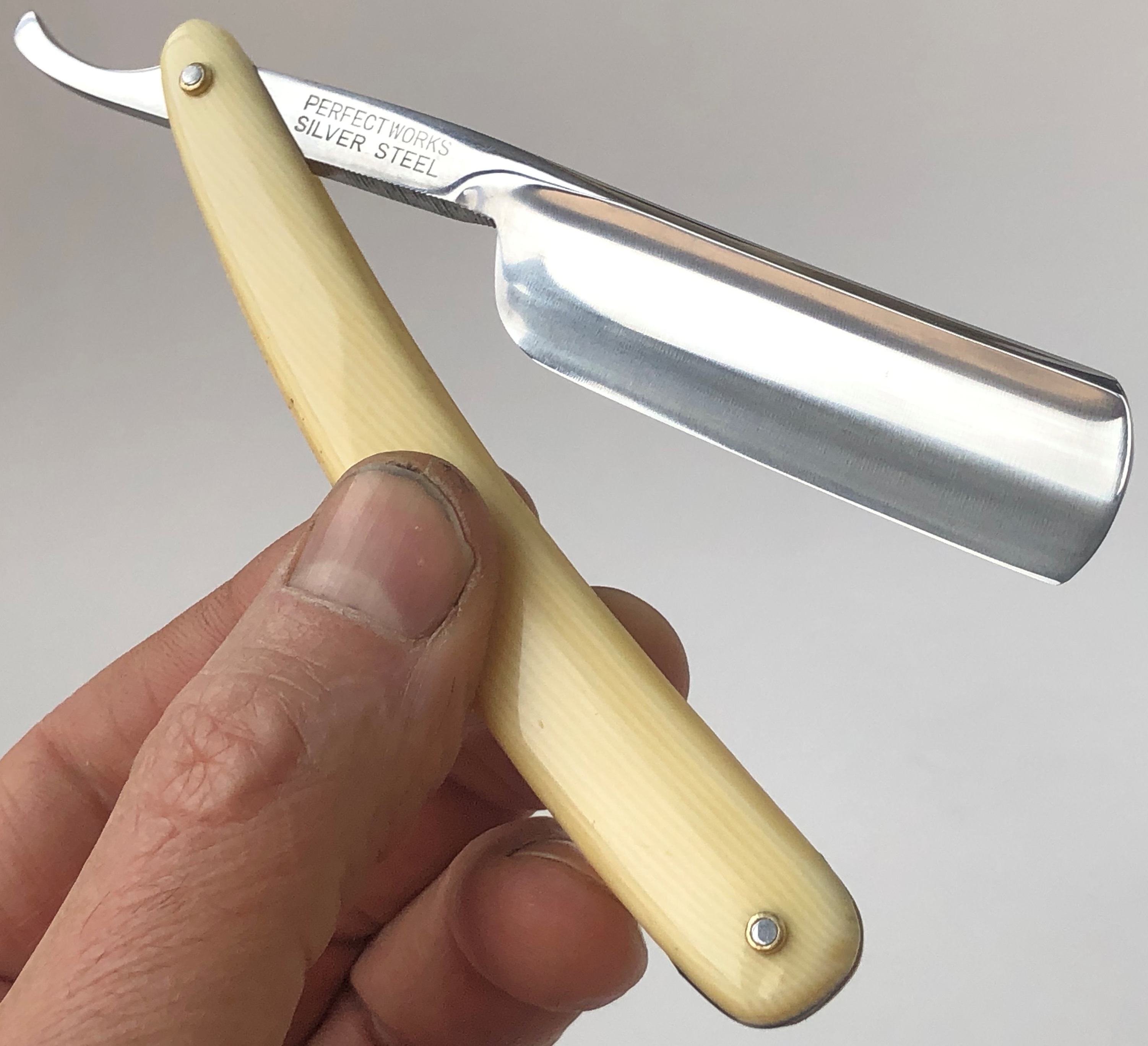 Бритва в очень хорошем состоянии без следов пользования. Была разобрана для замена пинов и добавления внутренних шайб.На оправе был утрачен металлический логотип фирмы, поэтому место склейки зашлифовал и отполировал.С клинком ничего не делал. Все в оригинале.Кромочка равномерна по всей длине.Бритва среднего размера. Удобная в бритье.Заточена и готова к пользованию.