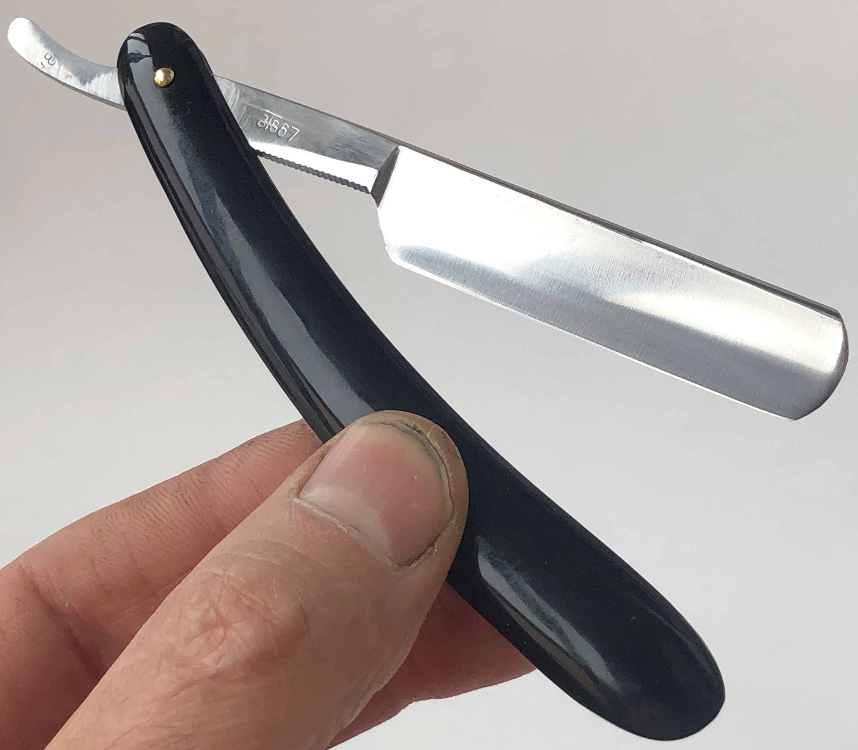 Бритва в очень хорошем состоянии без следов пользования. Была разобрана для замена пинов и добавления внутренних шайб.На оправе был утрачен металлический логотип фирмы, поэтому место склейки зашлифовал и отполировал.С клинком ничего не делал. Все в оригинале.Кромочка равномерна по всей длине.Бритва среднего размера. Удобная в бритье.Заточена и готова к пользованию.