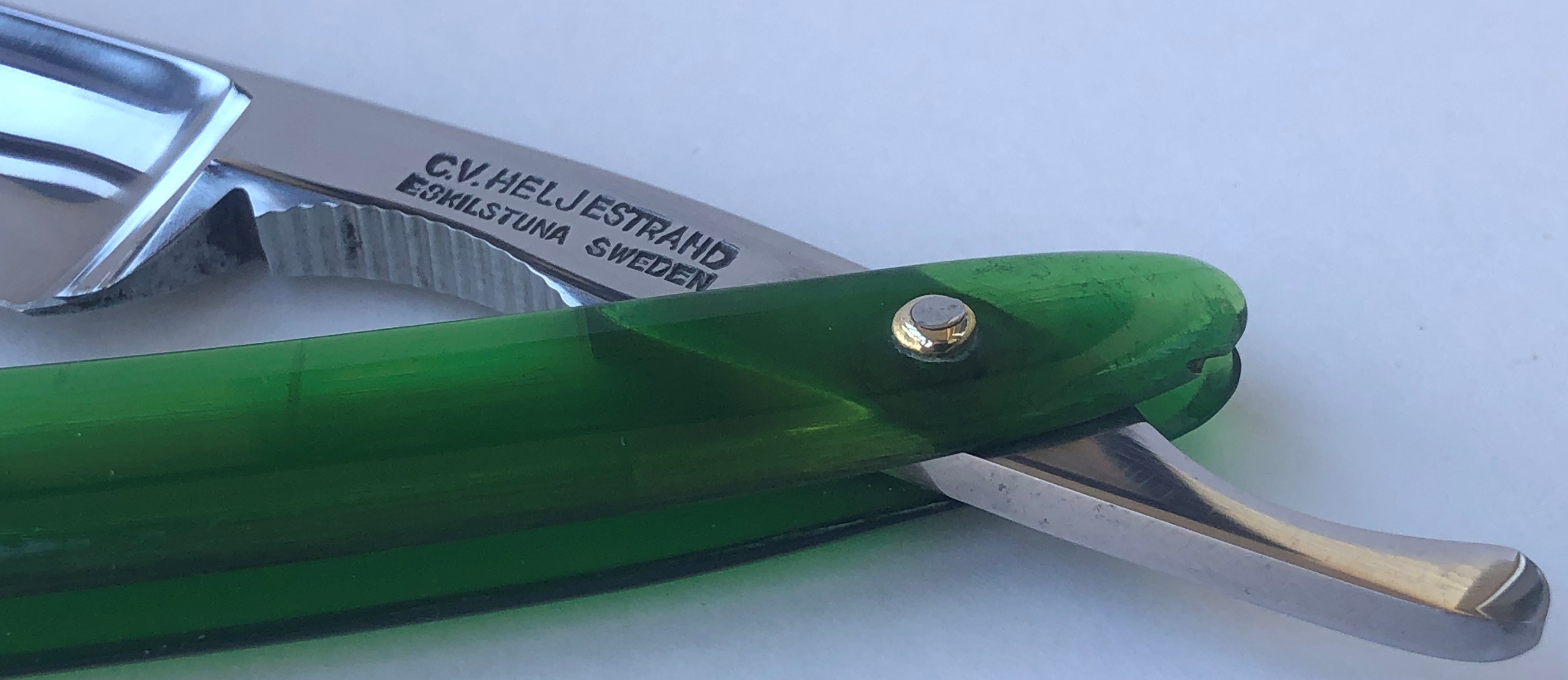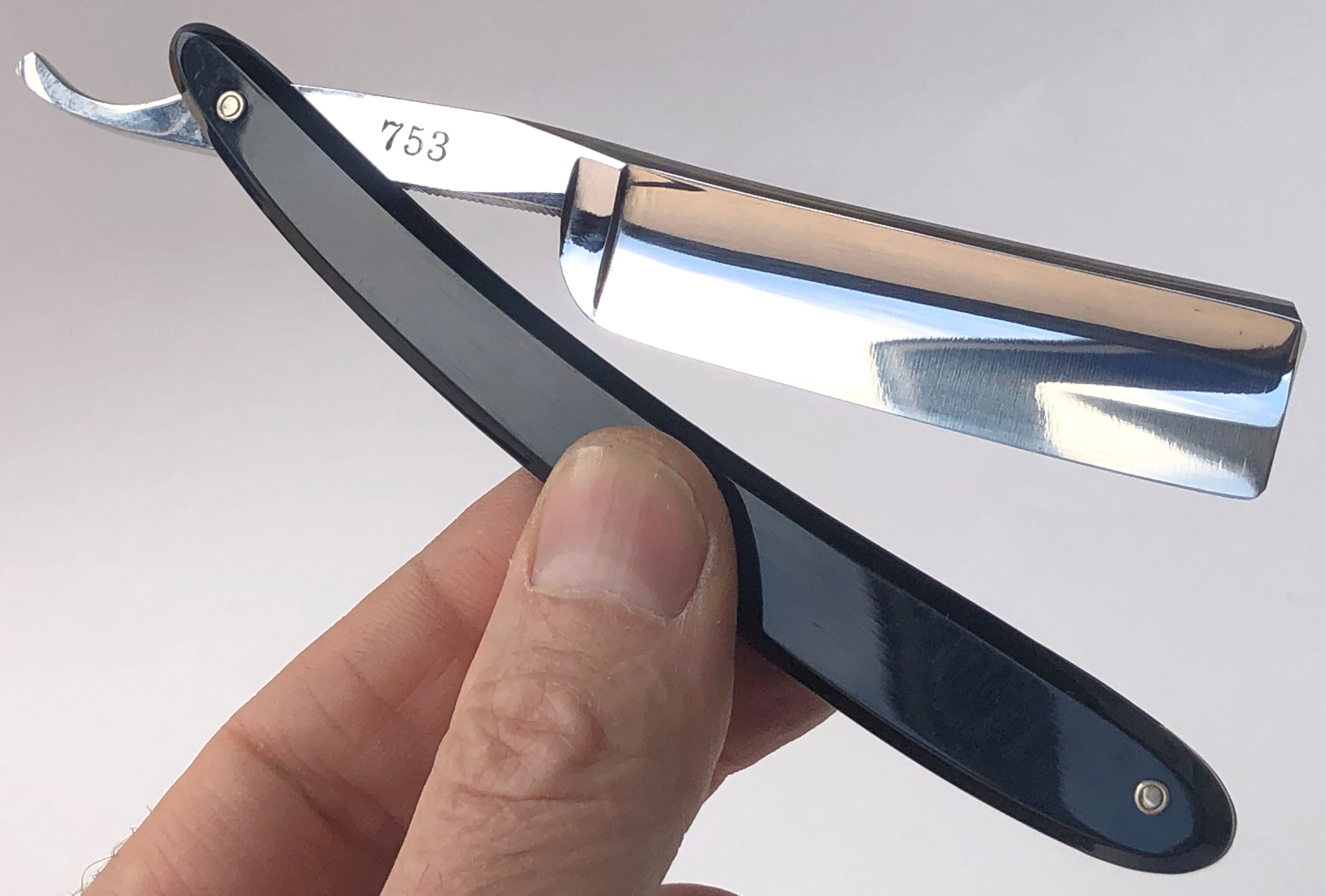 Бритва прибыла из Японии, но на японку совершенно не похожа. По всей видимости все таки немецкая.Лицевая сторона оригинальная, тут ничего не делал. Обратную сторону немного освежил от царапин и патины. Осевой перебрал , добавил внутренние шайбы и заново установил родной пин.Эффектный ажурный обушок,редко когда представленный на опасных бритвах. Идеальная геометрия полотна:кромочка равномерна по всей длине.Тяжёлая, с неплохой сталью и во целом красивая бритва. Будет заточена и подготовлена к бритью.