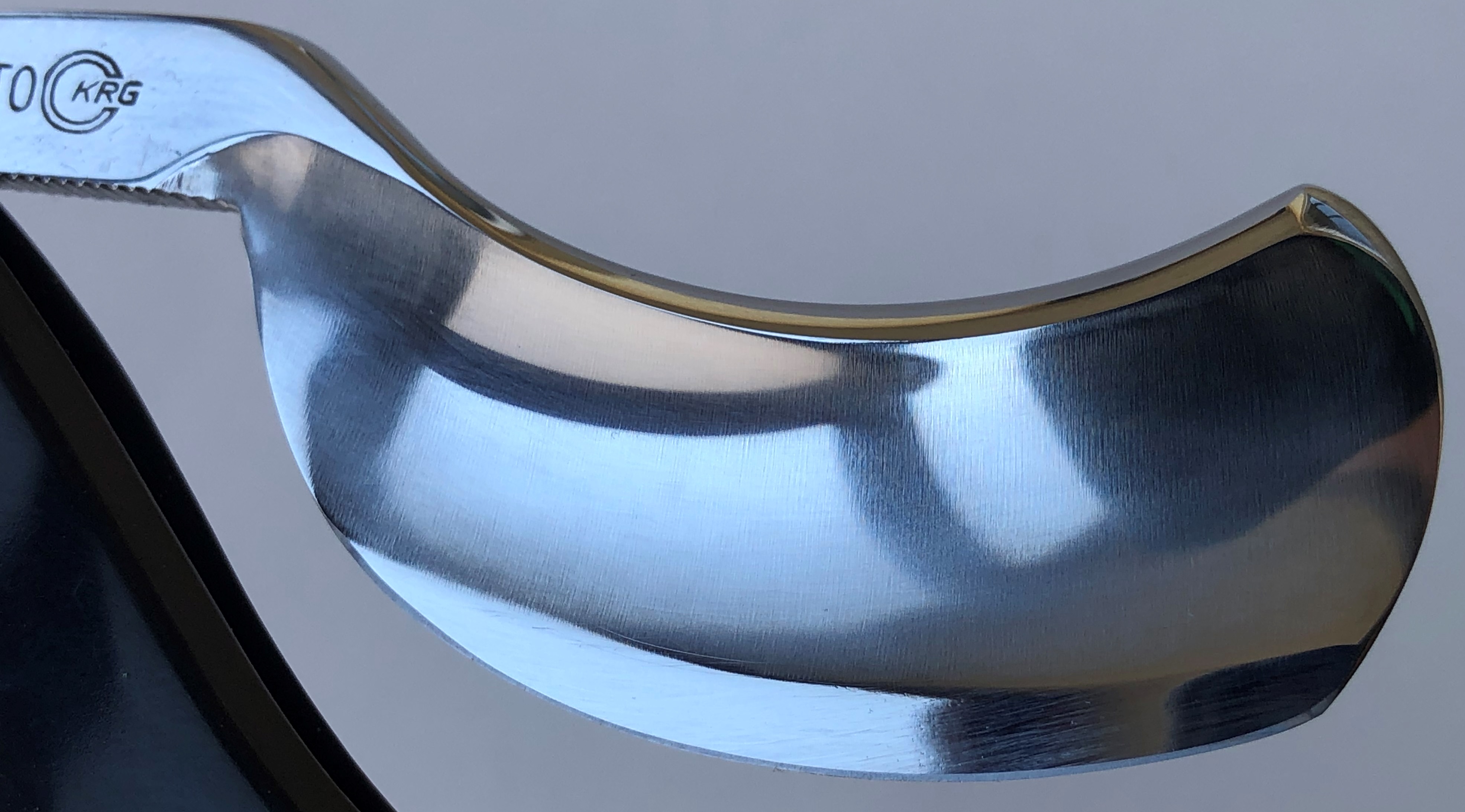 Вес этой бритвы смещен в сторону лезвия, а режущая кромка имеет более геометрическую форму с острыми углами.