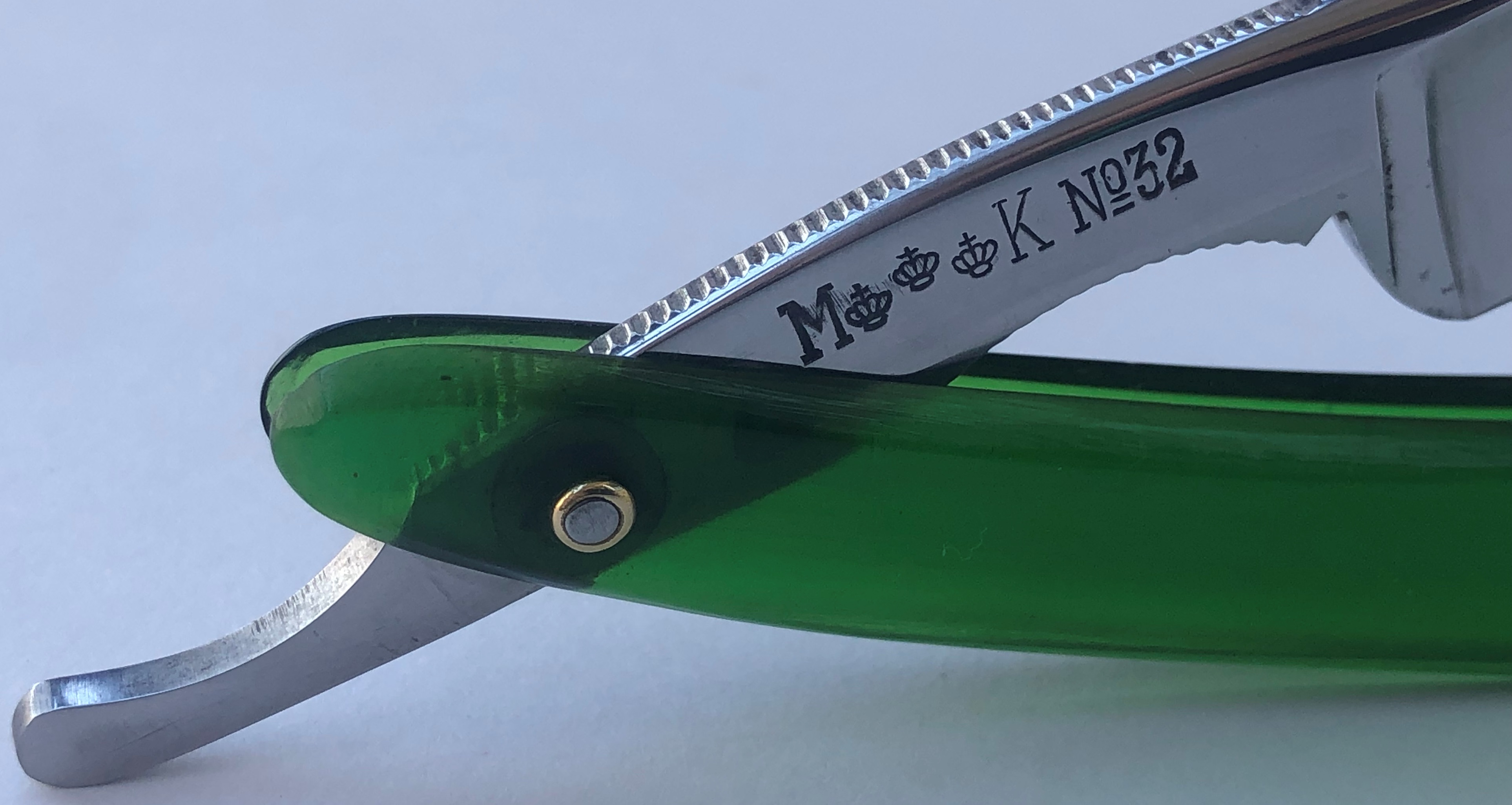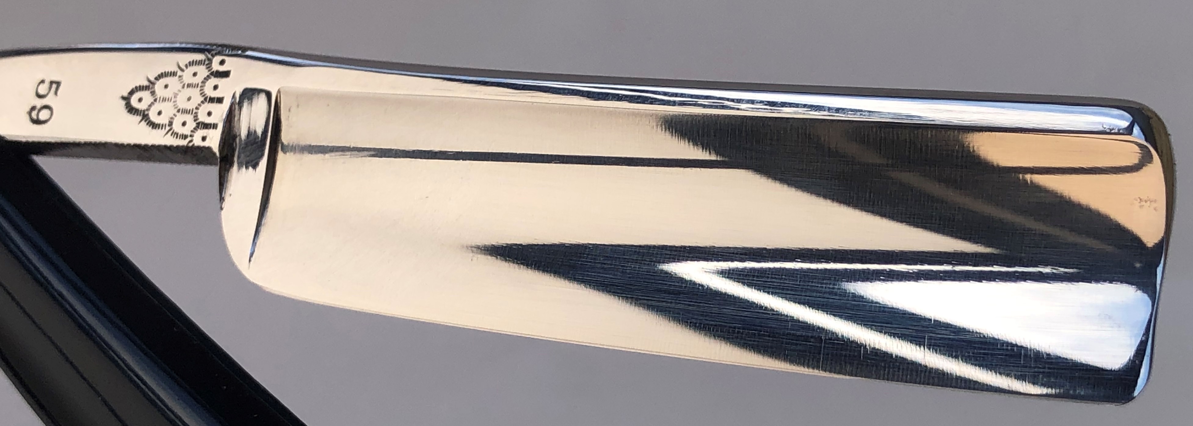 Бритва прибыла из Японии, но на японку совершенно не похожа. По всей видимости все таки немецкая.Лицевая сторона оригинальная, тут ничего не делал. Обратную сторону немного освежил от царапин и патины. Осевой перебрал , добавил внутренние шайбы и заново установил родной пин.Эффектный ажурный обушок,редко когда представленный на опасных бритвах. Идеальная геометрия полотна:кромочка равномерна по всей длине.Тяжёлая, с неплохой сталью и во целом красивая бритва. Будет заточена и подготовлена к бритью.