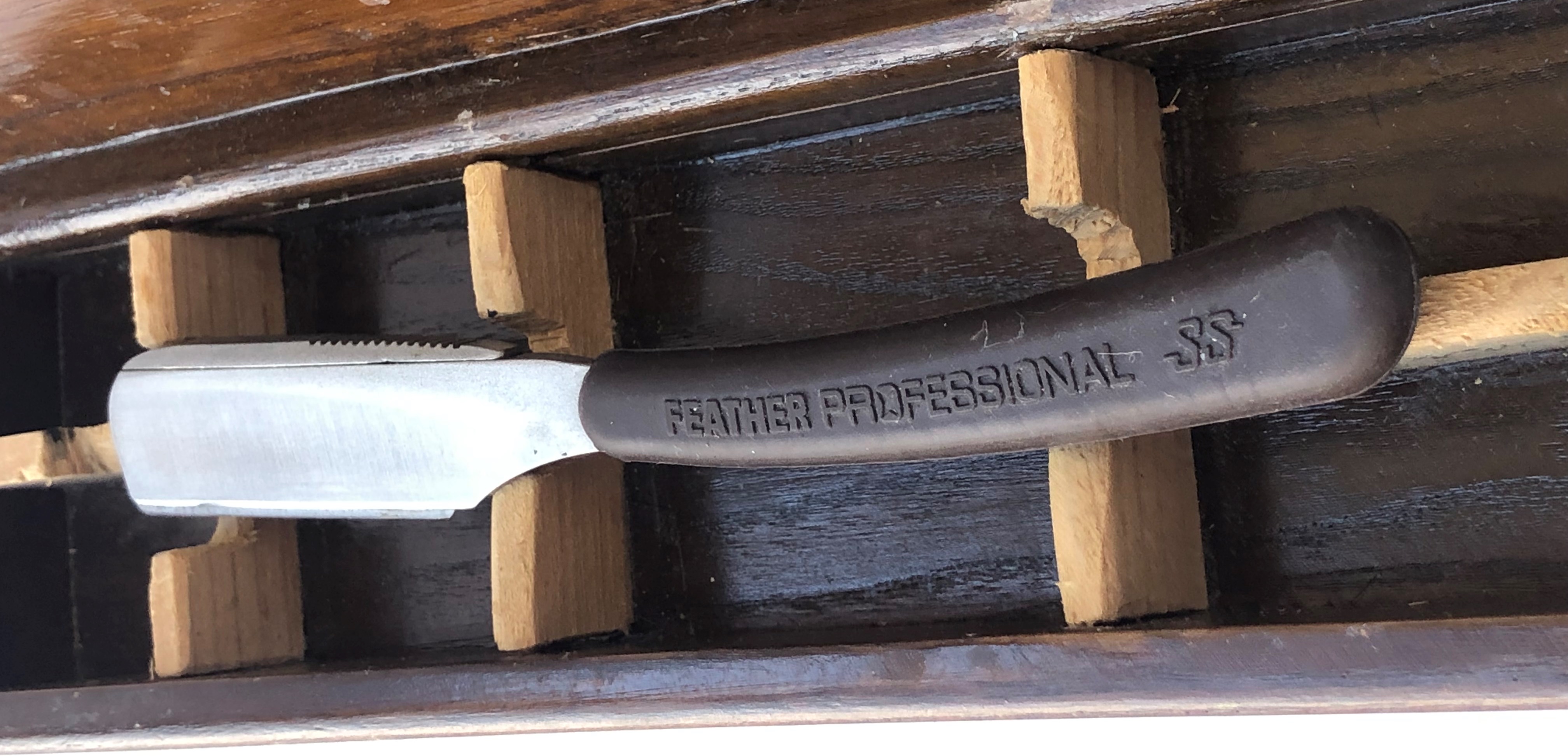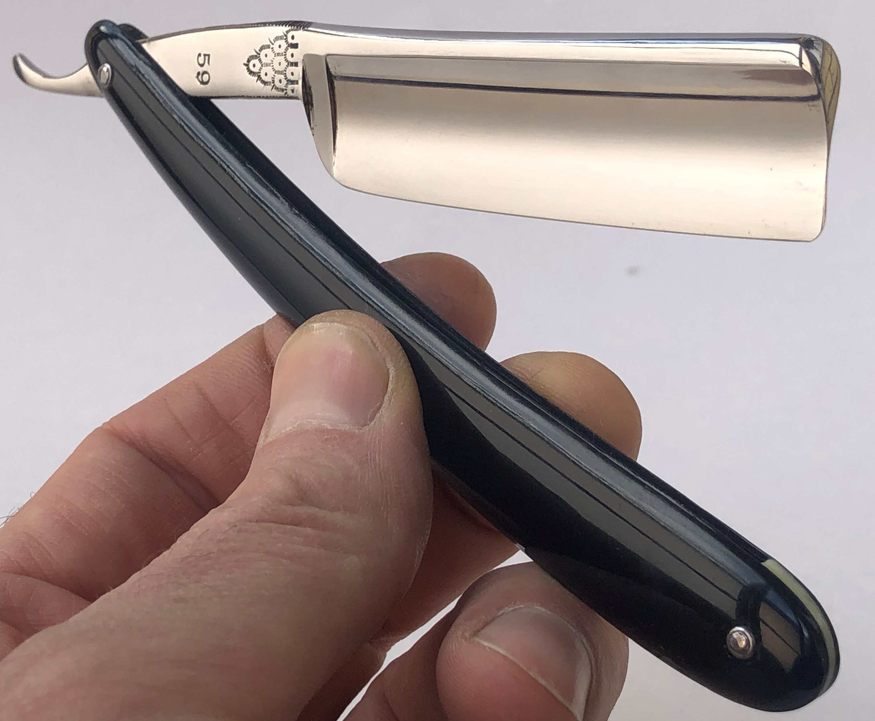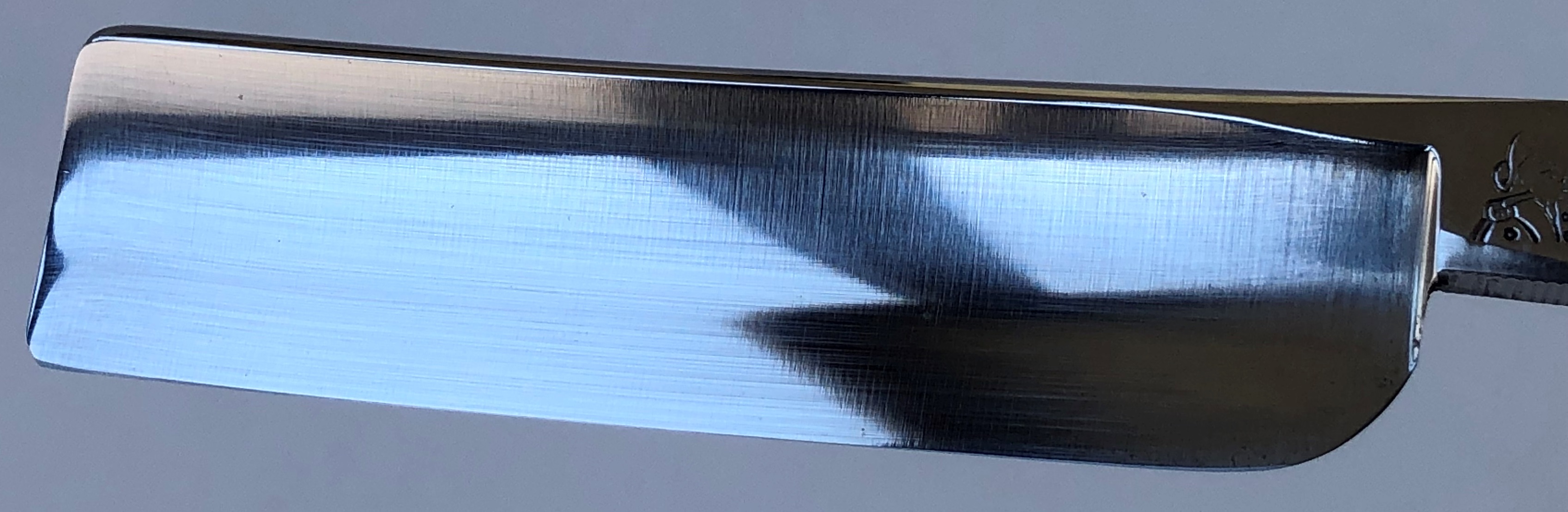 Бритва прибыла из Японии, но на японку совершенно не похожа. По всей видимости все таки немецкая.Лицевая сторона оригинальная, тут ничего не делал. Обратную сторону немного освежил от царапин и патины. Осевой перебрал , добавил внутренние шайбы и заново установил родной пин.Эффектный ажурный обушок,редко когда представленный на опасных бритвах. Идеальная геометрия полотна:кромочка равномерна по всей длине.Тяжёлая, с неплохой сталью и во целом красивая бритва. Будет заточена и подготовлена к бритью.