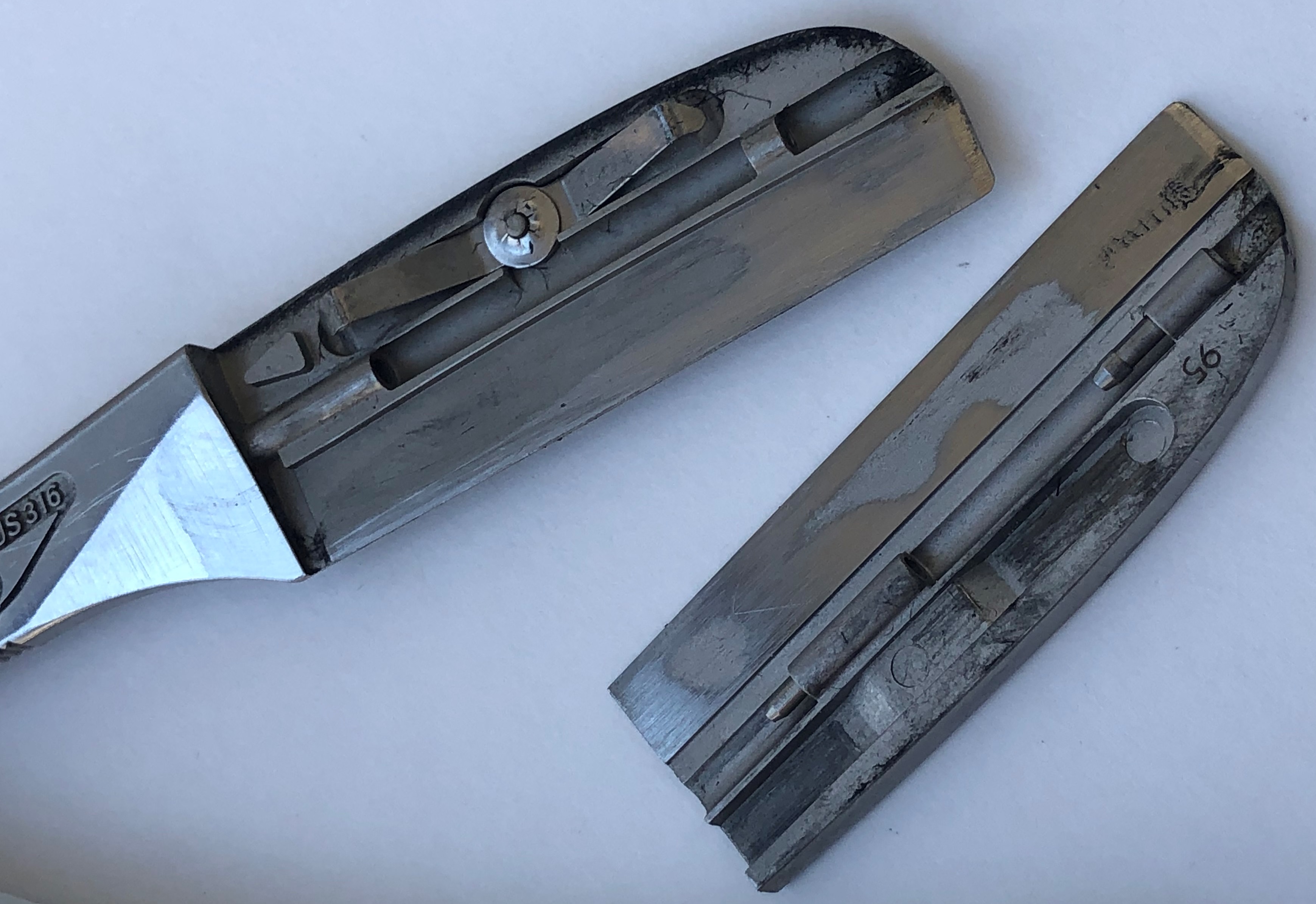 Деталь, удерживающая лезвие, имеет подпружинный механизм.