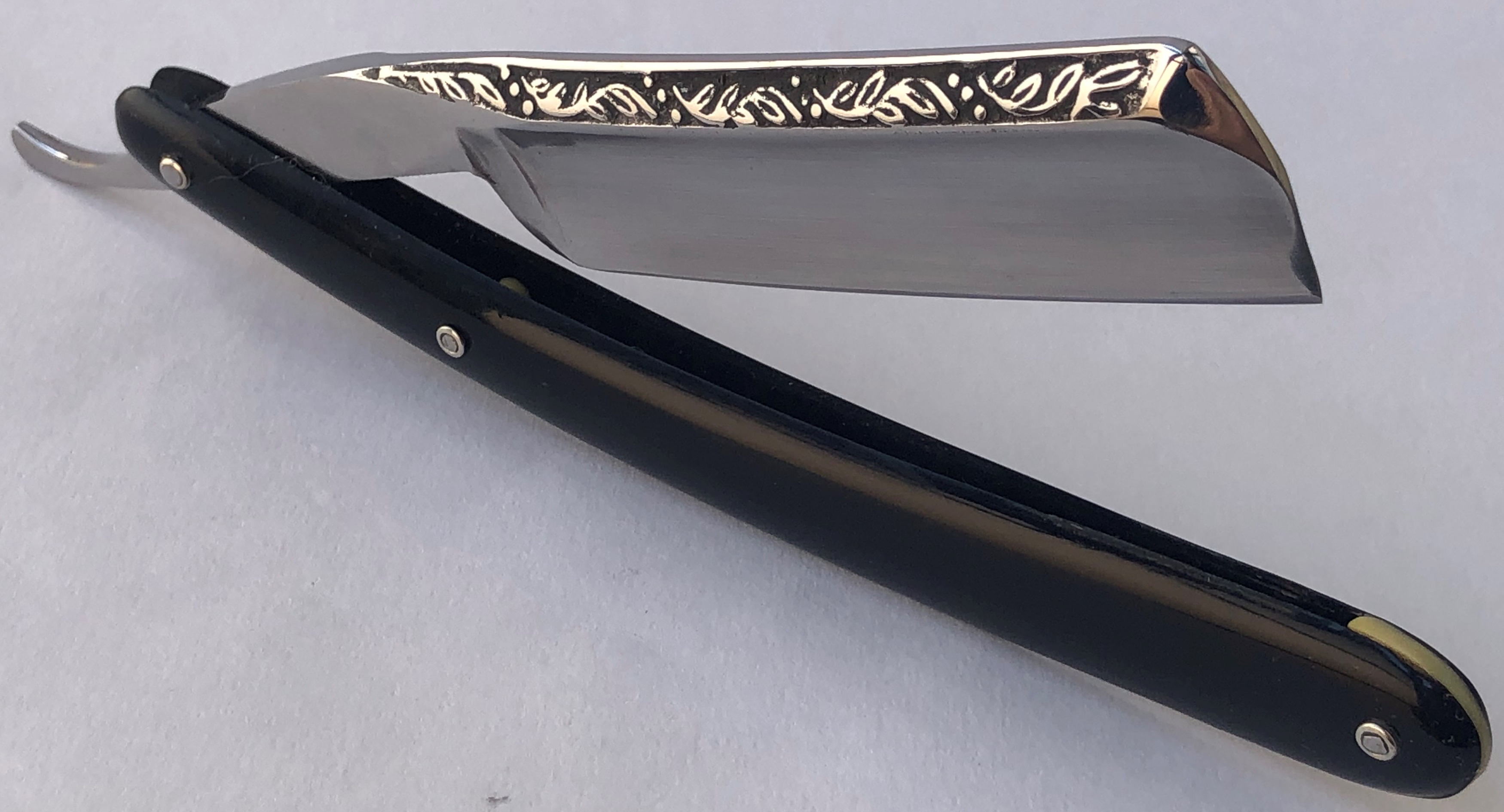 Бритва в очень хорошем малопользованном состоянии. Родная шлифовка полотна.Была разобрана,для косметических,минимальных работ.Удалось сохранить оригинальные пины и поставить заново.Добавил внутренние шайбы.Кромка равномерна по всей длине.Красивая гравировка.Удачная форма лезвия для новичка, а также пойдет и для опытного пользователя.Заточена и готова к бритью.