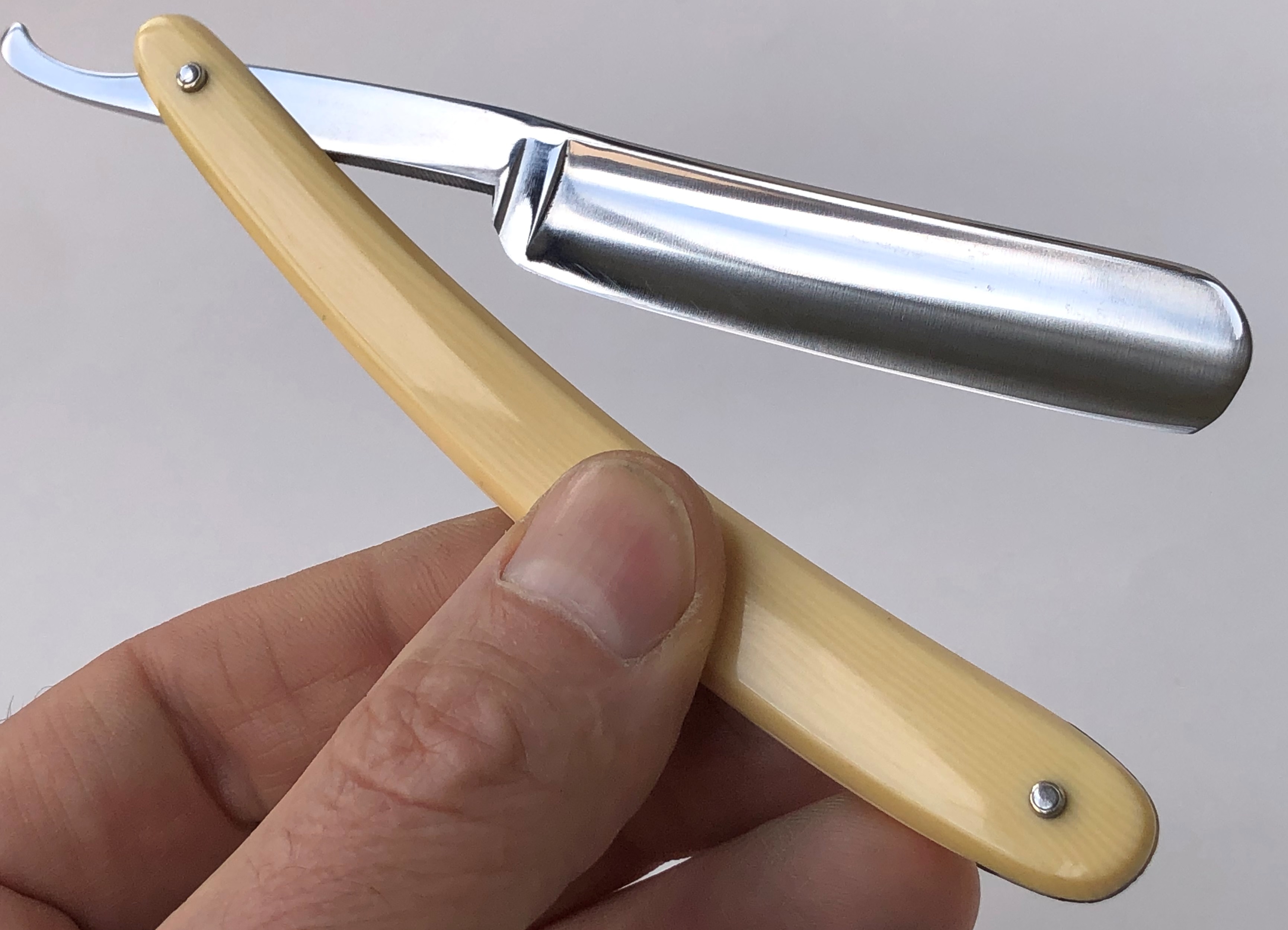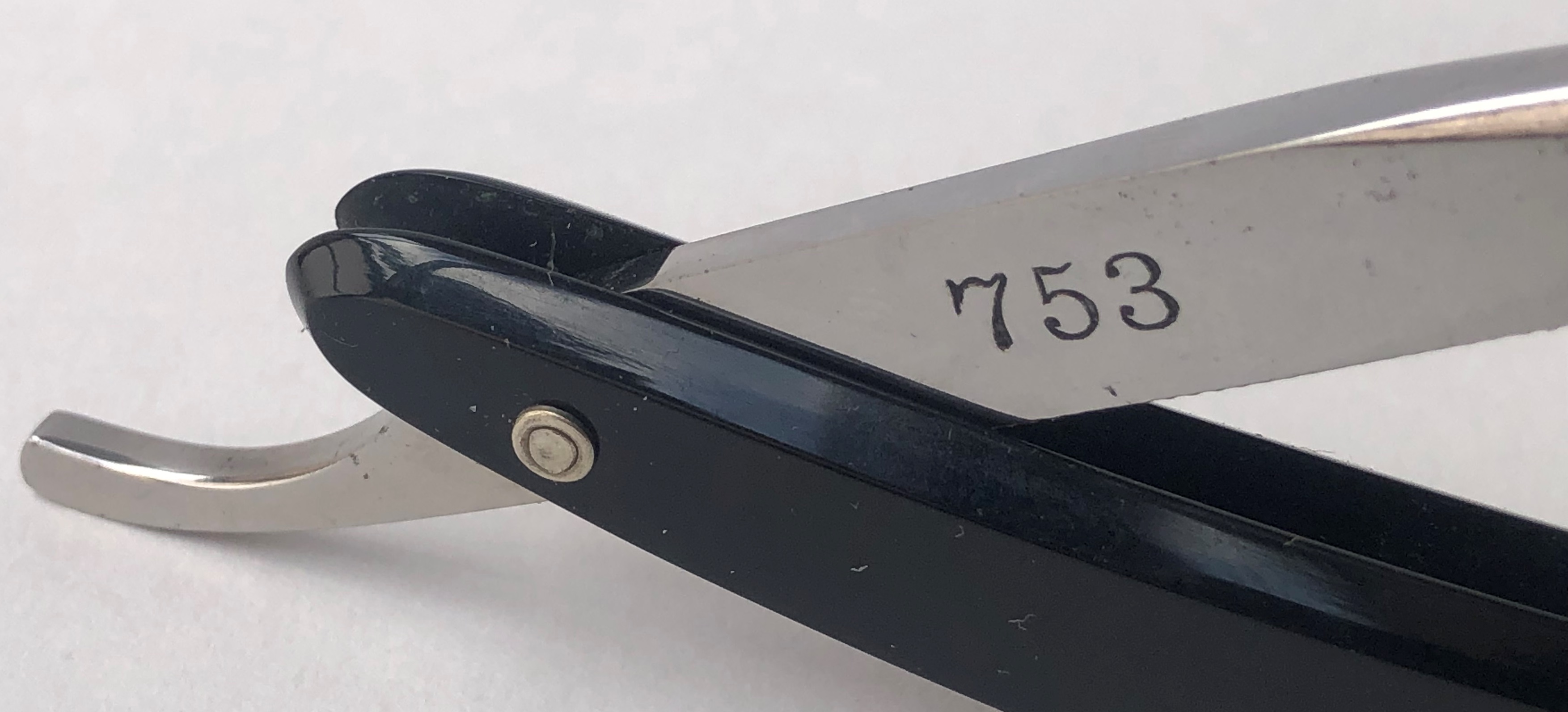 Бритва прибыла из Японии, но на японку совершенно не похожа. По всей видимости все таки немецкая.Лицевая сторона оригинальная, тут ничего не делал. Обратную сторону немного освежил от царапин и патины. Осевой перебрал , добавил внутренние шайбы и заново установил родной пин.Эффектный ажурный обушок,редко когда представленный на опасных бритвах. Идеальная геометрия полотна:кромочка равномерна по всей длине.Тяжёлая, с неплохой сталью и во целом красивая бритва. Будет заточена и подготовлена к бритью.