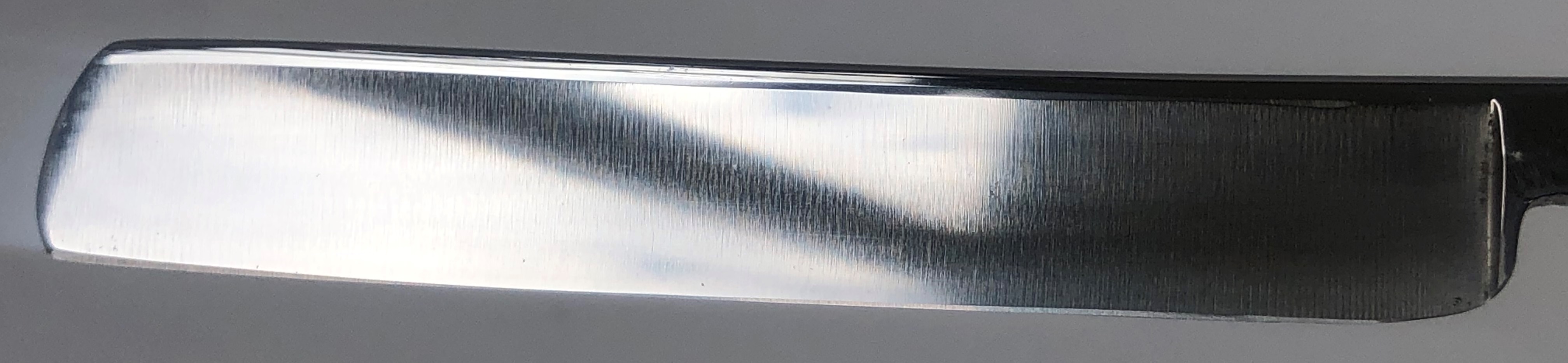 Бритва в хорошем , пользованном состоянии.Клинок был восстановлен,с сохранением вот таких шикарных "следов времени" на хвостовике-эрле.Элегантный тонкий эрль.Шлифовка и умеренная полировка. Кромка равномерна по всей длине.Геометрия клинка на уровне.Новые втулки и внутренние шайбы.В общем и целом неплохая и недорогая бритва.Заточена и готова к бритью.