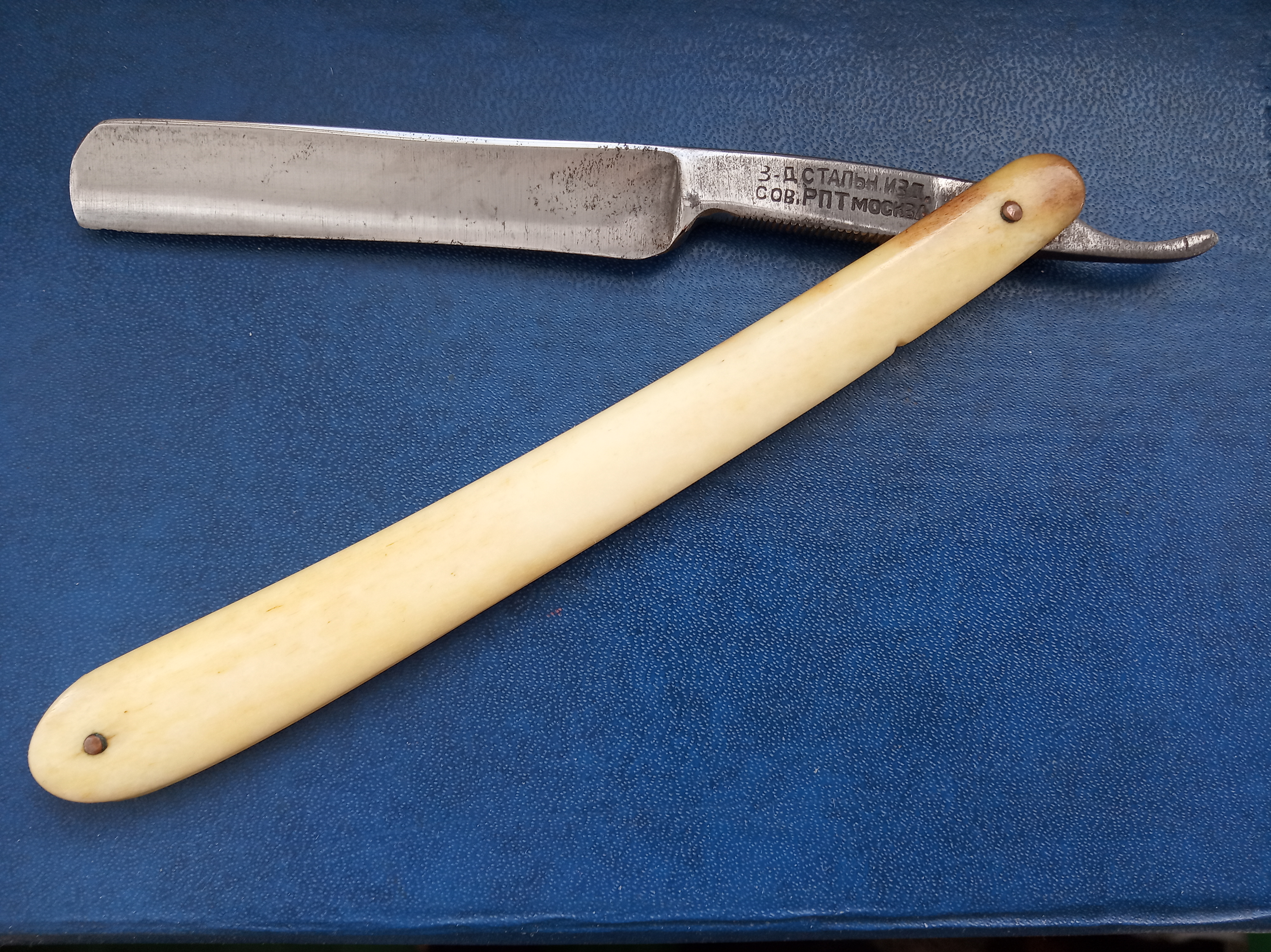 С обратной стороны на эрле №7. Ручка - кость, родная 99%. Коробка не читается, шрифт проглядывается кириллица. "Завод Стальных Изделий" Сов. Р.П.Т. Москвакоробочка - артель Бритва, 52 год, не родная