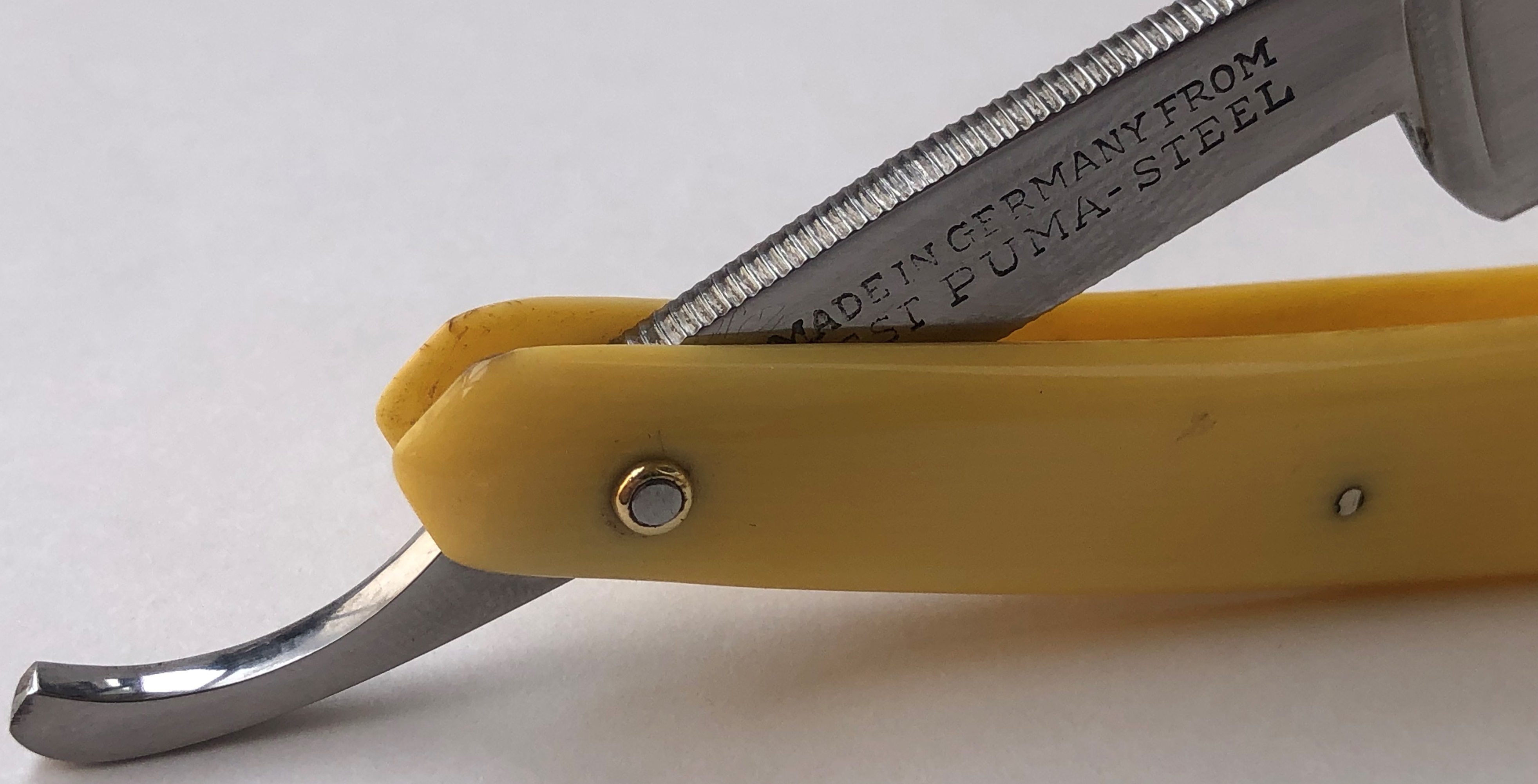 Бритва видавшая виды,но вполне живая , с допустимой шириной полотна.Утрата всего около 2-2.5 мм.Была разобрана, почищена и снова собрана, с заменой внутренних шайб и пинов.Лицевую сторону не трогал, так что немного "следов времени" имеет место быть.Кромочка равномерна по всей длине.Сталь чистая.Родная трёх-пиновая оправа в идеальном состоянии.Сам по себе бренд Пума довольно дорогой, так что не каждому по карману приобрести коллекционную вещь.В связи с этим покупка именно такого совершенно недорогого образца будет очень хорошим компромиссом,без потери качества стали и бритья.Бритва заточена и готова к бритью. Не пропустите!