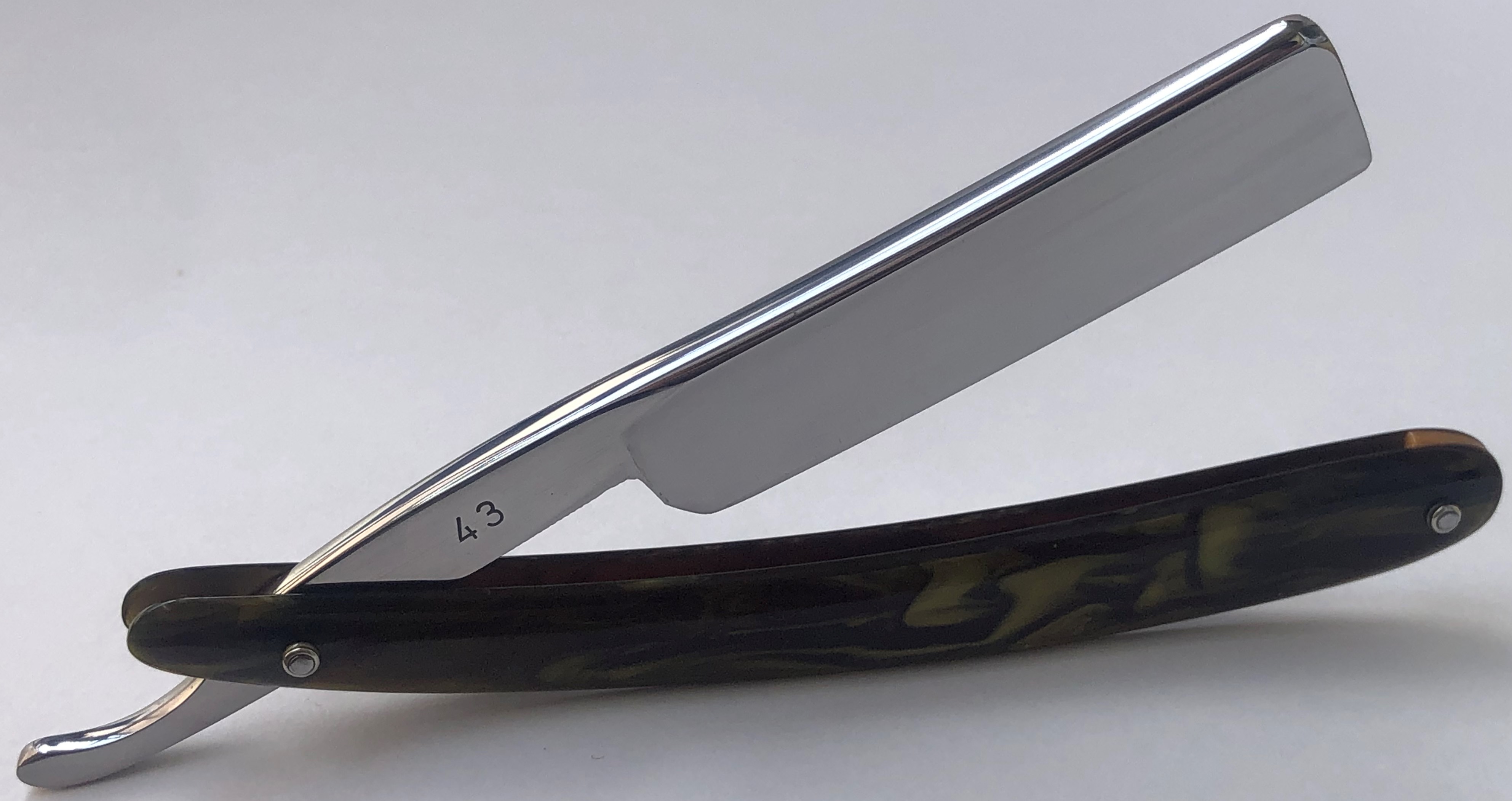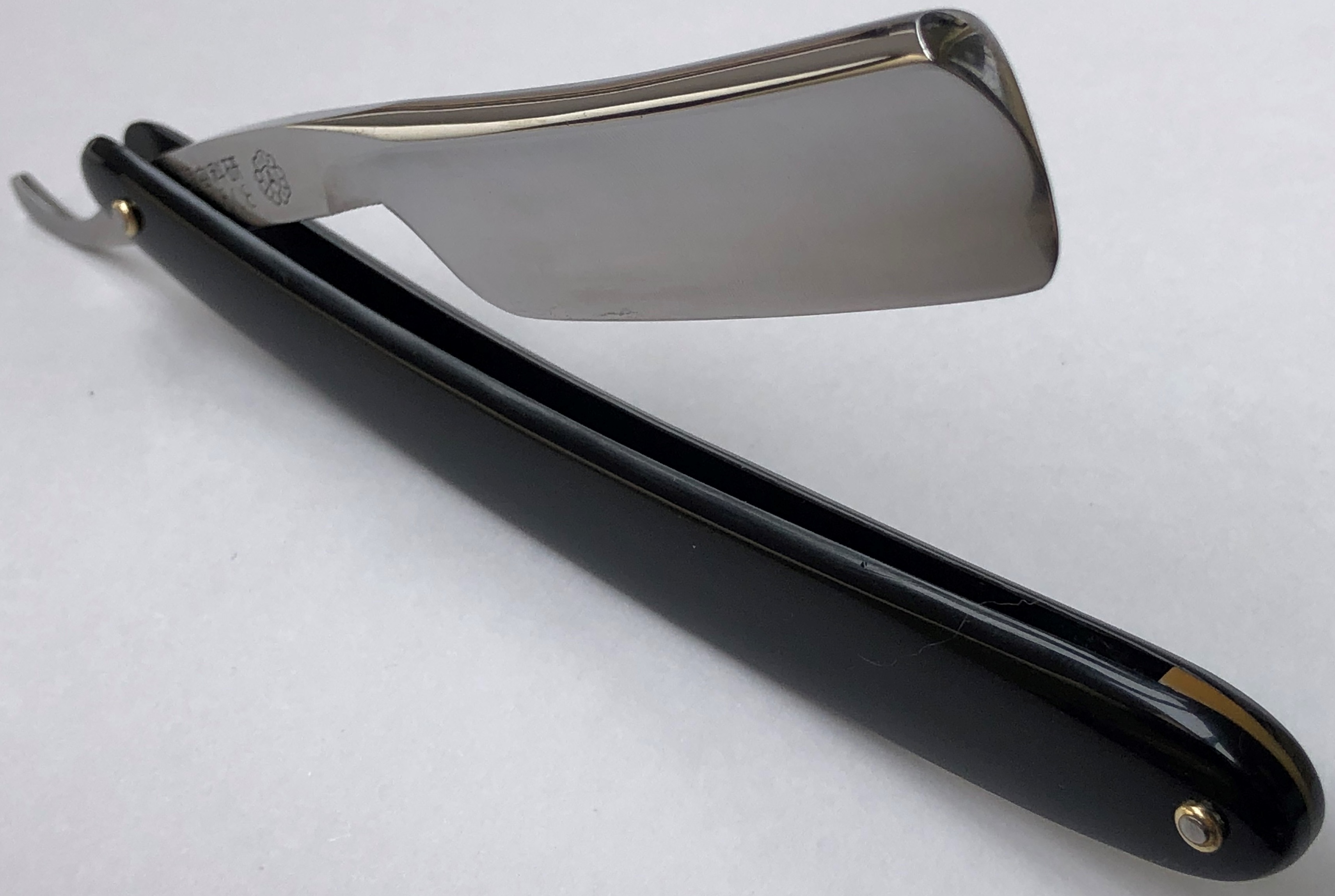 Очень интересная вещь. Никогда ничего подобного мне не попадалось.Тут имеет место быть некое сочетание традиционных, чисто японских форм,как у камисори, но с равномерный строем клинка, как у фреймов.Тем товарищам, которым не совсем удобно пользовать односторонние камисори,именно такая бритва может подойти в самый раз.По желанию,в будущем, можно будет установить накладки на ручку, из какого нибудь эффектного и красивого материала и будет еще более удобно пользоваться инструментом.Сам клинок без следов пользования. Полотно имеет идеальную геометрию:кромочка равномерна по всей длине.Тут, как и на всех бритвах этого ординарного бренда, очень хорошая и способна выдавать чистое и мягкое бритьё.