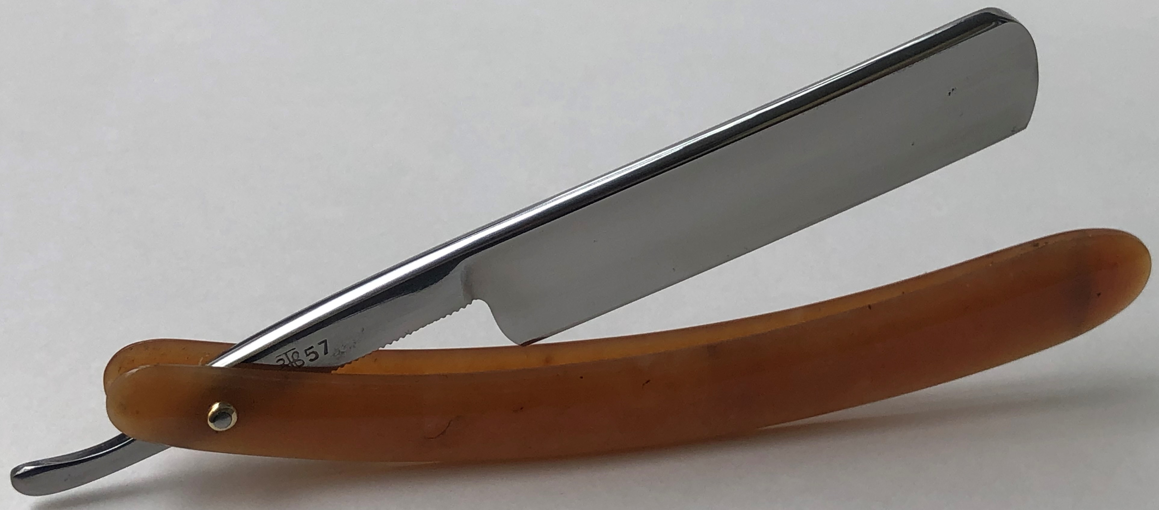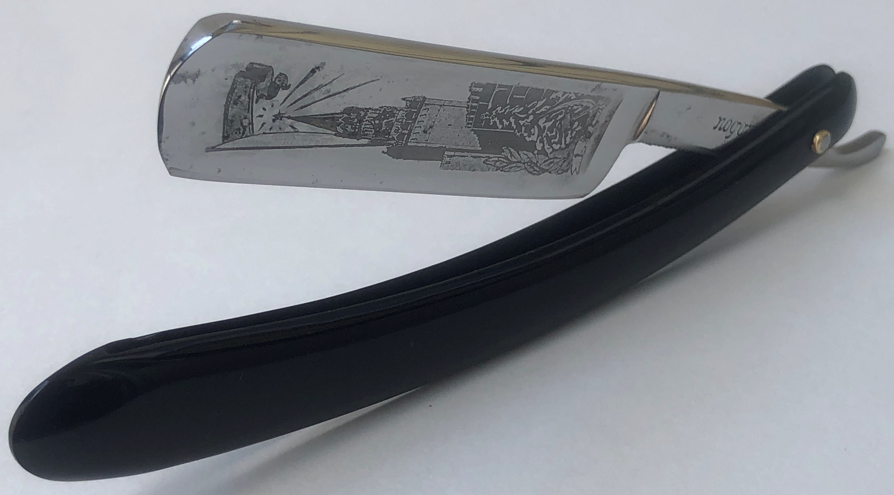 Бритва в более редком исполнении,с гравировкой инициалов мастера.Совершенно не тронута временем и заточными камнями. Как вчера с завода.Исключительный сохран для своих 60+ лет.