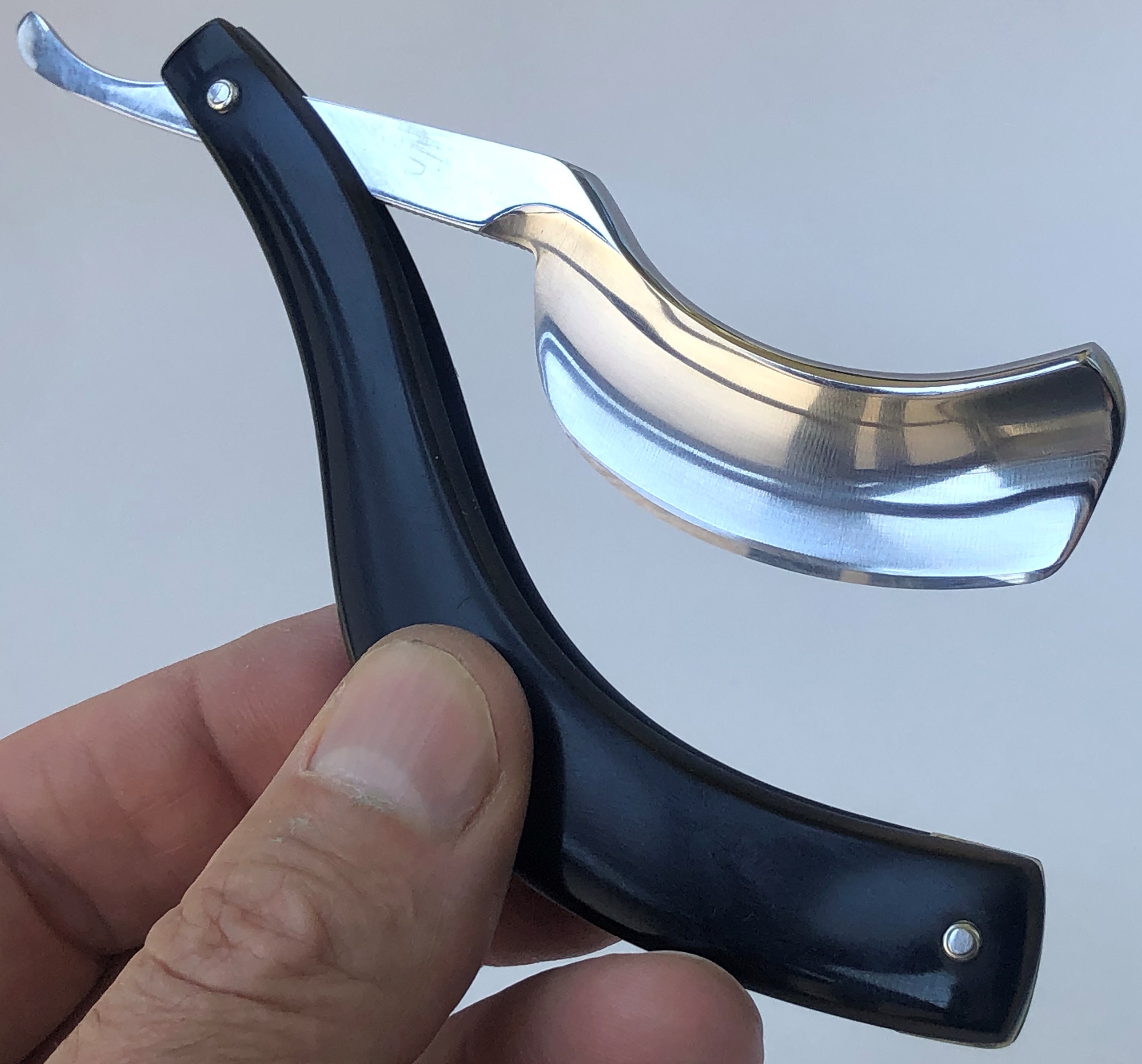 Очень интересная вещь. Никогда ничего подобного мне не попадалось.Тут имеет место быть некое сочетание традиционных, чисто японских форм,как у камисори, но с равномерный строем клинка, как у фреймов.Тем товарищам, которым не совсем удобно пользовать односторонние камисори,именно такая бритва может подойти в самый раз.По желанию,в будущем, можно будет установить накладки на ручку, из какого нибудь эффектного и красивого материала и будет еще более удобно пользоваться инструментом.Сам клинок без следов пользования. Полотно имеет идеальную геометрию:кромочка равномерна по всей длине.Тут, как и на всех бритвах этого ординарного бренда, очень хорошая и способна выдавать чистое и мягкое бритьё.