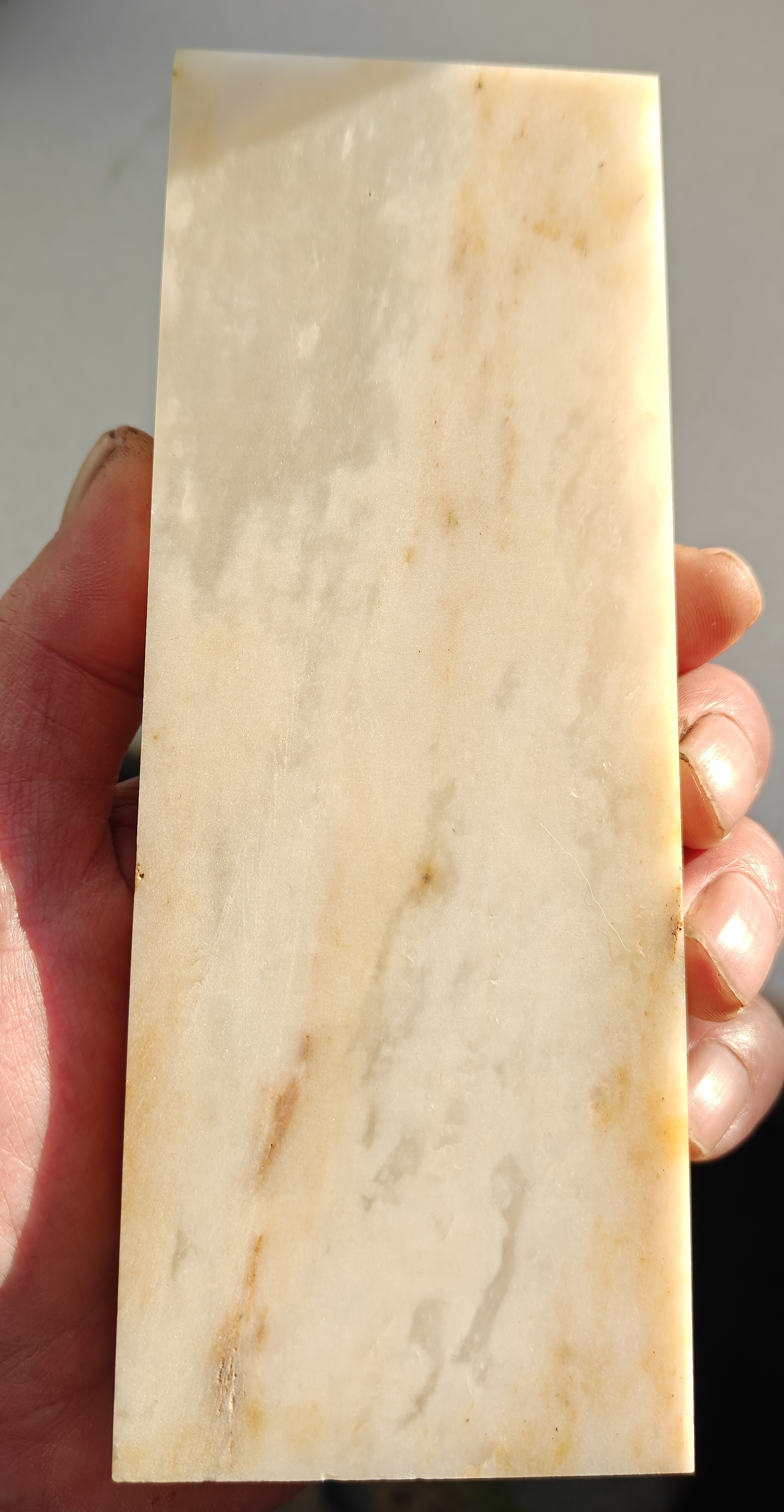 Белоречит. Русский АрканзасПодтверждаю ) Иван просил написать по работе данных камней, я попытаюсь, но прошу не судить меня строго, это мой первый натуральный камень, да еще и сразу масляный. Пока свежие впечатления: Мне сначала было сложно понять что камень работает, потому что сначала слишком мало масла нанес, потом когда немного добавил и излишки снял салфеткой (так наверно проще подбирать слой или потом с опытом придет) появился внятный тактильный отклик и визуально появляется шлам, думаю если следить за количеством масла, то времени потребуется не так много как мне ). Бритву точу первый раз, сразу после 3000 суехиро на более грубую сторону (Иван, я не запомнил на каком зерне притирка сторон) после 20 минут работы понял что что то не то, никак не выйду на кромку. Посмотрел в лупу на отблески и увидел что недоработал на предыдущем этапе, пришлось вернуться. После проработки повторной на 3000 на грубой стороне Белоречита работал минут 15-20 что бы выйти на кромку. Потом помыл бритву, перевернул на финиш, опять подбор масла сначала мало, потом побольше, снял лишнее салфеткой. Первый проход показал что движение бритвы более легкое на тонкой стороне, но отклик все же остается, слабенький, но есть. После 10-15 минут работы бритва режет волос на предплечье в 1,5 см от корня. Как бритье с ним, узнаю завтра, отчитаюсь после.