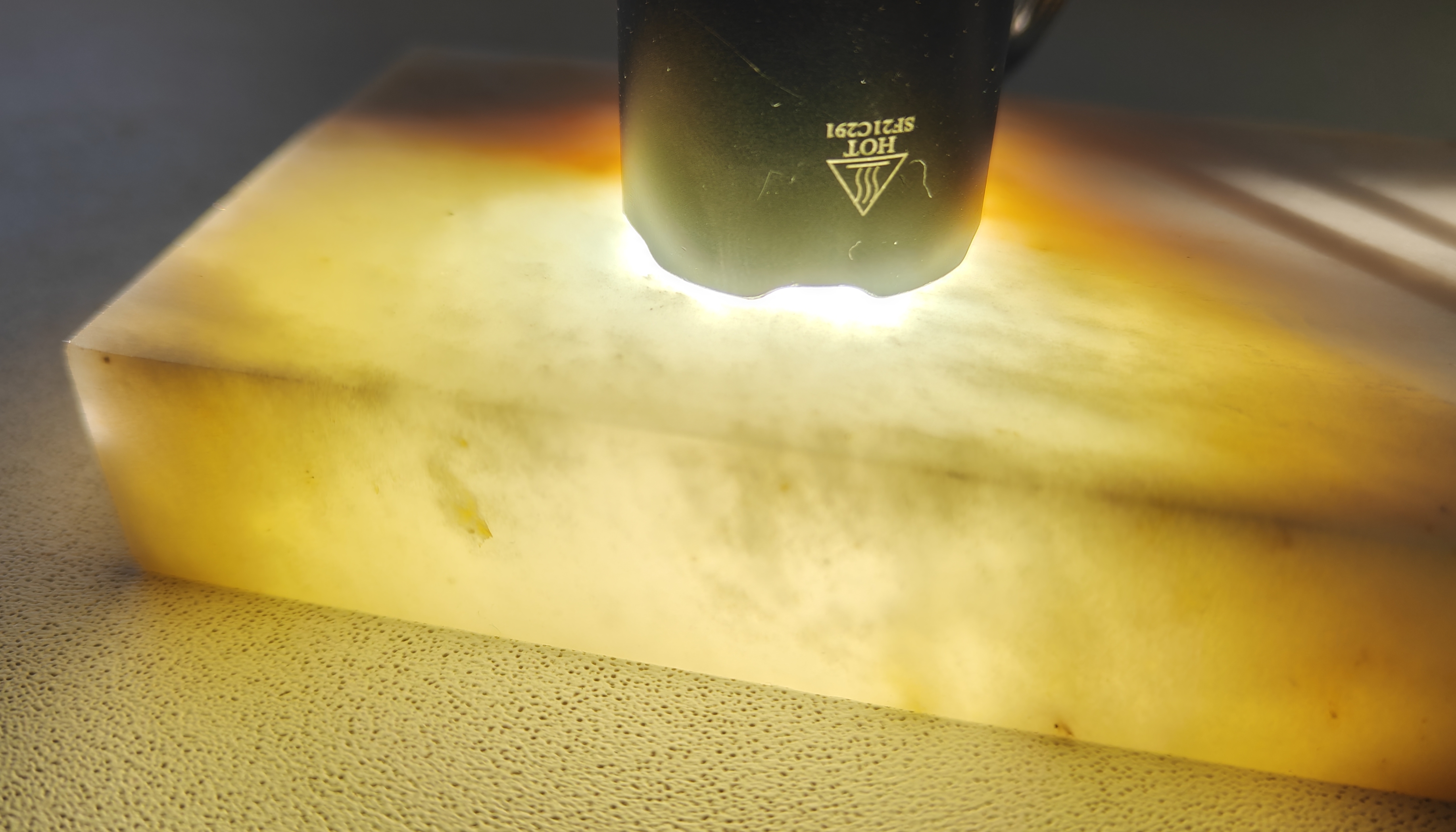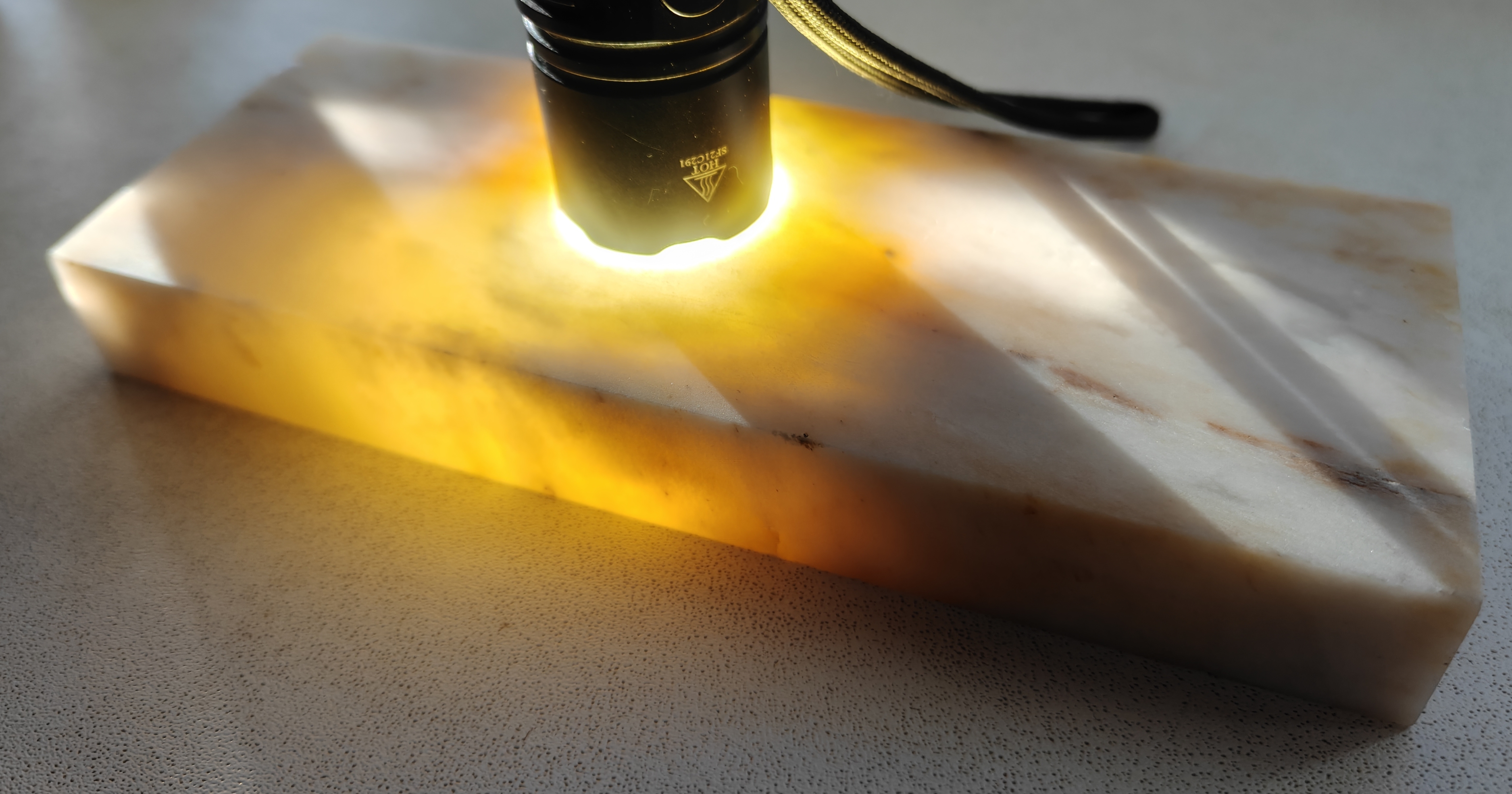 Телефон со включенным LED-фонарем приложен вплотную к камню. Толщина камня 25 мм.
