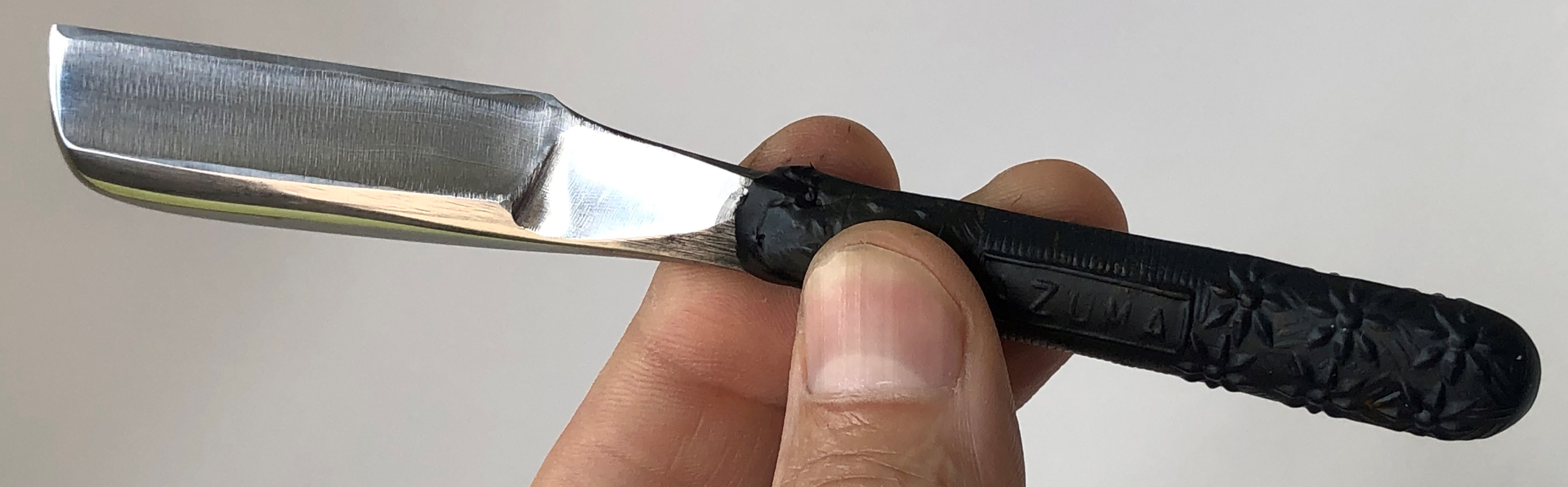Очень интересная вещь. Никогда ничего подобного мне не попадалось.Тут имеет место быть некое сочетание традиционных, чисто японских форм,как у камисори, но с равномерный строем клинка, как у фреймов.Тем товарищам, которым не совсем удобно пользовать односторонние камисори,именно такая бритва может подойти в самый раз.По желанию,в будущем, можно будет установить накладки на ручку, из какого нибудь эффектного и красивого материала и будет еще более удобно пользоваться инструментом.Сам клинок без следов пользования. Полотно имеет идеальную геометрию:кромочка равномерна по всей длине.Тут, как и на всех бритвах этого ординарного бренда, очень хорошая и способна выдавать чистое и мягкое бритьё.