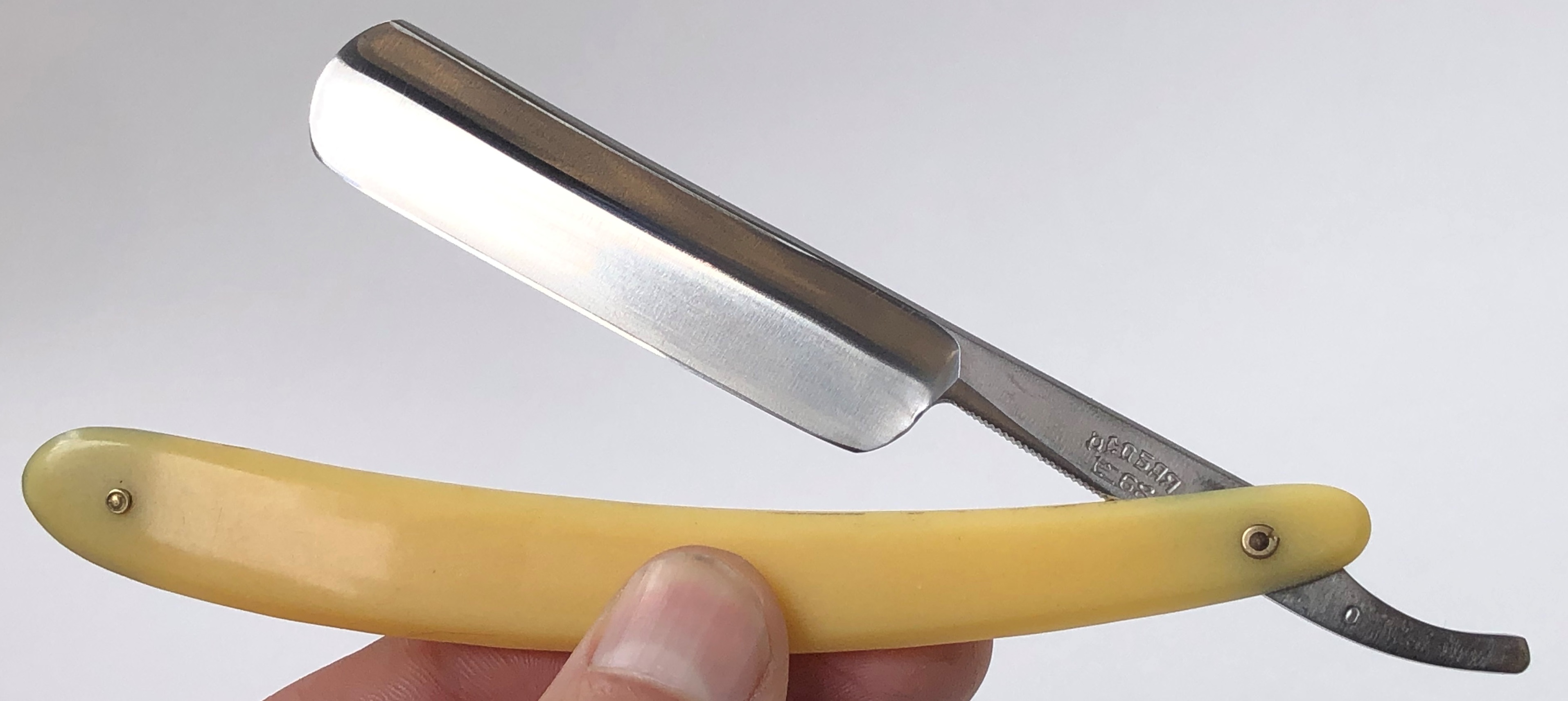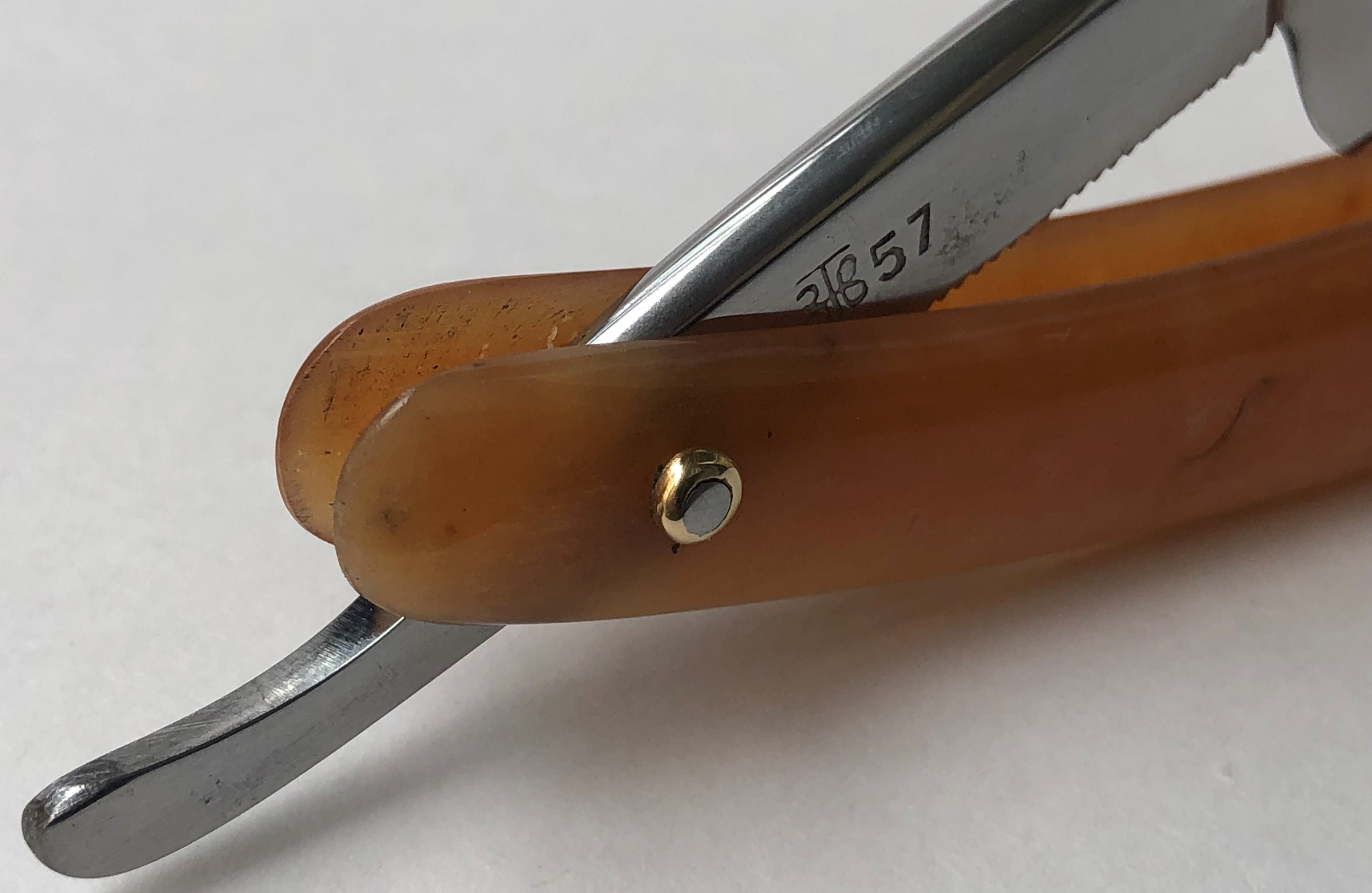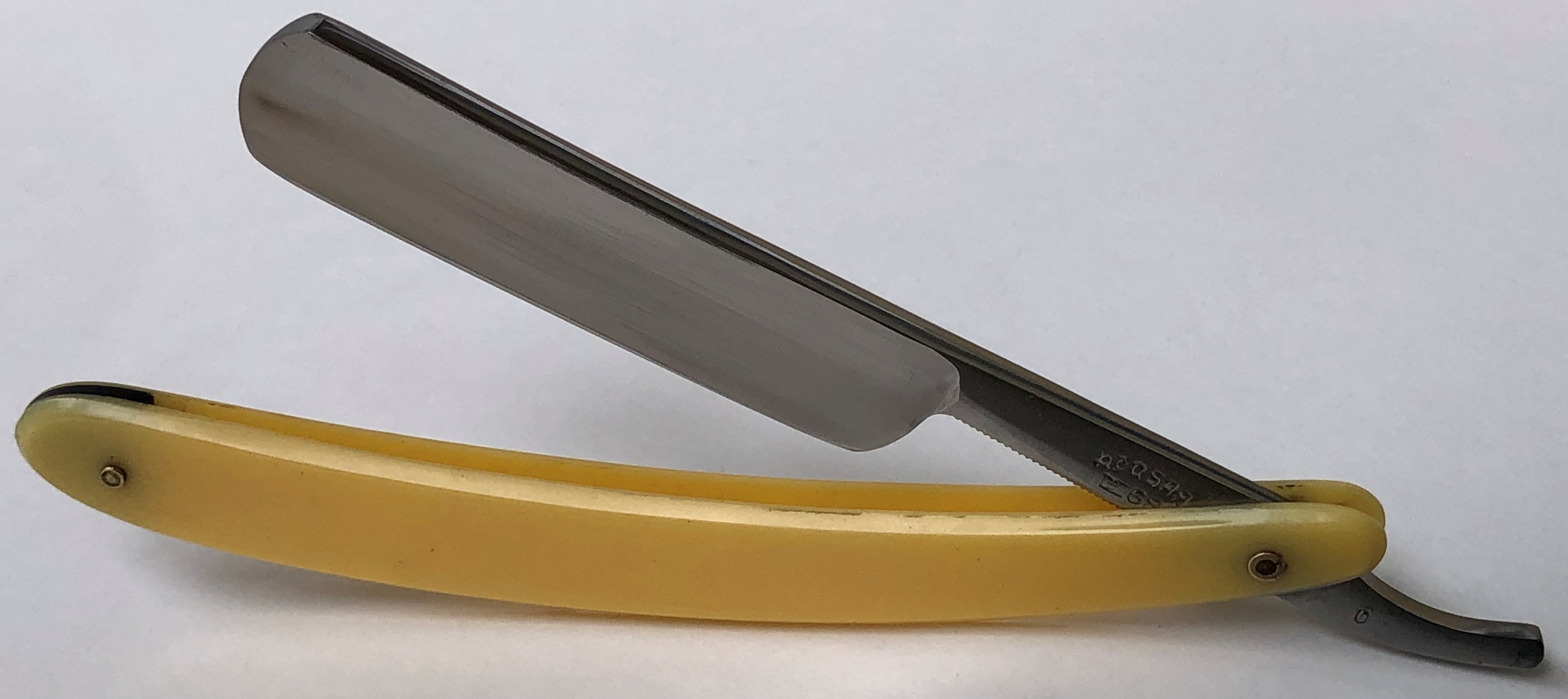 Бритва в более редком исполнении,с гравировкой инициалов мастера.Совершенно не тронута временем и заточными камнями. Как вчера с завода.Исключительный сохран для своих 60+ лет.