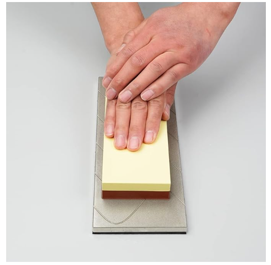 Выравнивание и доведение камняСтарая пластина DMT (твердая капец) и водная шкурка WPF MIRKA 150-200 единиц под струёй воды. Шкурки раз на 10 хватает...