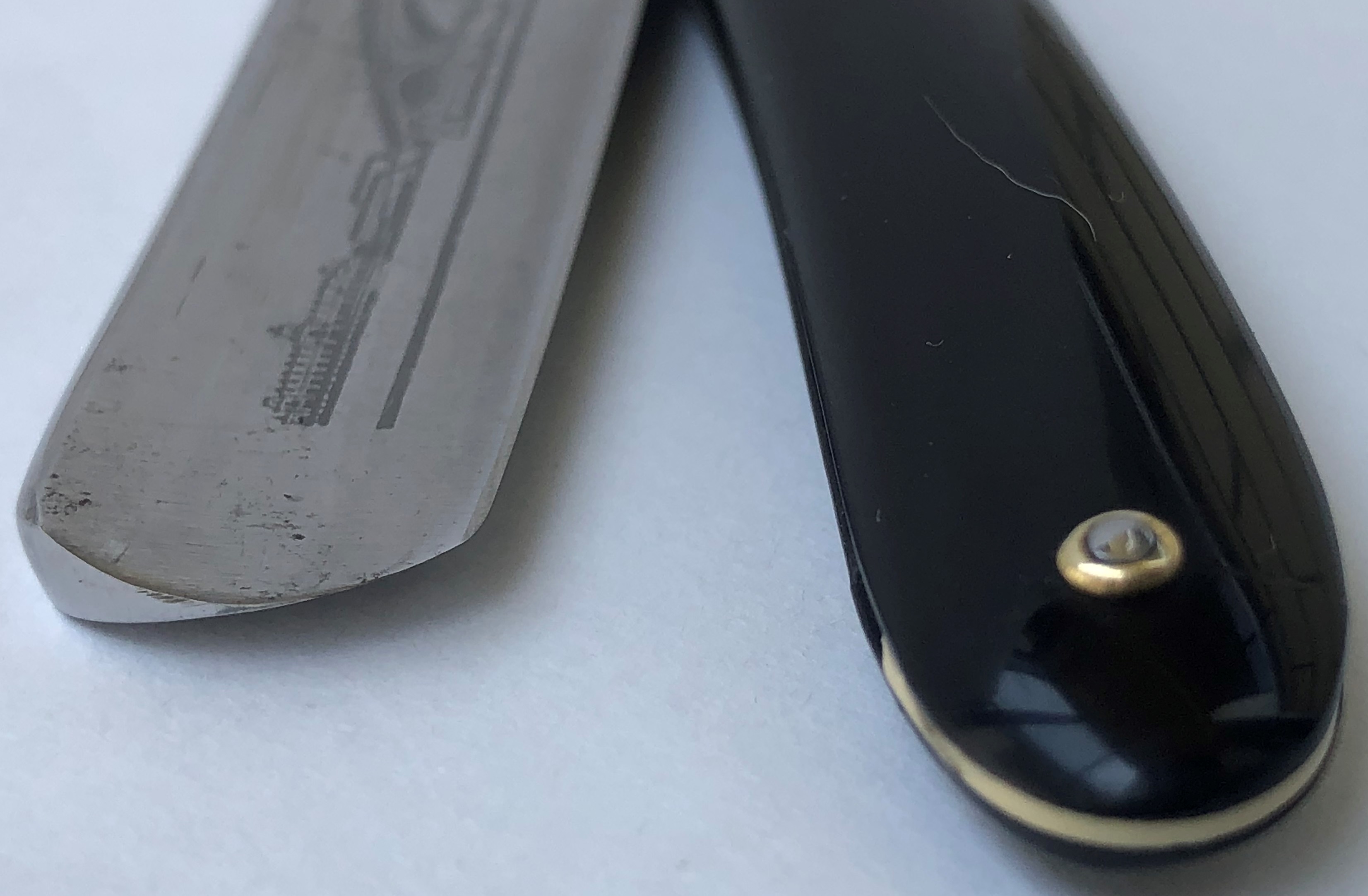 Клинок в очень хорошем состоянии, без износа обушка. По всей видимости это ее родная форма и размер.Ажурный обушок. Кромочка равномерна по всей длине.Оправу заменил на более крупную и надежную, с такой оригинальной формой плашек.(небольшую трещинку надёжно проклеил с обеих сторон, так что сейчас все надёжно).Получилась аккуратная, миниатюрная и удобная бритовка, не только для бритья, но также для коррекции усов и бороды.Заточена и готова к бритью.