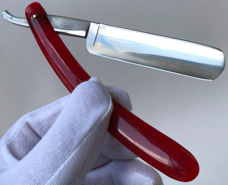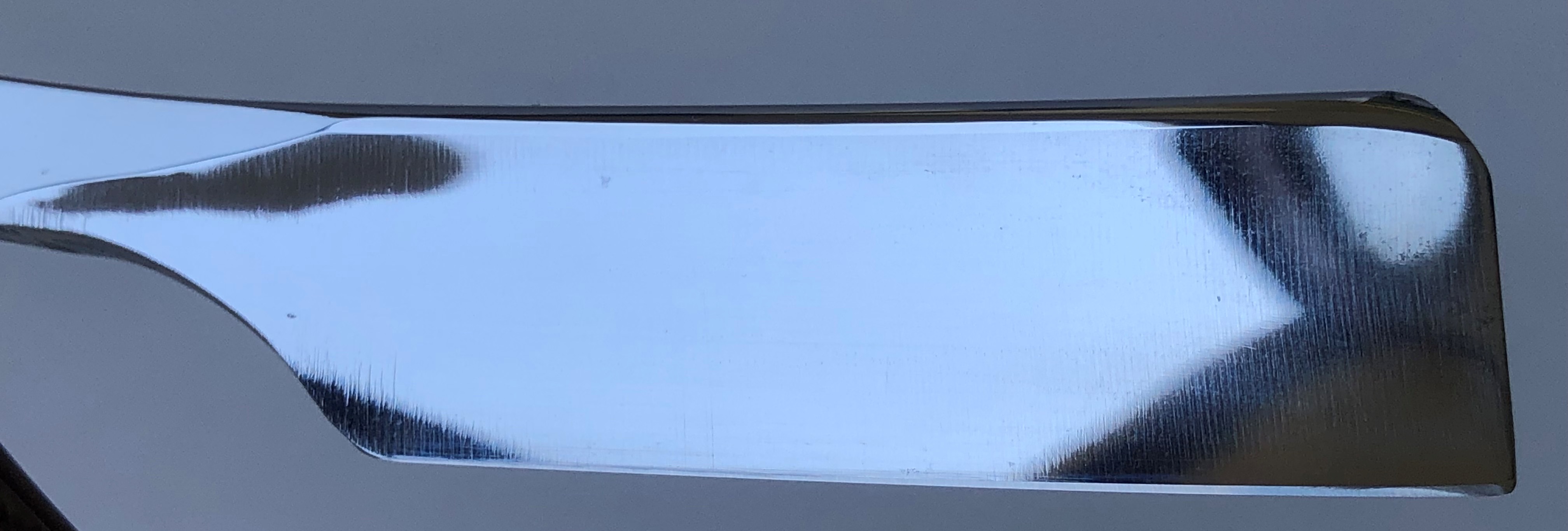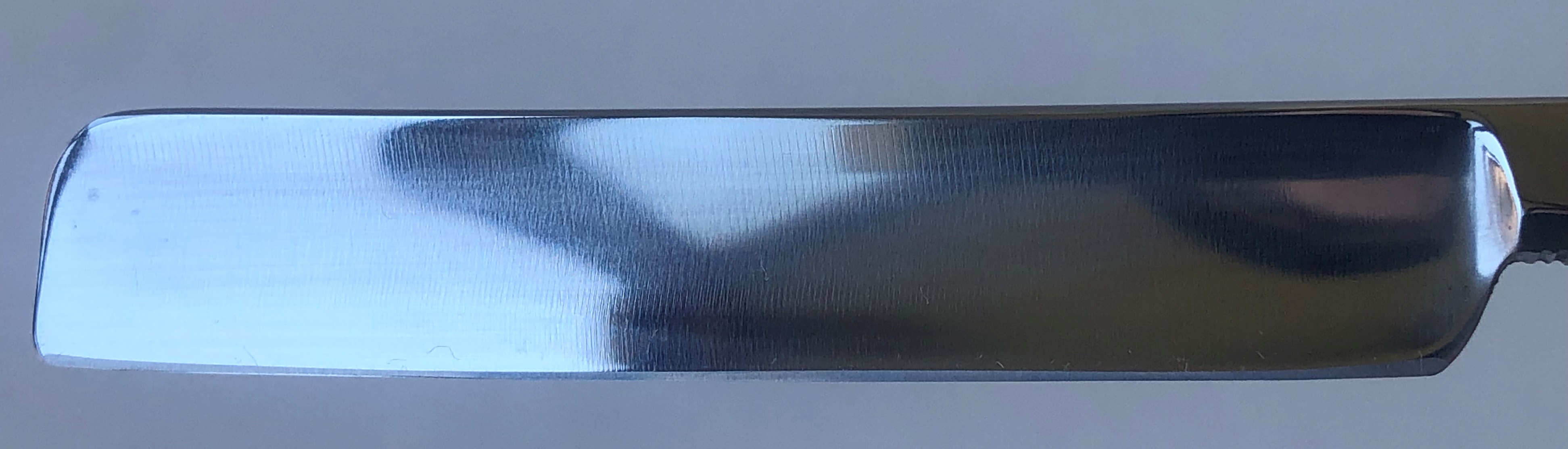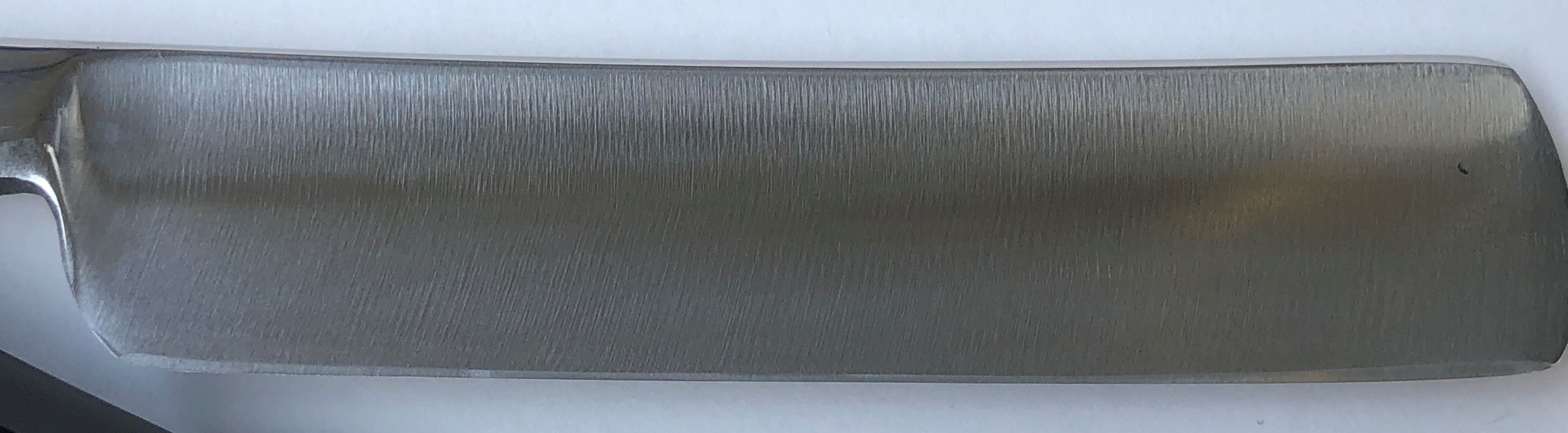 Бритва совершенно нетронутая,была только оттерта от остатков масла с консервации. Ничего не разбиралось и не ремонтировалось.Идеальная геометрия полотна:кромка равномерна по всей длине.Сталь чистая, без критичных и видимых дефектов.Бритва заточена и готова к бритью.