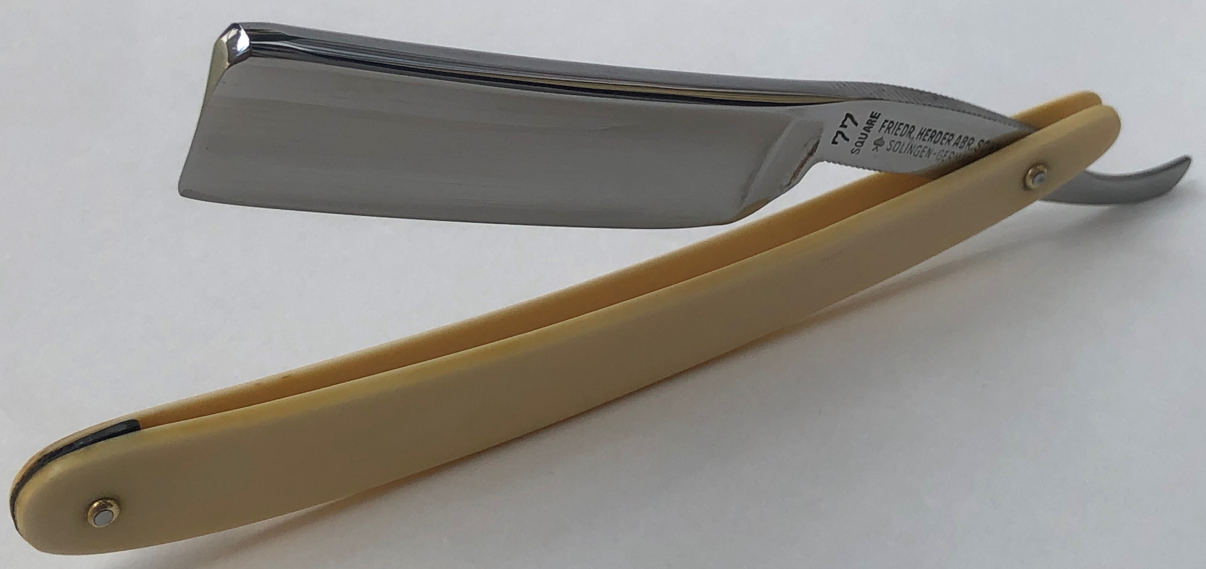 Клинок находится в очень хорошем и малопользованном состоянии.Возможно, что вообще в пользовании не был.Ничего с клинком не делал, разве что немного полиролью освежил. Небольшое пятнашко окисления осталось, но не стал вычищать, так как оно никоим образом не повлияет на дальнейшую эксплуатацию бритвы, а также не хотелось портить оригинальный вид лицевой стороны полотна.Идеальная геометрия :кромочка равномерна по всей длине и еле заметна.Родную сломанную ручку поменял на более крупную, от другого немецкого старинного донора.Новые шайбы и втулки.Приятная и аккуратная бритва как для коррекции усов и бороды, а также и для бритья. Не пропустите известную немку по цене обычной советской бритвы.