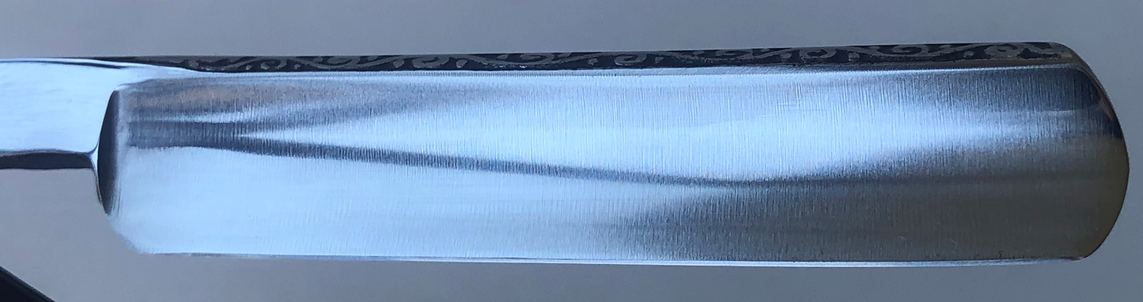 Бритва совершенно нетронутая,была только оттерта от остатков масла с консервации. Ничего не разбиралось и не ремонтировалось.Идеальная геометрия полотна:кромка равномерна по всей длине.Сталь чистая, без критичных и видимых дефектов.Бритва заточена и готова к бритью.