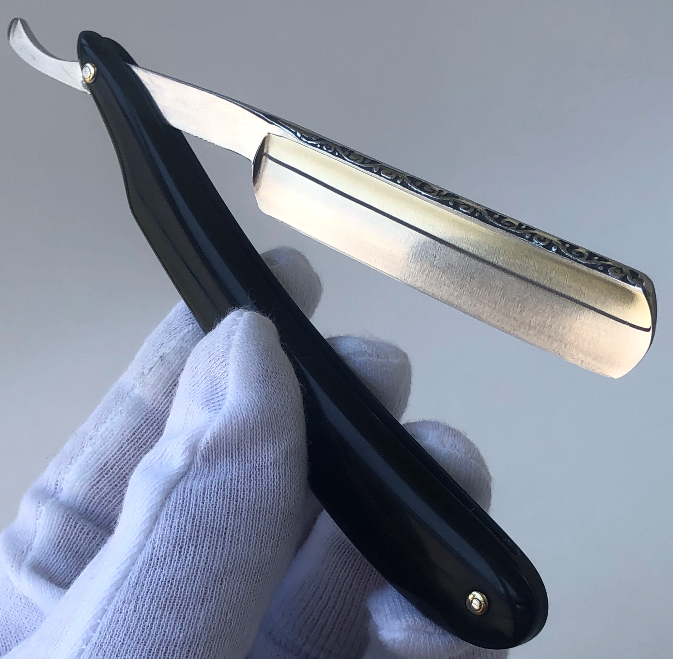 Клинок находится в очень хорошем и малопользованном состоянии.Возможно, что вообще в пользовании не был.Ничего с клинком не делал, разве что немного полиролью освежил. Небольшое пятнашко окисления осталось, но не стал вычищать, так как оно никоим образом не повлияет на дальнейшую эксплуатацию бритвы, а также не хотелось портить оригинальный вид лицевой стороны полотна.Идеальная геометрия :кромочка равномерна по всей длине и еле заметна.Родную сломанную ручку поменял на более крупную, от другого немецкого старинного донора.Новые шайбы и втулки.Приятная и аккуратная бритва как для коррекции усов и бороды, а также и для бритья. Не пропустите известную немку по цене обычной советской бритвы.
