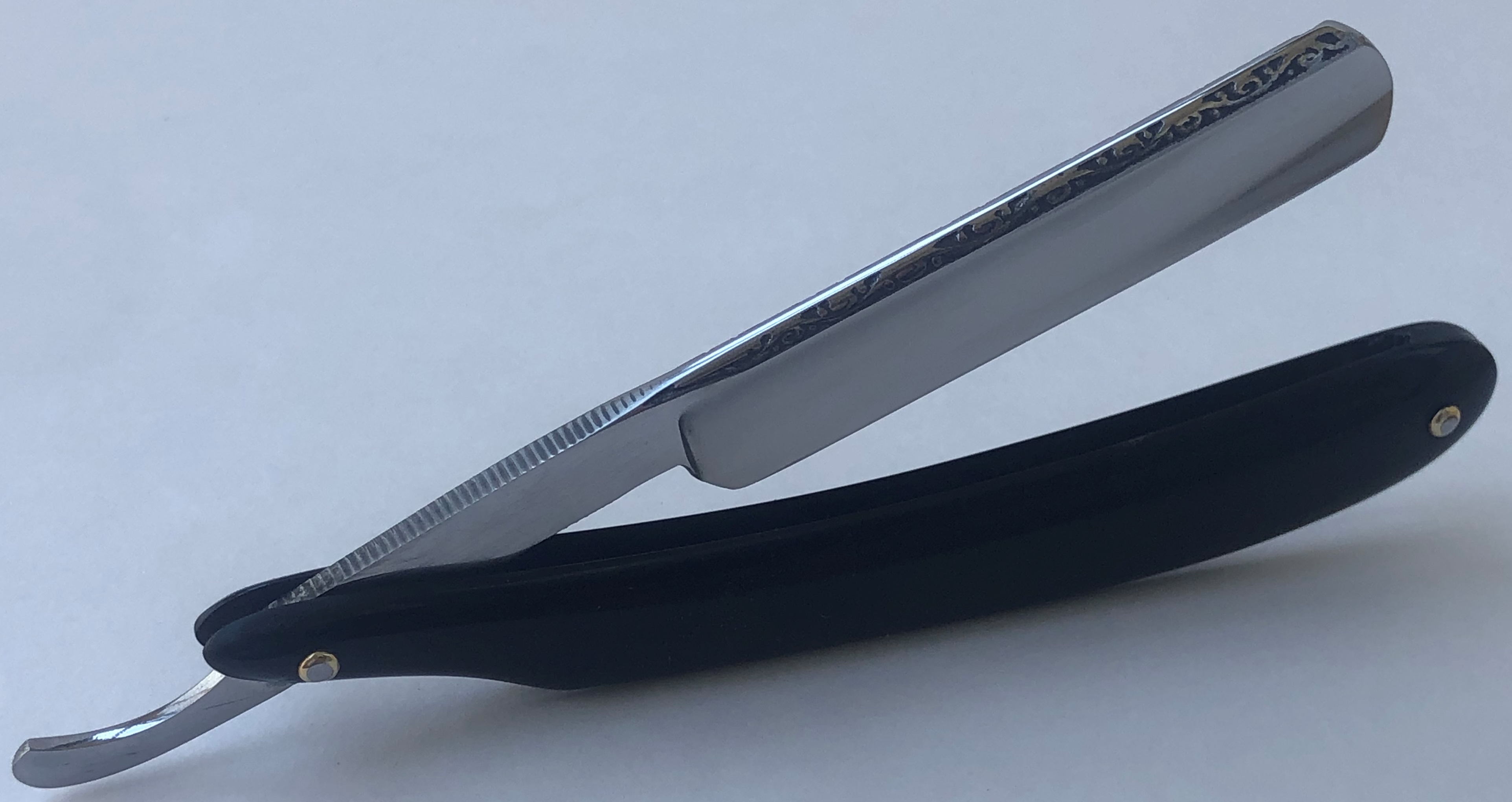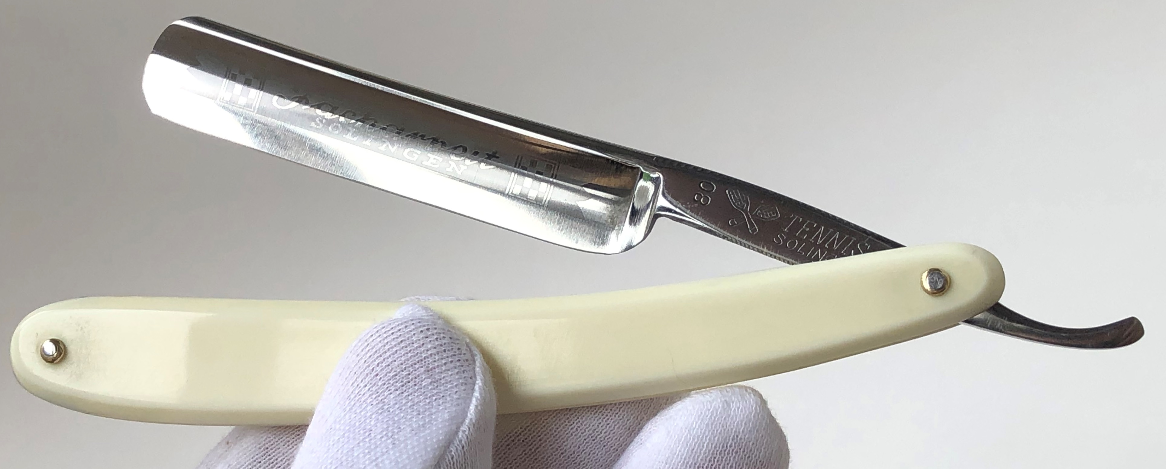 Клинок находится в очень хорошем и малопользованном состоянии.Возможно, что вообще в пользовании не был.Ничего с клинком не делал, разве что немного полиролью освежил. Небольшое пятнашко окисления осталось, но не стал вычищать, так как оно никоим образом не повлияет на дальнейшую эксплуатацию бритвы, а также не хотелось портить оригинальный вид лицевой стороны полотна.Идеальная геометрия :кромочка равномерна по всей длине и еле заметна.Родную сломанную ручку поменял на более крупную, от другого немецкого старинного донора.Новые шайбы и втулки.Приятная и аккуратная бритва как для коррекции усов и бороды, а также и для бритья. Не пропустите известную немку по цене обычной советской бритвы.