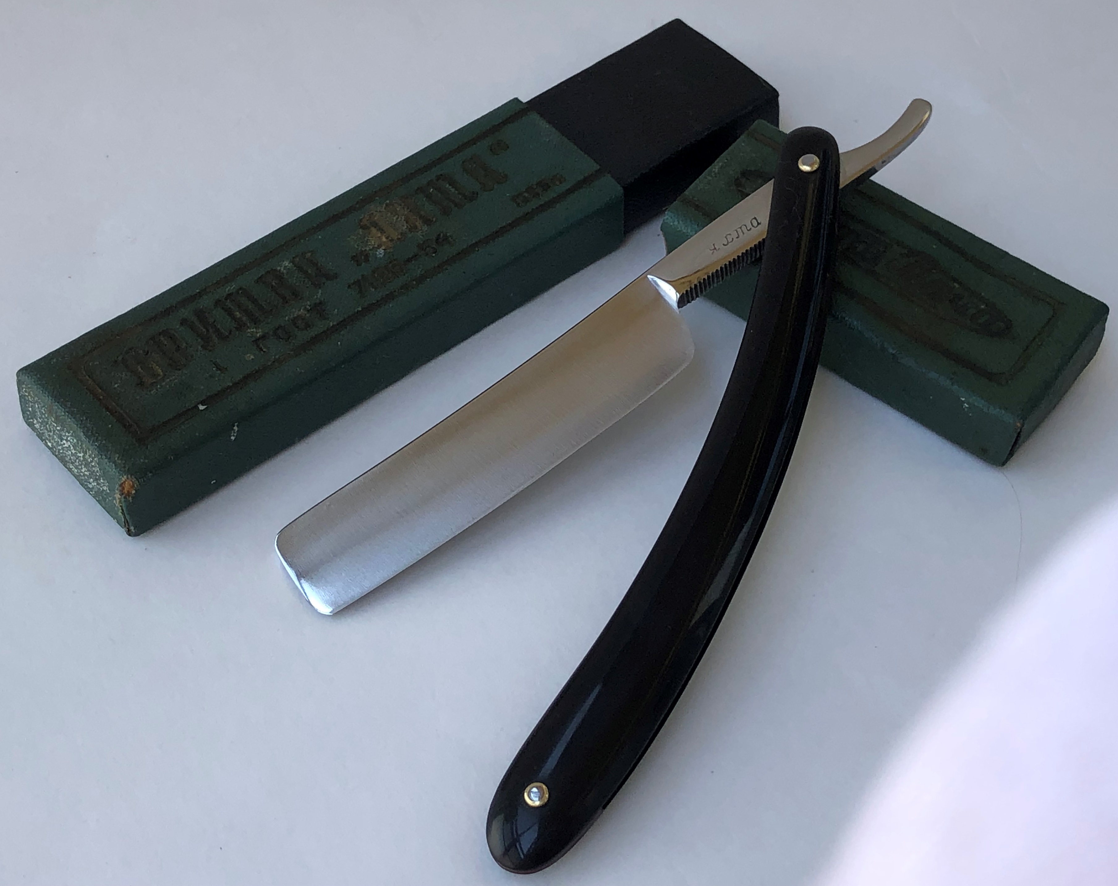 Бритва в пользовании не была. Была разобрана, для приведения минимальных, косметических работ.Аля "заводской" гринд попытался тоже повторить. Умеренная шлифовка и полировка клинка.Новые втулки,с добавлением внутренних шайб, для улучшения осевой конструкции.Кромочка равномерна по всей длине и еле заметна. Родная коробочка 1955 года!