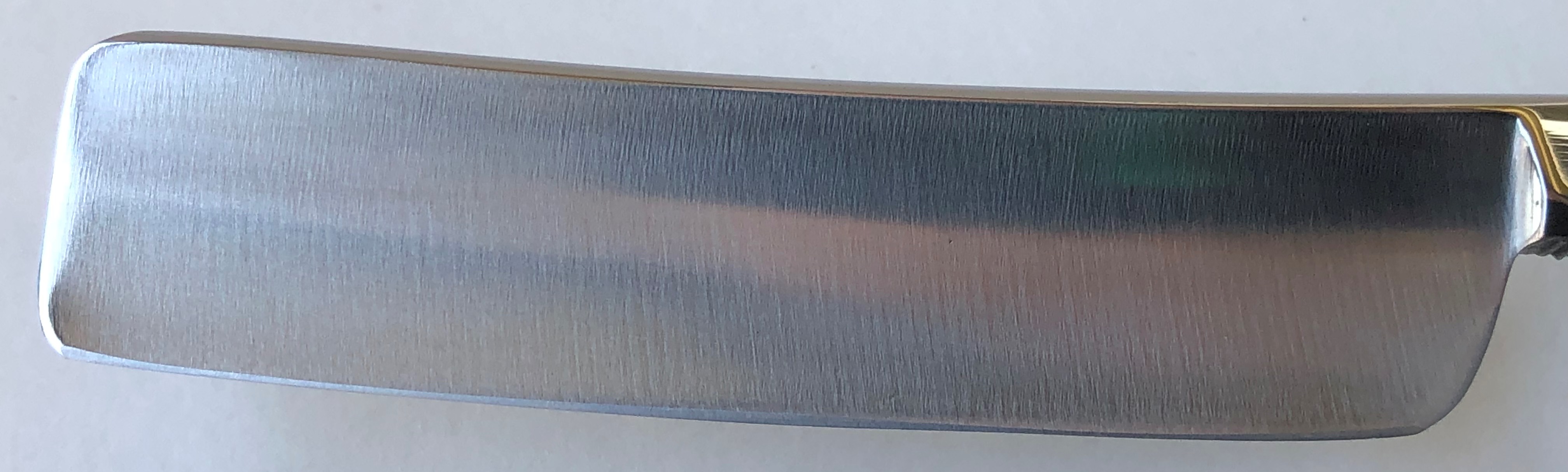 Бритва в пользовании не была, но нуждалась в чистке и полировке. Небольшое количество "следов времени" осталось, но никоим образом не повлияют на дальнейшую эксплуатацию.Комбинированная продольно-поперечная шлифовка.Новые втулки и внутренние шайбы. Идеальная геометрия полотна:кромочка равномерна по всей длине и еле заметна.