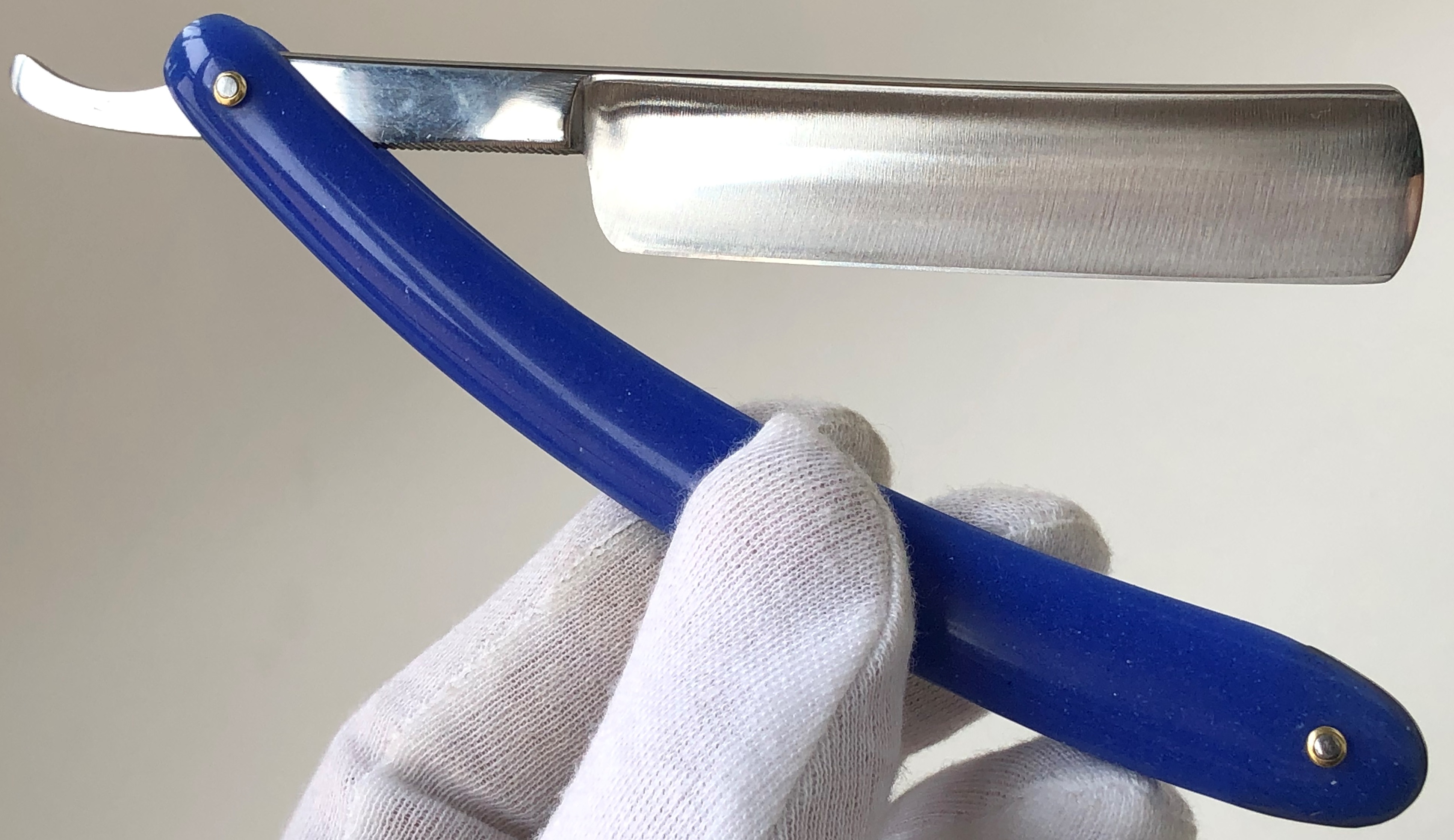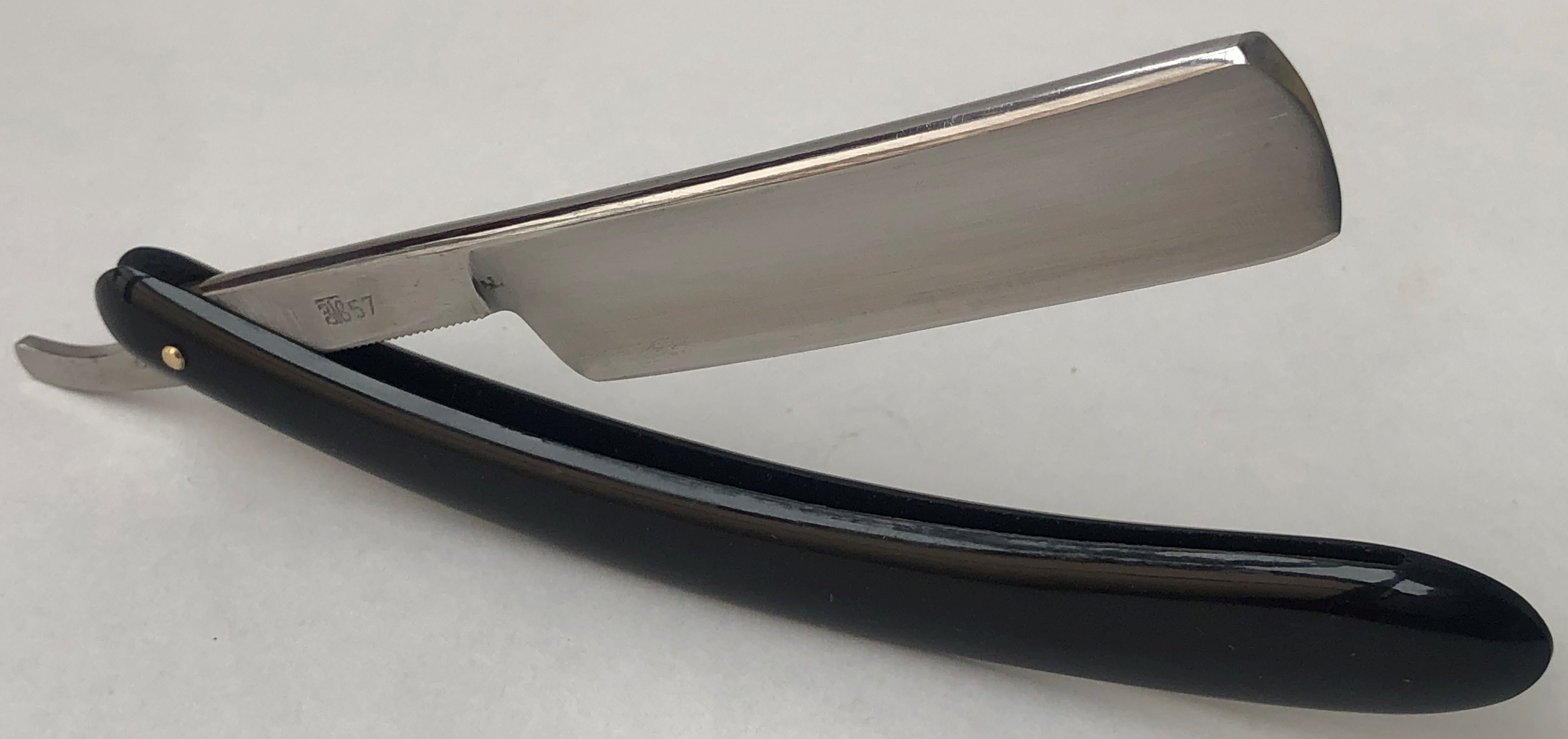 Бритвы данного бренда были как полноразмерные, так и укороченные.Тут имеет место быть как раз укороченная тяжёлая,парикмахерская бритва.Состояние близко к идеальному. Родная шлифовка клинка! Бритва была перебрана, для удаления "следов времени" в районе осевого механизма.Родные пины были заменены на более эффективные двух-цветные втулки , а также добавлены внутренние шайбы.Умеренная полировка.Идеальная геометрия клинка:кромочка равномерна по всей длине и еле заметна.Оригинальная форма клинка для более удобного хвата при бритье, а укороченная РК также прекрасно работает с проблемными и менее доступными участками лица. Серьёзная, с отличной сталью, парикмахерская бритва. Не пропустите!