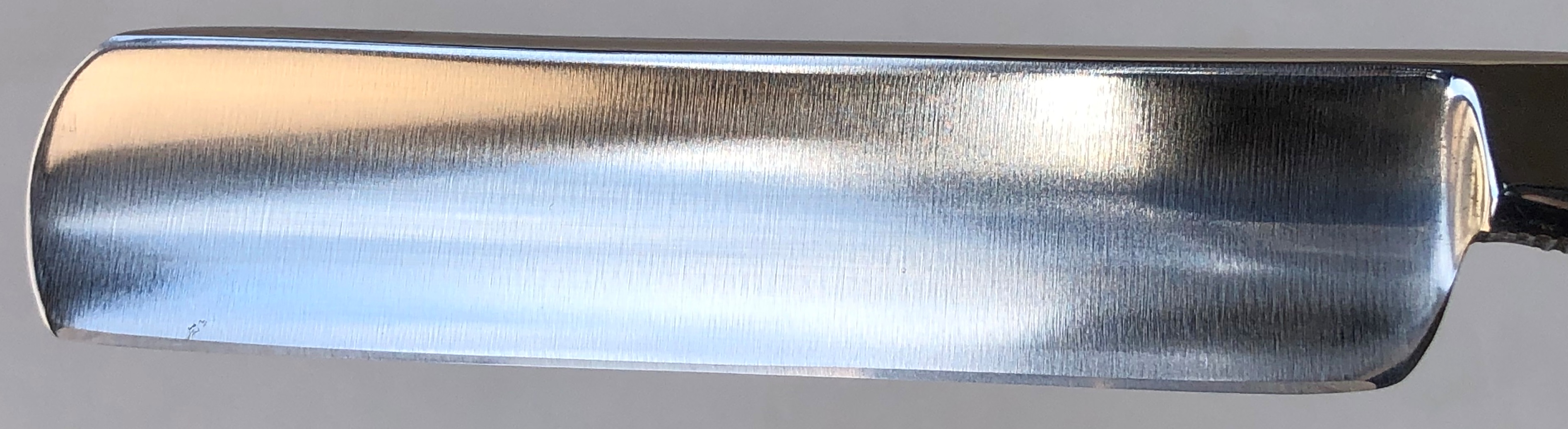 Бритва в пользовании не была, но нуждалась в чистке и полировке. Небольшое количество "следов времени" осталось, но никоим образом не повлияют на дальнейшую эксплуатацию.Комбинированная продольно-поперечная шлифовка.Новые втулки и внутренние шайбы. Идеальная геометрия полотна:кромочка равномерна по всей длине и еле заметна.