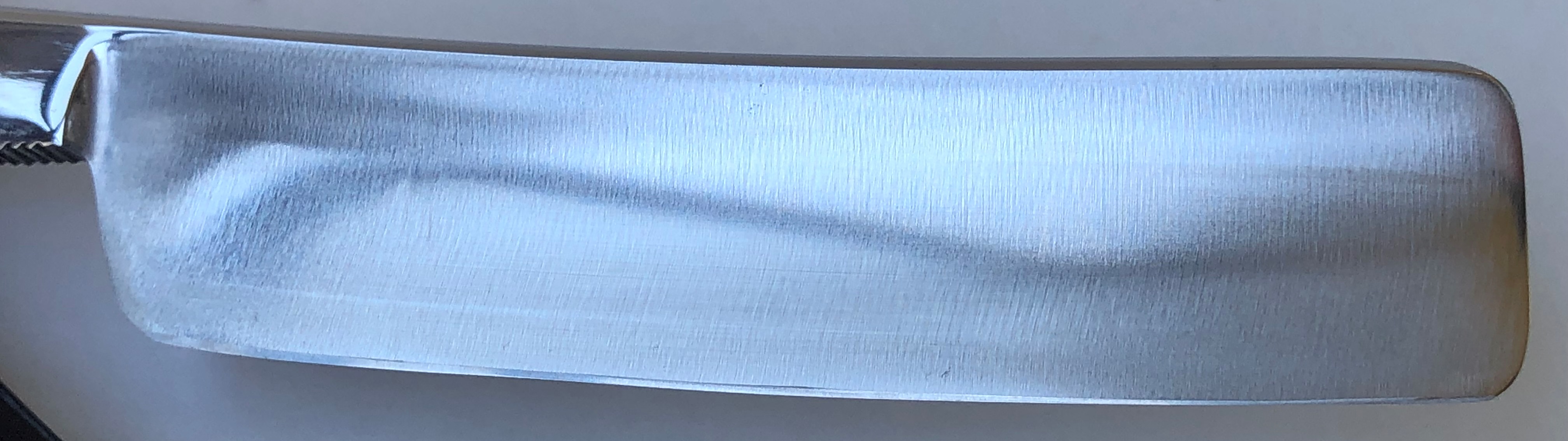Бритва в пользовании не была, но нуждалась в чистке и полировке. Небольшое количество "следов времени" осталось, но никоим образом не повлияют на дальнейшую эксплуатацию.Комбинированная продольно-поперечная шлифовка.Новые втулки и внутренние шайбы. Идеальная геометрия полотна:кромочка равномерна по всей длине и еле заметна.