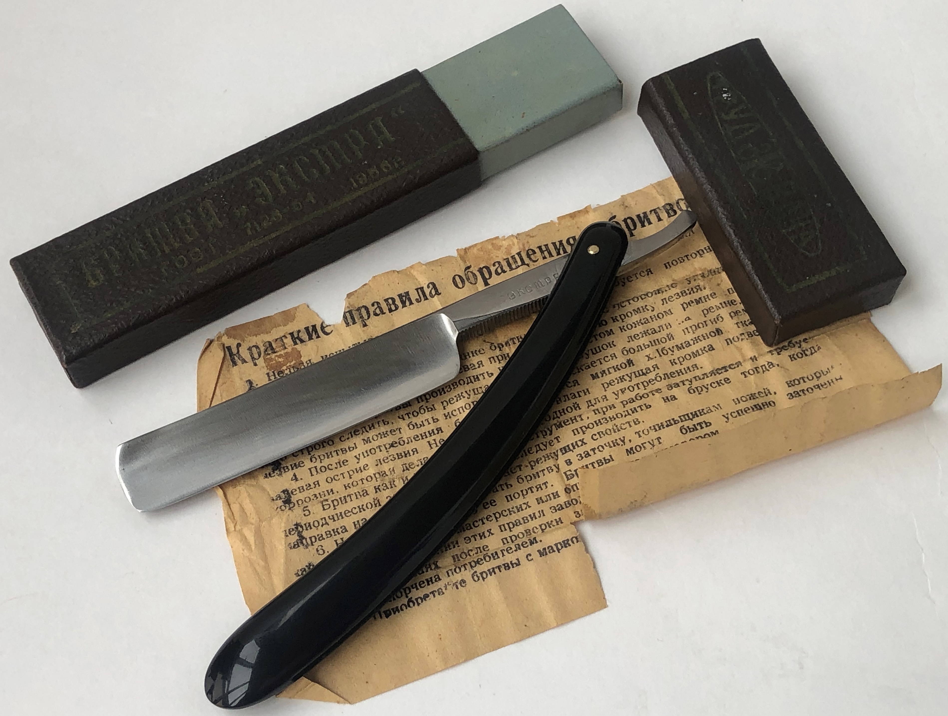 Бритва непользованная.Ничего не разбиралось и не ремонтировалось. Все в оригинале.Немного в ручную полирнул полотно от древней патины.Заточена впервые. Идеальная геометрия клинка:кромочка равномерна по всей длине. Следы от электро-химической заточки имеет место быть тоже.Коробочка хоть и родная, но немного потрепанная. Очень удобная бритва для новичка.