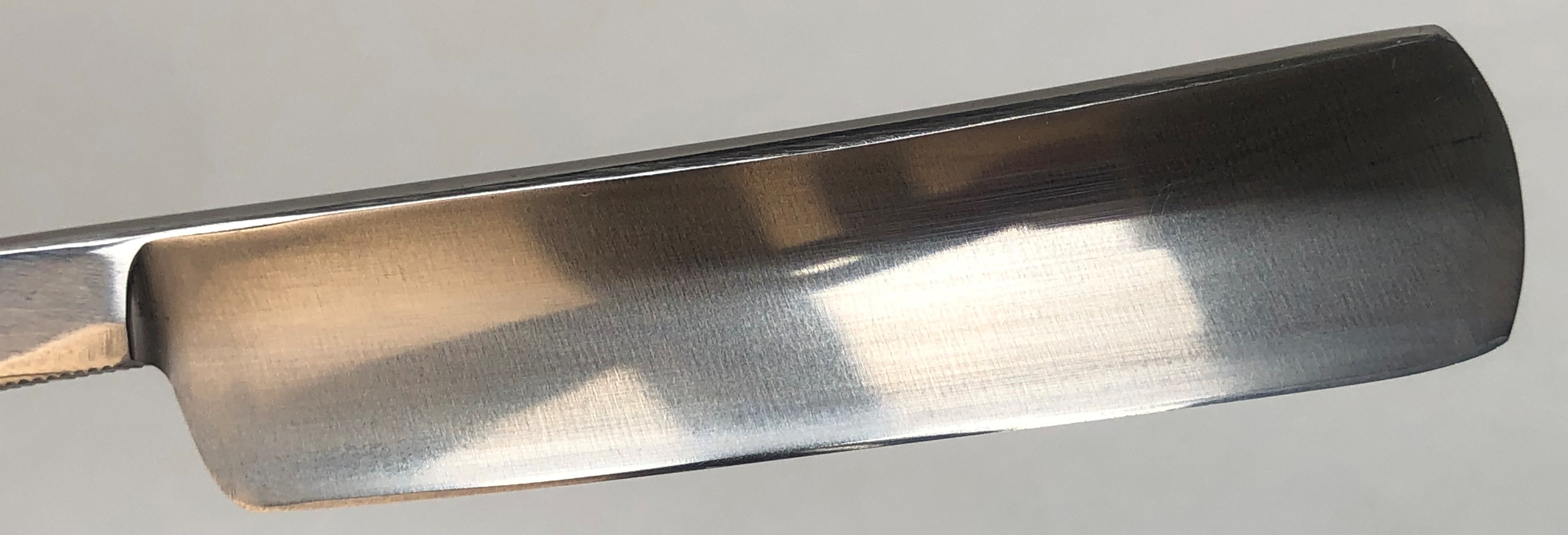 Бритва в пользовании не была, но нуждалась в чистке и полировке. Небольшое количество "следов времени" осталось, но никоим образом не повлияют на дальнейшую эксплуатацию.Комбинированная продольно-поперечная шлифовка.Новые втулки и внутренние шайбы. Идеальная геометрия полотна:кромочка равномерна по всей длине и еле заметна.