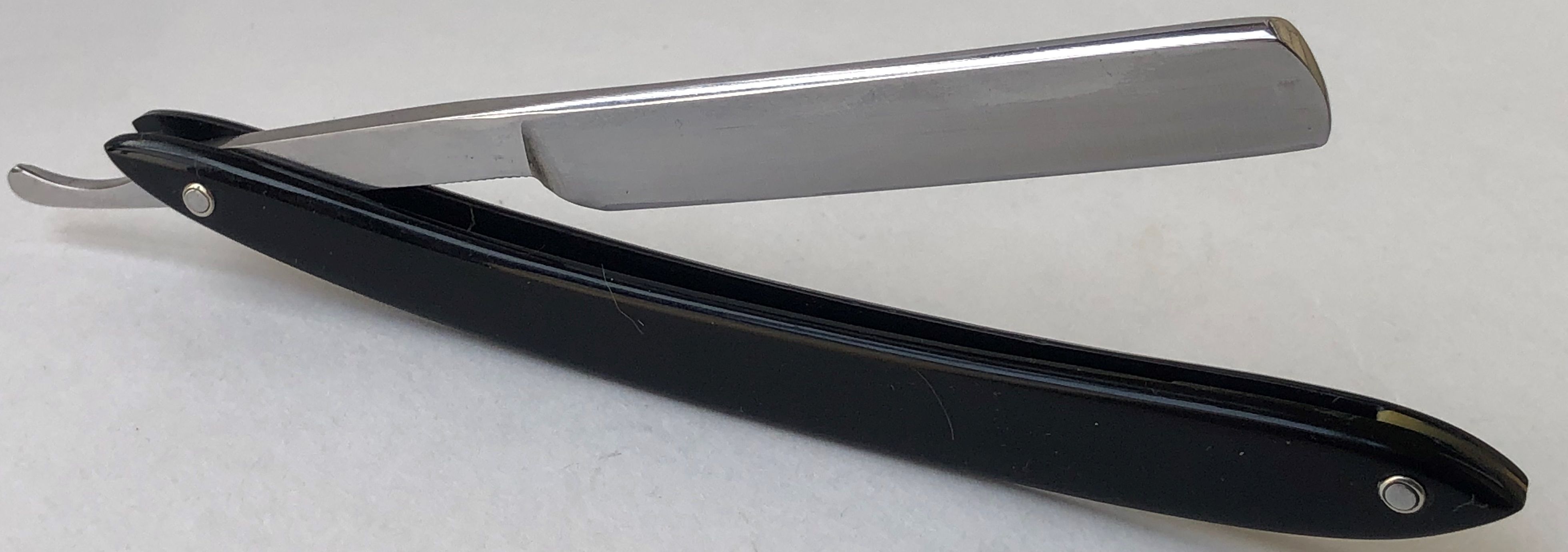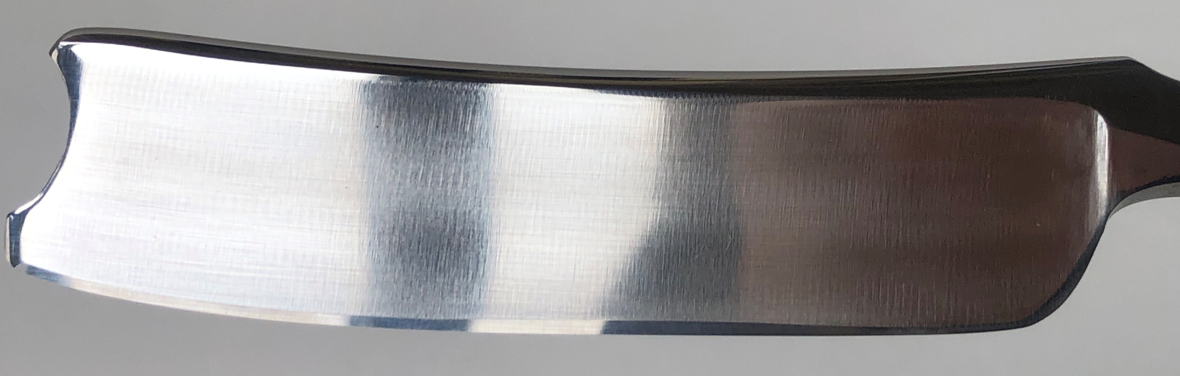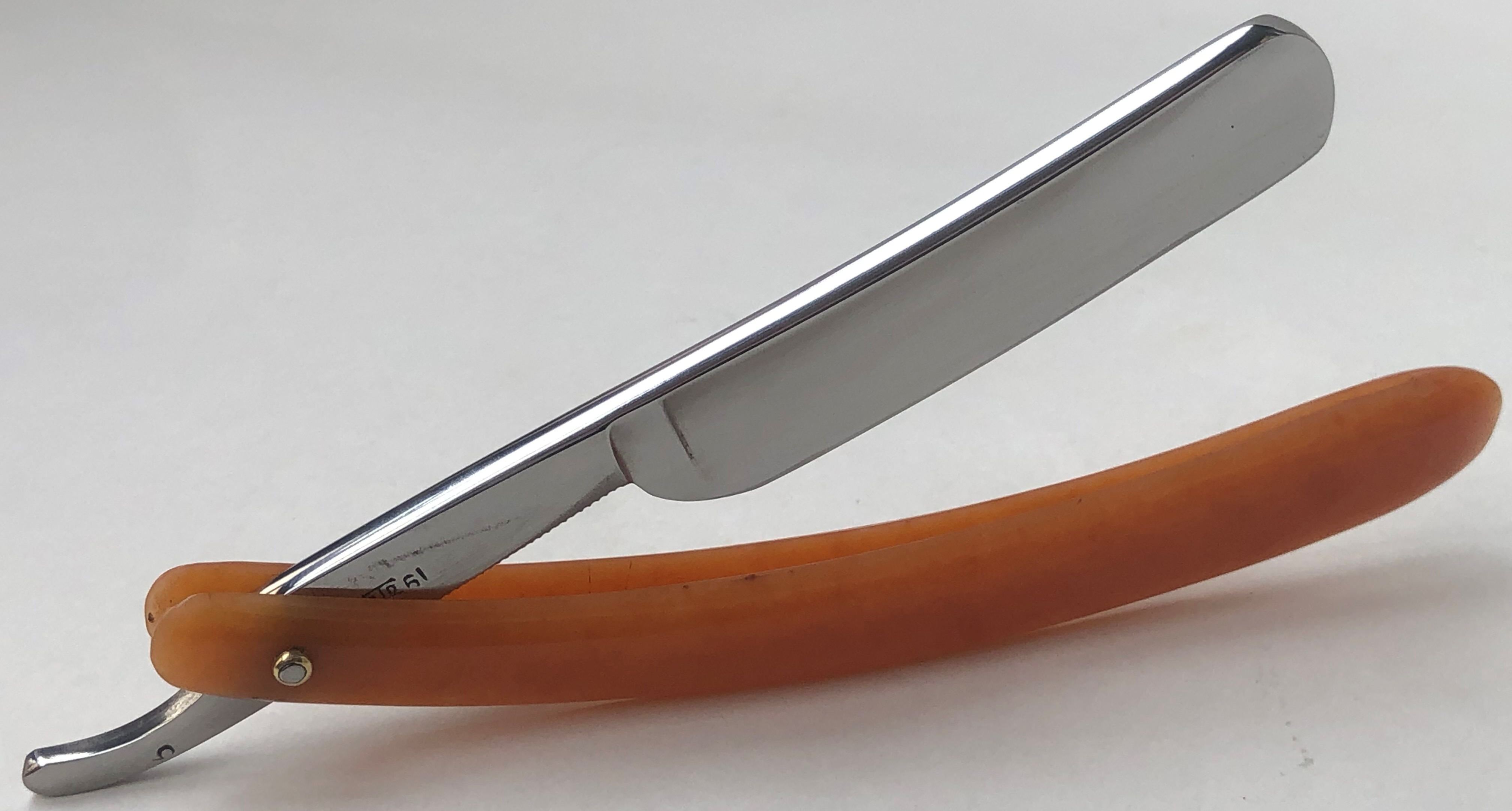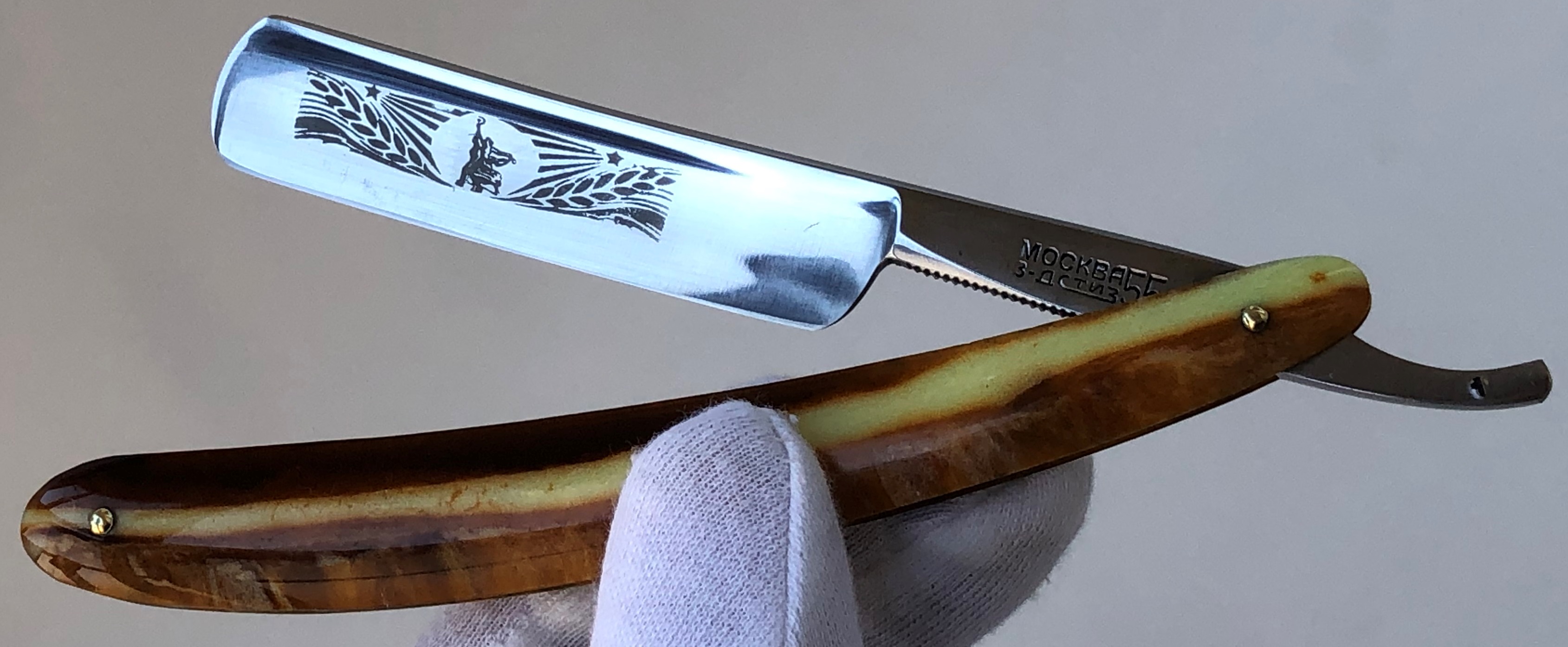 Бритва в пользовании не была, но требовала минимальных, косметических работ.Была разобрана-собрана,с освежением клинка до былого блеска и добавлением внутренних шайб.Попробовал повторить "заводской" гринд полотна.Кромочка равномерна по всей длине.