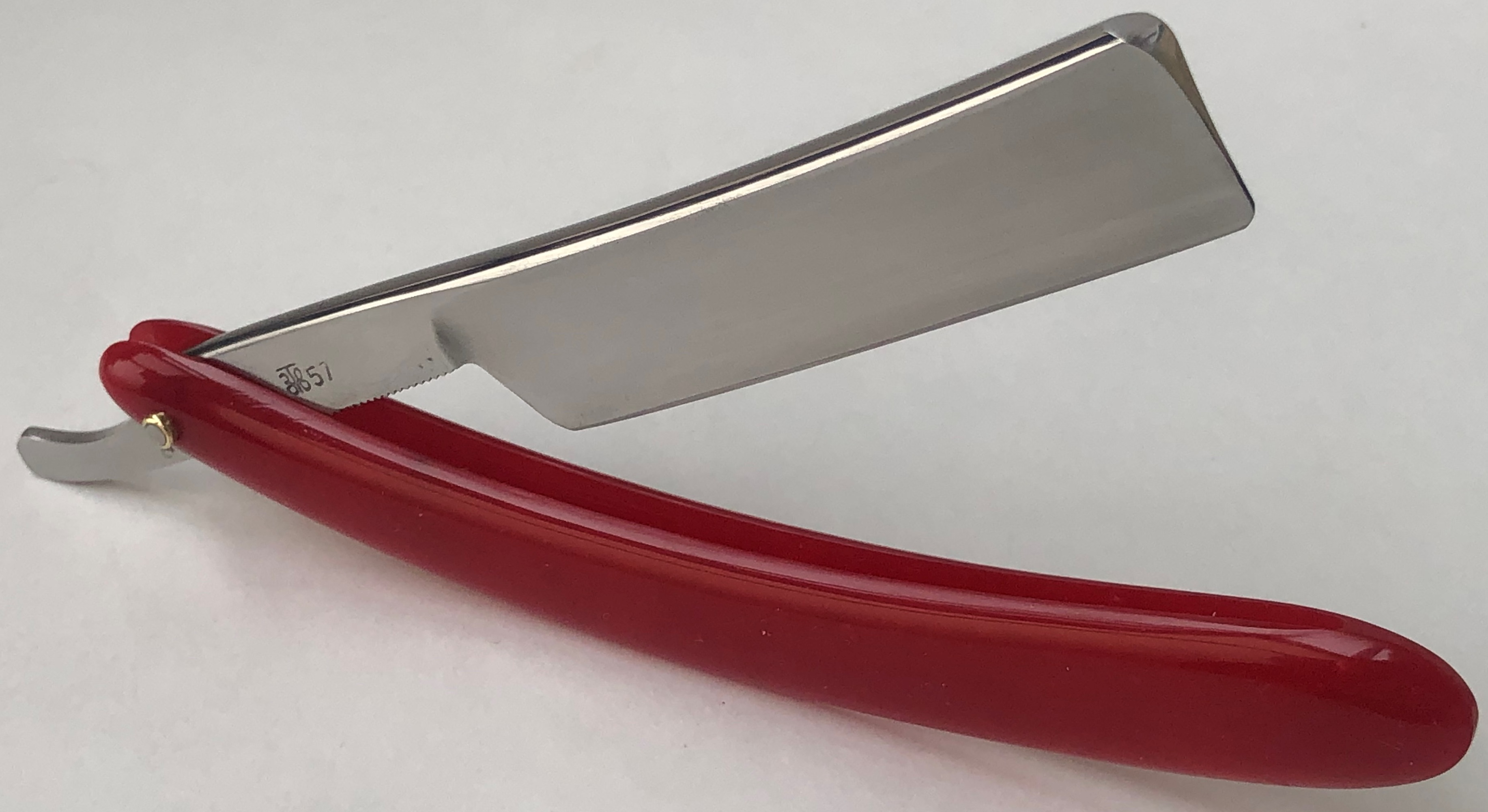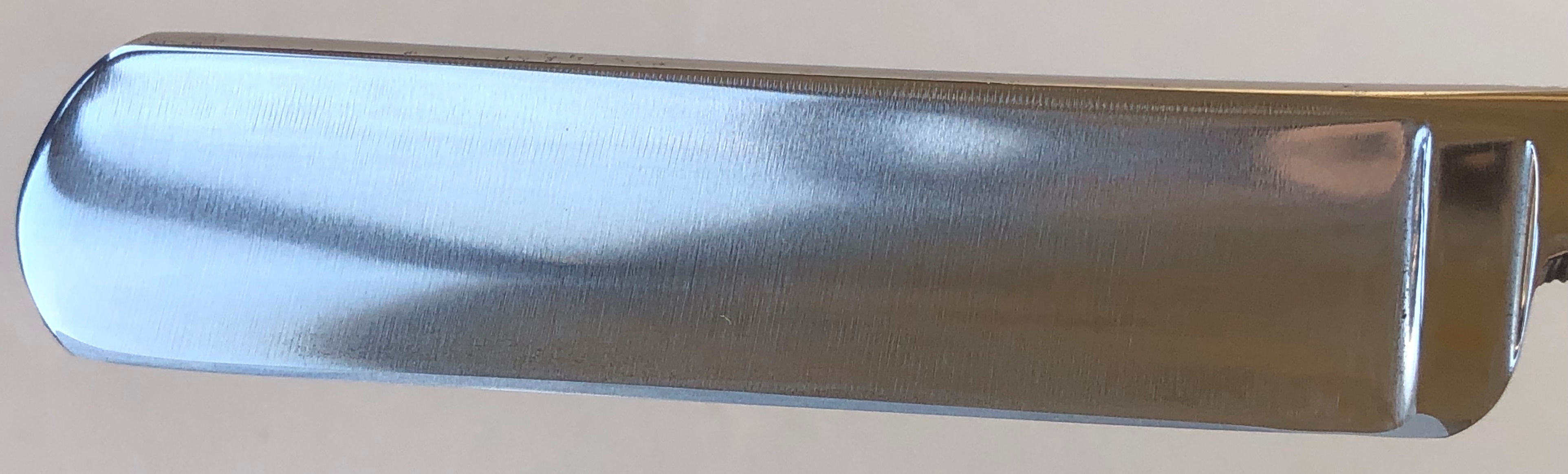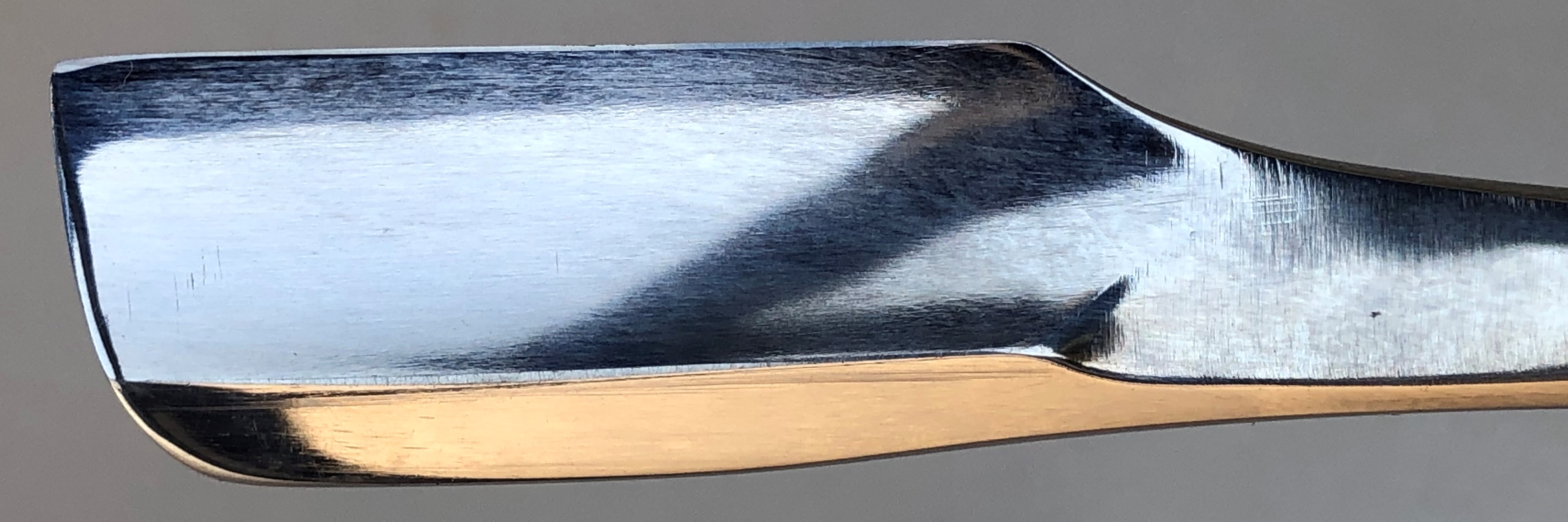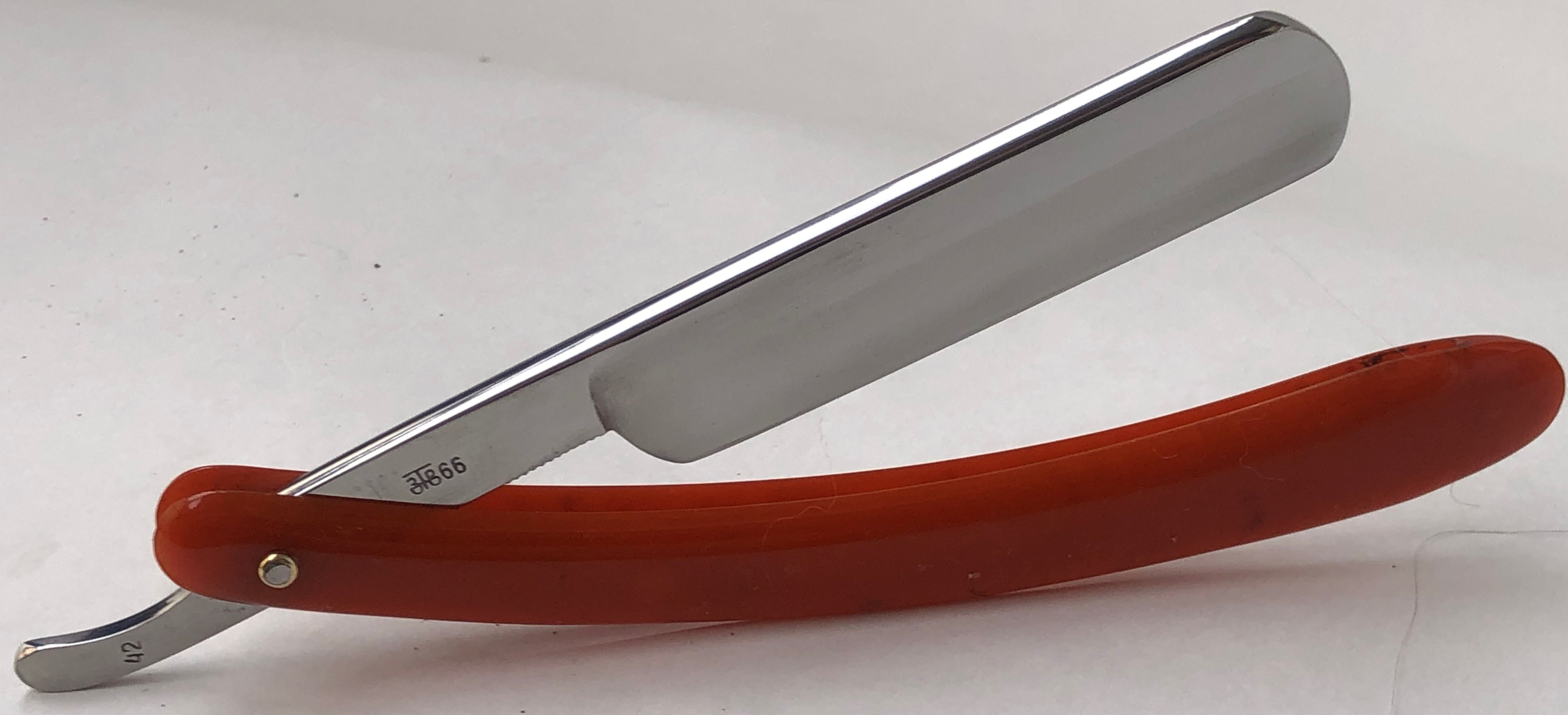 Бритва в пользовании не была, но требовала минимальных, косметических работ.Была разобрана-собрана,с освежением клинка до былого блеска и добавлением внутренних шайб.Попробовал повторить "заводской" гринд полотна.Кромочка равномерна по всей длине.