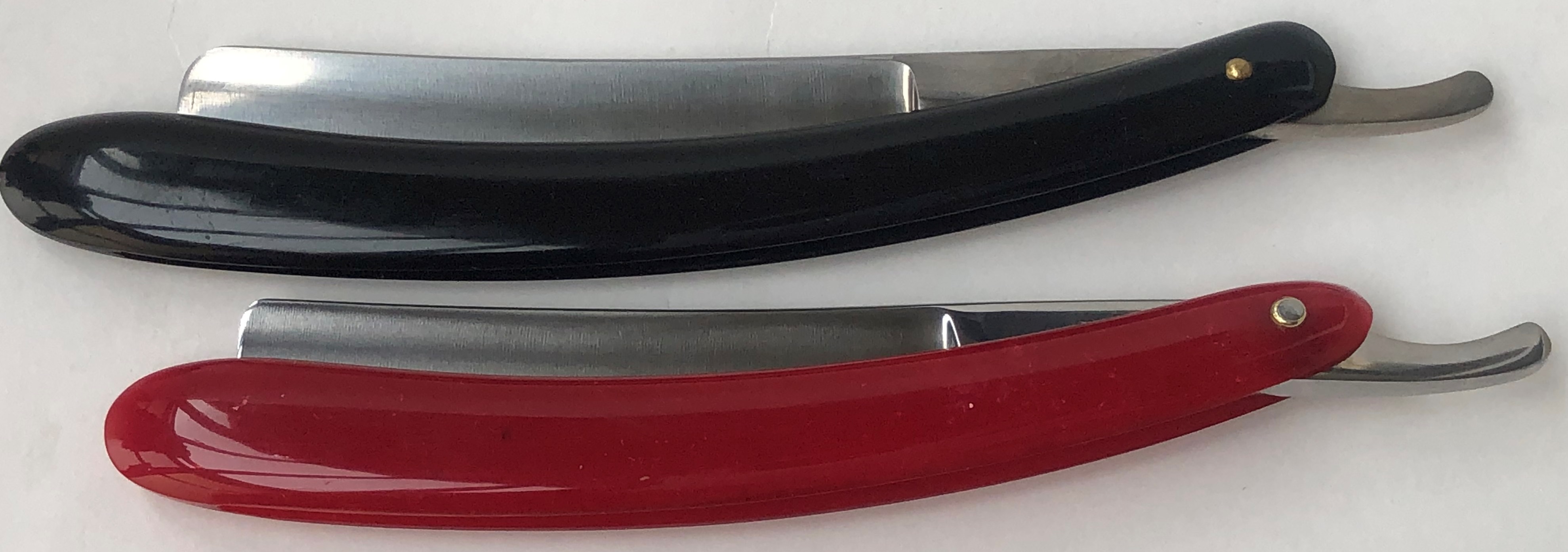 На первых двух удалось сохранить оригинальные пины и поставить заново. Добавил внутренние шайбы.Умеренная шлифовка и полировка.Кромочки ровненькие по всей длине.Очень хороши для коррекции усов и бороды, а также для бритья опытным товарищам. Будут до конца заточены и доведены до рабочего состояния.