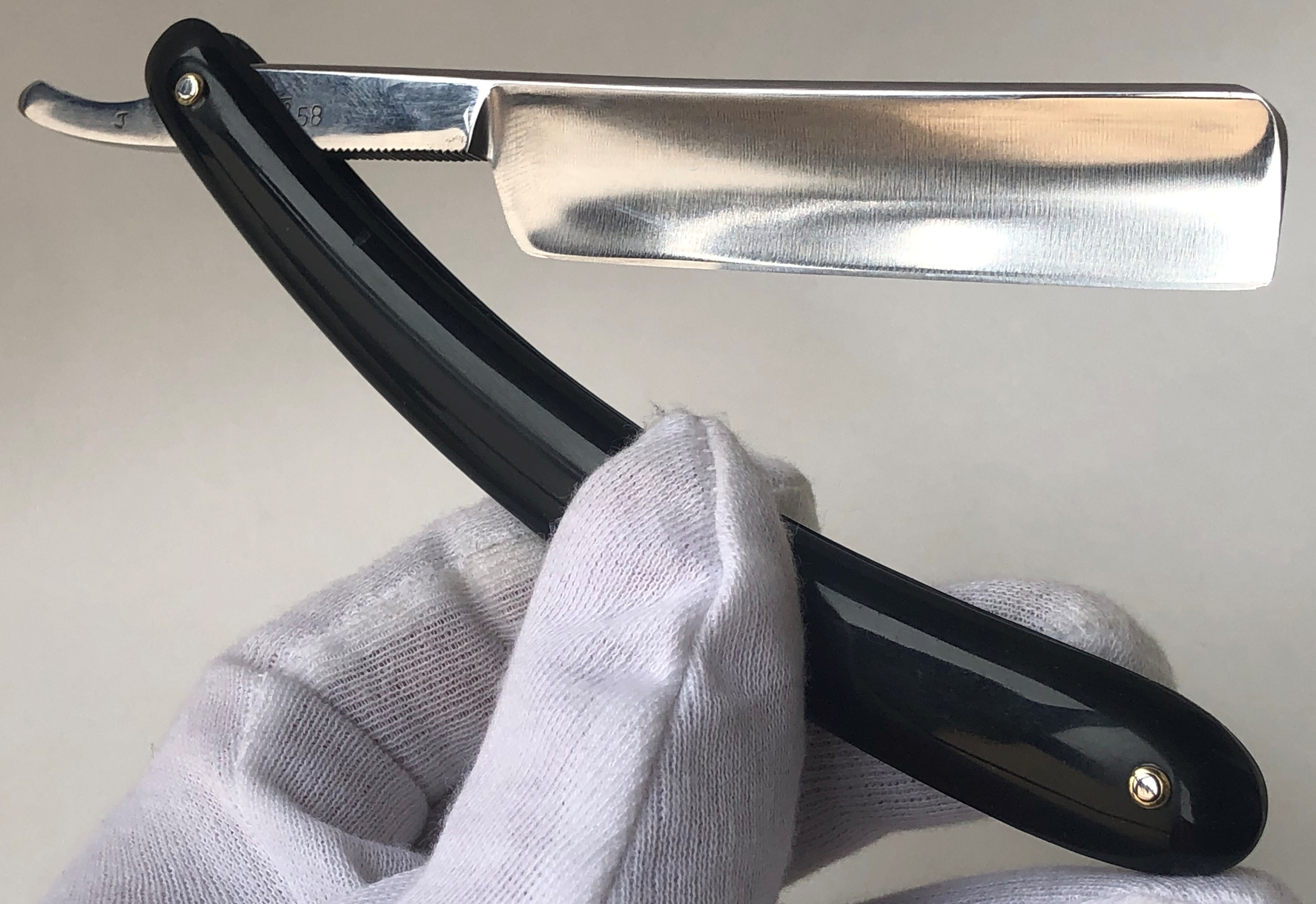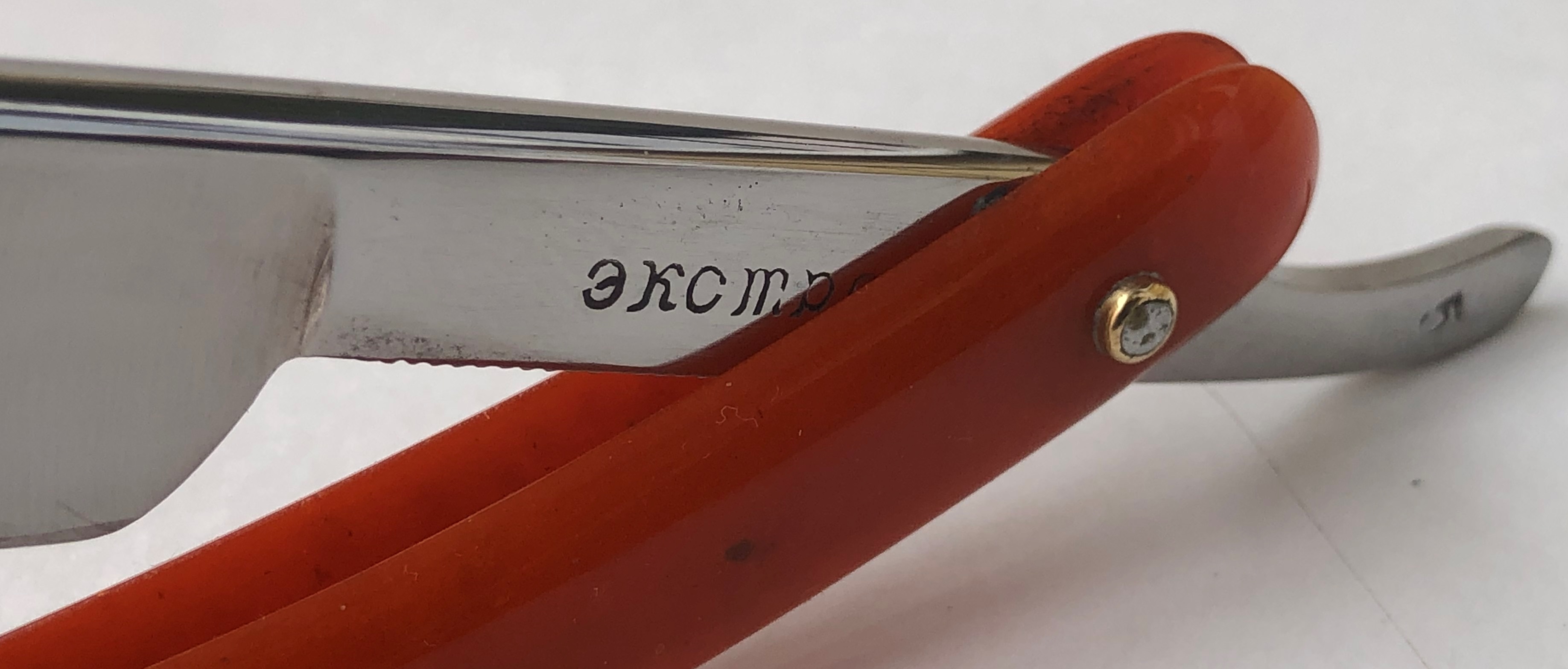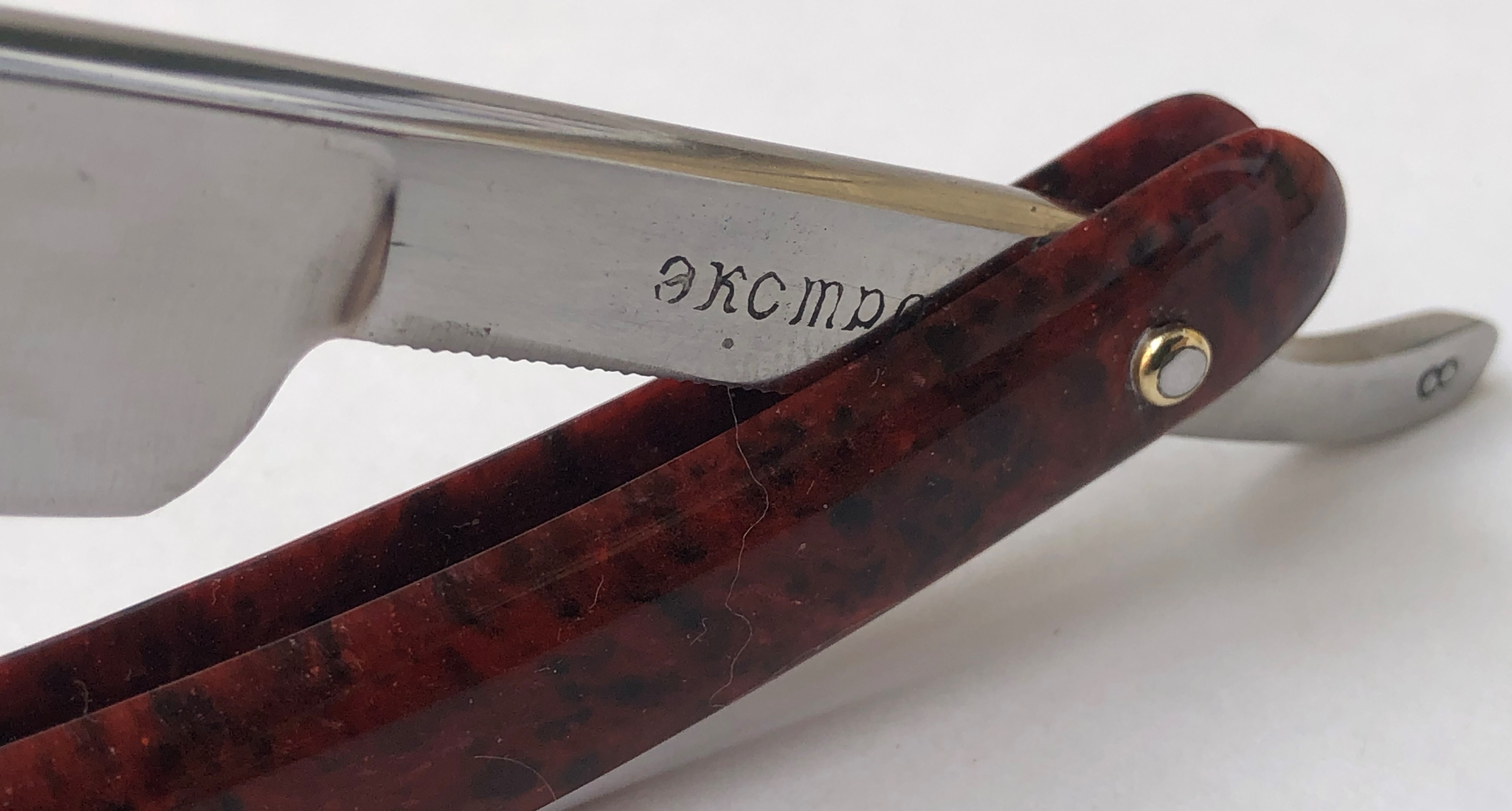 Бритва в пользовании не была, но требовала минимальных, косметических работ.Была разобрана-собрана,с освежением клинка до былого блеска и добавлением внутренних шайб.Попробовал повторить "заводской" гринд полотна.Кромочка равномерна по всей длине.