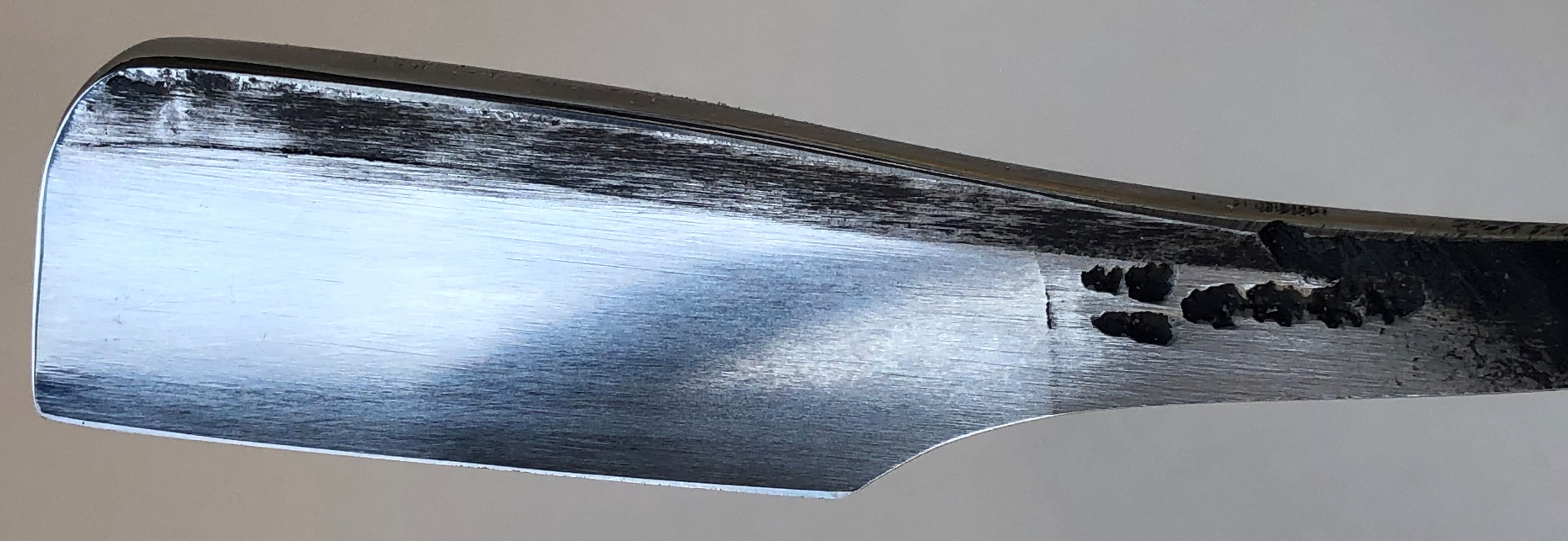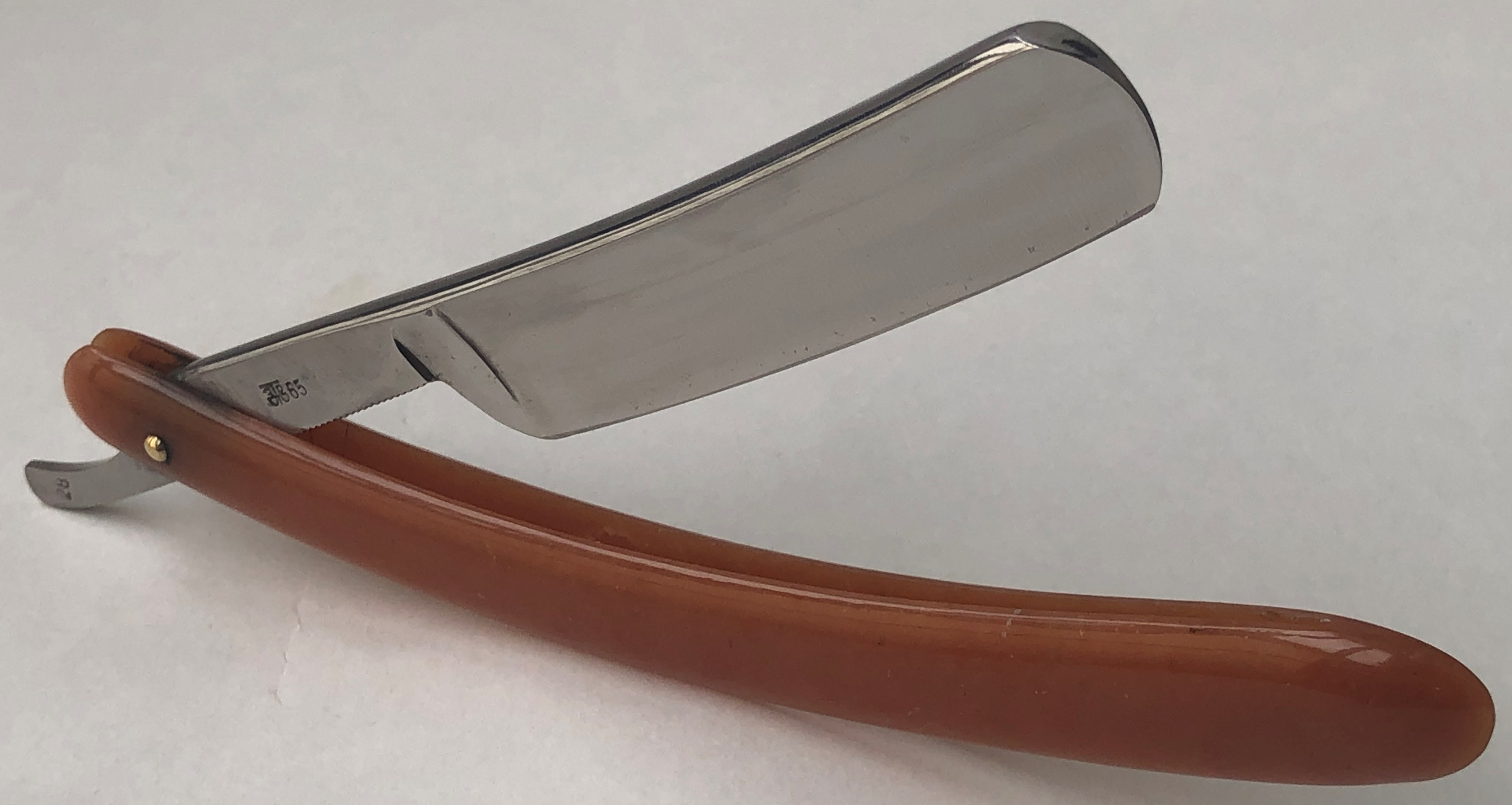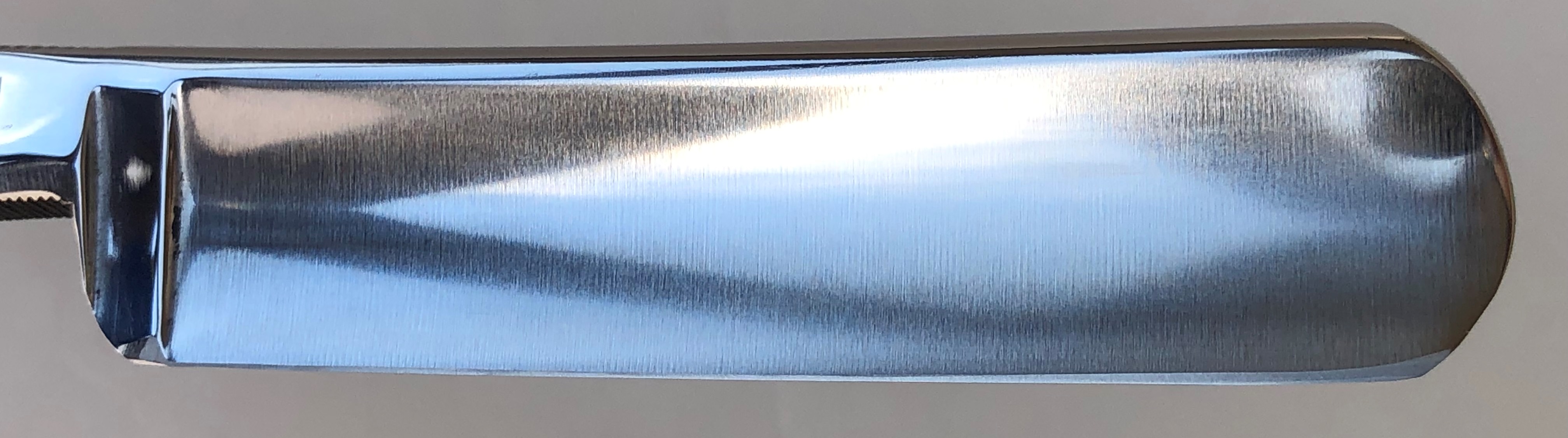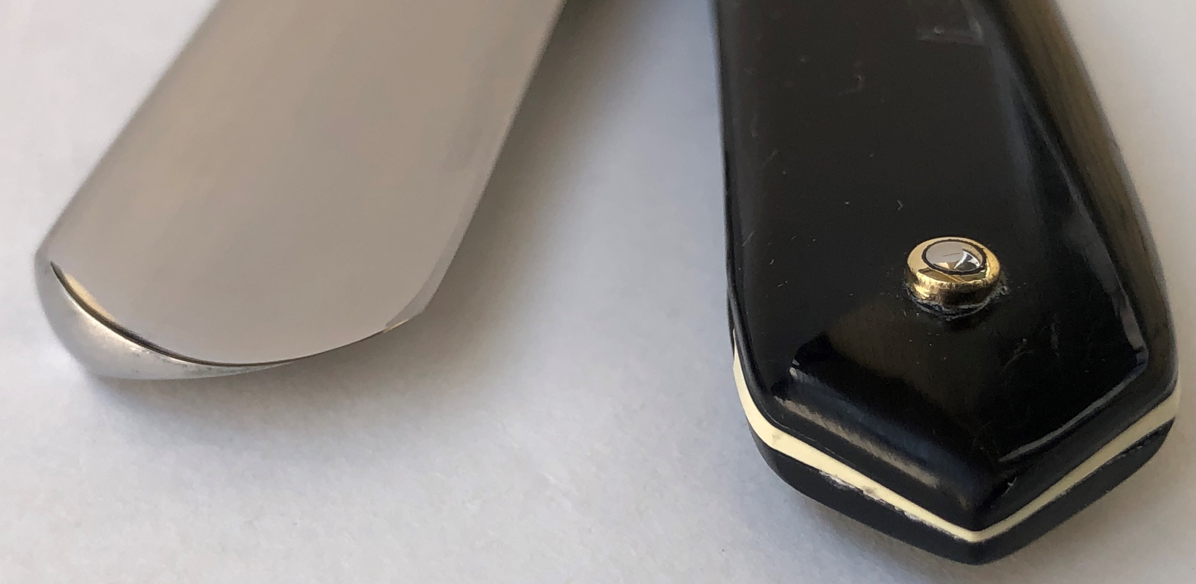 Бритва в пользовании не была, но требовала минимальных, косметических работ.Была разобрана-собрана,с освежением клинка до былого блеска и добавлением внутренних шайб.Попробовал повторить "заводской" гринд полотна.Кромочка равномерна по всей длине.